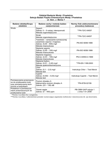 Oddział Badania Wody i Powietrza Sekcja Badań Fizyko-Chemicznych Wody i Powietrza ul. Gen. J. Bema 7 Badane obiekty/Grupa obiektów Woda Badane cechy i metody badawcze/pomiarowe Zapach Zakres: 0 – 5 rodzaj, intensywność Metoda organoleptyczna Smak Metoda organoleptyczna Twardość – oznaczanie sumarycznej zawartości wapnia i magnezu Zakres: (5,00 – 600) mg/l Metoda miareczkowa Stężenie wapnia Zakres: (2,00 – 100) mg/l Metoda miareczkowa Stężenie magnezu Zakres: (2,43 – 100) mg/l Metoda miareczkowa Stężenie fosforu Zakres: (0,01 – 0,40) mg/l Metoda spektrofotometryczna Chlor Zakres: (0,1 – 2,0) mg/l Metoda test Cyjanki Zakres: (0,002 – 0,03) mg/l Metoda test Normy i/lub udokumentowane procedury badawcze **PN-72/C-04557 **PN-72/C-04557 PN-ISO 6059:1999 PN-ISO 6058:1999 PN-C-04554-4:1999 **PN-EN 1189:2000 Instrukcja Chlor – Test Merck Instrukcja Cyjanki – Test Merck Pomieszczenia przeznaczoPoziom dźwięku A ne do przebywania ludzi Maksymalny poziom dźwięku A *PN-87/B-02156 oraz pomieszczenia techZakres: (23 – 136) dB niczne w budynkach Powietrze w pomieszczeTlenek węgla PB-OBW-04/P edycja 1 niach przeznaczonych do Zakres: (0 – 400) ppm z dnia 7.01.2008 przebywania ludzi *Norma wycofana bez zastąpienia. **Norma wycofana. Laboratorium posiada wystarczające argumenty techniczne i merytoryczne do jej stosowania. Oddział Badania Wody i Powietrza Sekcja Badań Biologicznych Wody ul. Gen. J. Bema 40 Badane obiekty/Grupa obiekBadane cechy i metody badawtów cze/pomiarowe Woda Liczba przetrwalników beztlenowców redukujących siarczyny (Clostridia) Zakres: Od 1jtk/50ml Metoda filtracji membranowej Liczba gronkowców koagulazododatnich Zakres: Od 1jtk/100ml Metoda filtracji membranowej Liczba bakterii Clostridium perfringens (łącznie z przetrwalnikami) Zakres: Od 1 jtk/100ml Metoda filtracji membranowej Normy i/lub udokumentowane procedury badawcze PN-EN 26461-2:2001 PN-Z-11001-3:2000 Rozporządzenie Ministra Zdrowia z dnia 13 listopada 2015 r. (Dz.U. z 2015 r. poz. 1989, załącznik 10B) Oddział Badania Żywności Sekcja Badań Mikrobiologicznych Żywności ul. Gen. J. Bema 40 Badane obiekty / grupy obiektów Piwo Żywność Badane cechy i metody badawcze/pomiarowe Obecność bakterii z grupy coli w 10ml, 1ml, 0,1ml Obecność Yersinia enterocolitica w określonej ilości produktu Metoda jakościowa Obecność bakterii z grupy coli Normy i/lub udokumentowane procedury badawcze PN-A-79033:1985* Obecność Enterobacteriaceae w określonej ilości produktu Metoda jakościowa Liczba drożdży i pleśni w produktach o aktywności wody wyższej niż 0,95 Zakres: Od 1 jtk/ml; Od 10 jtk/g Metoda płytkowa (posiew powierzchniowy) Liczba drożdży i pleśni w produktach o aktywności wody niższej lub równej 0,95 Zakres: Od 1 jtk/ml; Od 10 jtk/g Metoda płytkowa (posiew powierzchniowy) Obecność Escherichia coli w określonej ilości produktu Metoda jakościowa Obecność gronkowców kaogulazododatnich (Staphylococcus aureus) w określonej ilości produktu Metoda jakościowa PN-ISO 21528-1:2005 PN-EN ISO 10273:2005 + Ap1:2005 + Ap2:2006 PN-ISO 4831:2007 PN-ISO 21527-1:2009 PN-ISO 21527-2:2009 PN-ISO 7251:2006 PN-EN ISO 6888-3:2004/AC:2005 *Norma wycofana. Laboratorium posiada wystarczające argumenty techniczne i merytoryczne do jej stosowania. Oddział Badania Żywności Sekcja Badań Fizyko-Chemicznych Żywności ul. Gen. J. Bema 40 Badane obiekty / grupy obiektów Owoce, warzywa i ich przetwory Mięso i przetwory mięsne Mleko, przetwory mleczne Wyroby spirytusowe Destylat rolniczy i alkohol etylowy rolniczy Żywność Badane cechy i metody badawcze/pomiarowe Zawartość azotanów i azotynów Zakres: (5,0-5000)mg NO3 - /kg (0,25-50) mg NO2 /kg Metoda spektrofotometryczna Zawartość azotanów i azotynów Zakres: (15 - 300) mg NaNO3 /kg (2,5 – 200) mg NaNO2 /kg Metoda spektrofotometryczna Zawartość azotanów(V) i azotanów(III) Zakres: (2,0-1000) mg NaNO3 /kg (0,2-10) mg NaNO2 /kg Metoda spektrofotometryczna Zawartość alkoholu metylowego Zakres 0,01 do 0,15 (g/100ml spirytusu 100%) Oznaczanie mocy Metoda: przy użyciu alkoholomierza Normy i/lub udokumentowane procedury badawcze PN-A-75112:1992* Zawartość arsenu Zakres: 0,06 -1,25 mg/kg Metoda absorpcyjnej spektrometrii atomowej z generowaniem wodorków PN-EN 14546:2005 PB-OBŻ-04/CH Edycja 1 z dnia 03.01.2007 r. PN-EN ISO 14673-1: 2004 PB-OBŻ-07/CH edycja 1 dnia 5.01.2011r PN-A-79528-3:2007 *Norma wycofana. Laboratorium posiada wystarczające argumenty techniczne i merytoryczne do jej stosowania. Oddział Badania Środowiska Pracy ul. Gen. J. Bema 7 Badane obiekty / grupy obiektów Środowisko pracy - powietrze Środowisko pracy – mikroklimat zimny Badane cechy i metody badawcze/pomiarowe Oznaczenie wolnej krystalicznej krzemionki w pyle całkowitym i respirabilnym. Zakres: (0,15 % – 100% )SiO2 w próbce pyłu; Metoda spektrofotometryczna Pomiar stężeń: 3 Ditlenek siarki – zakres (0 – 400) mg/m 3 Tlenek azotu - zakres (0 – 1250) mg/m Tlenek węgla – zakres (0 – 1740) mg/m3 Metoda bezpośrednia Stężenie wodorotlenku sodu. Zakres: (0,12 – 2) mg/m3 Metoda spektrofotometryczna Stężenie kwasu siarkowego. 3 Zakres: (0,2 – 10) mg/m Metoda spektrofotometryczna Stężenie chlorowodoru : Zakres: (0,75 – 12,5) mg/m3 Metoda spektrofotometryczna Stężenie związków organicznych: − octan etylu; − alkohol etylowy; − octan butylu; − butan-2-on; − heksan; − 2-metylopentan; − 3-metylopentan; − pentan; − benzyna ekstrakcyjna; − benzyna do lakierów; − nafta; 3 Zakres: (0,1 – 650) mg/m − tetrachloroeten – zakres (0,07 – 210) mg/m3 − epoksyetan – zakres (0,003 – 7,2) mg/m3 Metoda chromatografii gazowej z detekcją płomieniowo-jonizacyjną (GC-FID) Stężenie związków chemicznych pobranych na wskaźniki rurkowe: 3 Ditlenek węgla - zakres: (0 – 3000) mg/m 3 Ozon - zakres: (0 – 0,20) mg/m Siarkowodór - zakres: (0 – 20) mg/m3 Ditlenek azotu- zakres: (