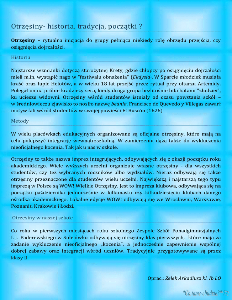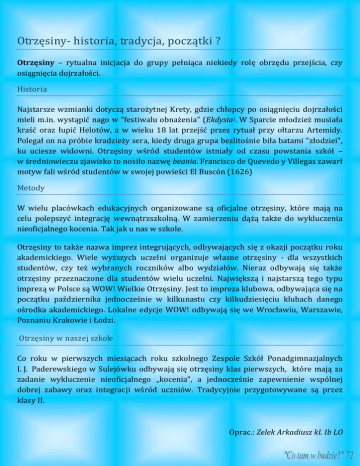 Otrzęsiny- historia, tradycja, początki ? Otrzęsiny – rytualna inicjacja do grupy pełniąca niekiedy rolę obrzędu przejścia, czy osiągnięcia dojrzałości. Historia Najstarsze wzmianki dotyczą starożytnej Krety, gdzie chłopcy po osiągnięciu dojrzałości mieli m.in. wystąpić nago w "festiwalu obnażenia" (Ekdysia). W Sparcie młodzież musiała kraść oraz łupić Helotów, a w wieku 18 lat przejść przez rytuał przy ołtarzu Artemidy. Polegał on na próbie kradzieży sera, kiedy druga grupa bezlitośnie biła batami "złodziei", ku uciesze widowni. Otrzęsiny wśród studentów istniały od czasu powstania szkół – w średniowieczu zjawisko to nosiło nazwę beania. Francisco de Quevedo y Villegas zawarł motyw fali wśród studentów w swojej powieści El Buscón (1626) Metody W wielu placówkach edukacyjnych organizowane są oficjalne otrzęsiny, które mają na celu polepszyć integrację wewnątrzszkolną. W zamierzeniu dążą także do wykluczenia nieoficjalnego kocenia. Tak jak u nas w szkole. Otrzęsiny to także nazwa imprez integrujących, odbywających się z okazji początku roku akademickiego. Wiele wyższych uczelni organizuje własne otrzęsiny - dla wszystkich studentów, czy też wybranych roczników albo wydziałów. Nieraz odbywają się także otrzęsiny przeznaczone dla studentów wielu uczelni. Największą i najstarszą tego typu imprezą w Polsce są WOW! Wielkie Otrzęsiny. Jest to impreza klubowa, odbywająca się na początku października jednocześnie w kilkunastu czy kilkudziesięciu klubach danego ośrodka akademickiego. Lokalne edycje WOW! odbywają się we Wrocławiu, Warszawie, Poznaniu Krakowie i Łodzi. Otrzęsiny w naszej szkole Co roku w pierwszych miesiącach roku szkolnego Zespole Szkół Ponadgimnazjalnych I. J. Paderewskiego w Sulejówku odbywają się otrzęsiny klas pierwszych, które mają za zadanie wykluczenie nieoficjalnego „kocenia”, a jednocześnie zapewnienie wspólnej dobrej zabawy oraz integracji wśród uczniów. Tradycyjnie przygotowywane są przez klasy II. Oprac.: Zelek Arkadiusz kl. Ib LO