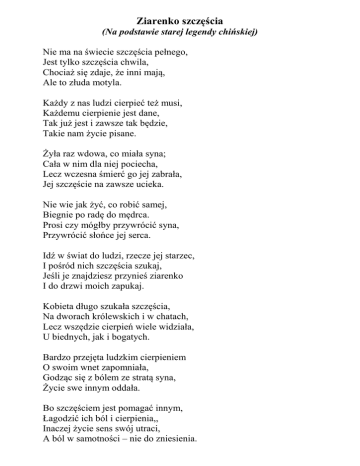 Ziarenko szczęścia (Na podstawie starej legendy chińskiej) Nie ma na świecie szczęścia pełnego, Jest tylko szczęścia chwila, Chociaż się zdaje, że inni mają, Ale to złuda motyla. Każdy z nas ludzi cierpieć też musi, Każdemu cierpienie jest dane, Tak już jest i zawsze tak będzie, Takie nam życie pisane. Żyła raz wdowa, co miała syna; Cała w nim dla niej pociecha, Lecz wczesna śmierć go jej zabrała, Jej szczęście na zawsze ucieka. Nie wie jak żyć, co robić samej, Biegnie po radę do mędrca. Prosi czy mógłby przywrócić syna, Przywrócić słońce jej serca. Idź w świat do ludzi, rzecze jej starzec, I pośród nich szczęścia szukaj, Jeśli je znajdziesz przynieś ziarenko I do drzwi moich zapukaj. Kobieta długo szukała szczęścia, Na dworach królewskich i w chatach, Lecz wszędzie cierpień wiele widziała, U biednych, jak i bogatych. Bardzo przejęta ludzkim cierpieniem O swoim wnet zapomniała, Godząc się z bólem ze stratą syna, Życie swe innym oddała. Bo szczęściem jest pomagać innym, Łagodzić ich ból i cierpienia,, Inaczej życie sens swój utraci, A ból w samotności – nie do zniesienia.