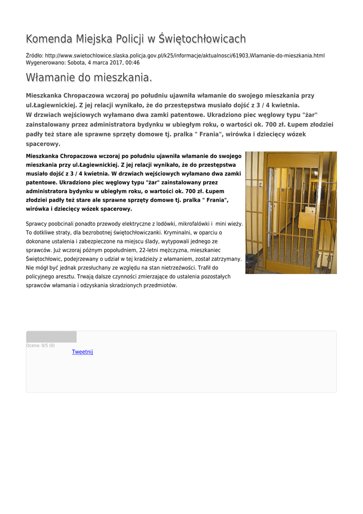 Komenda Miejska Policji w Świętochłowicach Źródło: http://www.swietochlowice.slaska.policja.gov.pl/k25/informacje/aktualnosci/61903,Wlamanie-do-mieszkania.html Wygenerowano: Sobota, 4 marca 2017, 00:46 Włamanie do mieszkania. Mieszkanka Chropaczowa wczoraj po południu ujawniła włamanie do swojego mieszkania przy ul.Łagiewnickiej. Z jej relacji wynikało, że do przestępstwa musiało dojść z 3 / 4 kwietnia. W drzwiach wejściowych wyłamano dwa zamki patentowe. Ukradziono piec węglowy typu "żar" zainstalowany przez administratora bydynku w ubiegłym roku, o wartości ok. 700 zł. Łupem złodziei padły też stare ale sprawne sprzęty domowe tj. pralka " Frania", wirówka i dziecięcy wózek spacerowy. Mieszkanka Chropaczowa wczoraj po południu ujawniła włamanie do swojego mieszkania przy ul.Łagiewnickiej. Z jej relacji wynikało, że do przestępstwa musiało dojść z 3 / 4 kwietnia. W drzwiach wejściowych wyłamano dwa zamki patentowe. Ukradziono piec węglowy typu "żar" zainstalowany przez administratora bydynku w ubiegłym roku, o wartości ok. 700 zł. Łupem złodziei padły też stare ale sprawne sprzęty domowe tj. pralka " Frania", wirówka i dziecięcy wózek spacerowy. Sprawcy poobcinali ponadto przewody elektryczne z lodówki, mikrofalówki i mini wieży. To dotkliwe straty, dla bezrobotnej świętochłowiczanki. Kryminalni, w oparciu o dokonane ustalenia i zabezpieczone na miejscu ślady, wytypowali jednego ze sprawców. Już wczoraj póżnym popołudniem, 22-letni mężczyzna, mieszkaniec Świętochłowic, podejrzewany o udział w tej kradzieży z włamaniem, został zatrzymany. Nie mógł być jednak przesłuchany ze względu na stan nietrzeźwości. Trafił do policyjnego aresztu. Trwają dalsze czynności zmierzające do ustalenia pozostałych sprawców włamania i odzyskania skradzionych przedmiotów. Ocena: 0/5 (0) Tweetnij