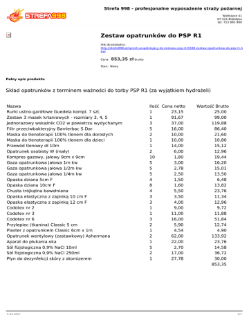 Strefa 998 - profesjonalne wyposażenie straży pożarnej Wietszyce 41 67-221 Białołęka tel: 723 895 900 Zestaw opatrunków do PSP R1 link do produktu: http://strefa998.pl/sprzet-uzupelniajacy-do-zestawu-psp-r1/1590-zestaw-opatrunkow-do-psp-r1.h tml Cena: 853,35 zł brutto Stan: Nowy Pełny opis produktu Skład opatrunków z terminem ważności do torby PSP R1 (za wyjątkiem hydrożeli) Nazwa Rurki ustno-gardłowe Guedela kompl. 7 szt. Zestaw 3 masek krtaniowych - rozmiary 3, 4, 5 Jednorazowy wskaźnik CO2 w powietrzu wydychanym Filtr przeciwbakteryjny Barrierbac S Dar Maska do tlenoterapii 100% tlenem dla dorosłych Maska do tlenoterapii 100% tlenem dla dzieci Przewód tlenowy dł 10m Opatrunek osobisty W (mały) Kompres gazowy, jałowy 9cm x 9cm Gaza opatrunkowa jałowa 1m kw Gaza opatrunkowa jałowa 1/2m kw Gaza opatrunkowa jałowa 1/4m kw Opaska dziana 5cm F Opaska dziana 10cm F Chusta trójkątna bawełniana Opaska elastyczna z zapinką 10 cm F Opaska elastyczna z zapinką 12 cm F Codotex nr 2 Codotex nr 3 Codotex nr 6 Przylepiec (tkanina) Classic 5 cm Plaster z opatrunkiem Classic 6cm x 1m Opatrunek wentylowy (zastawkowy) Ashermana Aparat do płukania oka Sól fizjologiczna 0,9% NaCl 10ml Sól fizjologiczna 0,9% NaCl 250ml Płyn do dezynfekcji skóry z atomizerem 3-03-2017 Ilość Cena netto 1 23,15 1 91,67 3 37,00 5 16,00 2 10,00 1 10,00 1 14,00 2 6,00 10 1,80 5 3,00 5 2,78 5 2,50 4 1,50 8 1,60 4 5,50 3 3,50 3 4,00 1 9,00 1 11,00 3 16,00 2 5,90 1 4,54 2 62,00 1 22,00 5 2,70 2 17,00 1 27,78 Wartość Brutto 25,00 99,00 119,88 86,40 21,60 10,80 15,12 12,96 19,44 16,20 15,01 13,50 6,48 13,82 23,76 11,34 12,96 9,72 11,88 51,84 12,74 4,90 133,92 23,76 14,58 36,72 30,00 853,35 1/1