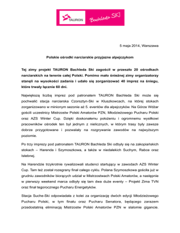 ! ! ! ! ! ! 5 maja 2014, Warszawa Polskie ośrodki narciarskie przyjazne alpejczykom Tej zimy projekt TAURON Bachleda Ski zagościł w przeszło 20 ośrodkach narciarskich na terenie całej Polski. Pomimo mało śnieżnej zimy organizatorzy stanęli na wysokości zadania i udało się zorganizować 40 imprez na śniegu, które trwały łącznie 60 dni. Największą liczbą imprez pod patronatem TAURON Bachleda Ski może się pochwalić stacja narciarska Czorsztyn-Ski w Kluszkowcach, na której stokach zorganizowano w minionym sezonie aż 5. eventów dla alpejczyków. Na Górze Wdżar gościli uczestnicy Mistrzostw Polski Amatorów PZN, Młodzieżowego Pucharu Polski oraz AZS Winter Cup. Dzięki doskonałemu położeniu i ogromnemu wysiłkowi pracowników ośrodek ten był jednym z nielicznych, w którym trasy były zawsze dobrze przygotowane i pozwalały na rozgrywanie zawodów na najwyższym poziomie. Po trzy imprezy pod patronatem TAURON Bachleda Ski odbyły się na zakopiańskich stokach – Harenda i Szymoszkowa, a także w niedalekich Suchym, Rabce oraz Istebnej. Na Harendzie trzykrotnie rywalizowali studenci startujący w zawodach AZS Winter Cup. Tam też został rozegrany finał całego cyklu. Polana Szymoszkowa gościła już w grudniu zawodników biorących udział w Mistrzostwach Polski Amatorów, a następnie w pierwszy weekend marca odbyły się tam dwa duże eventy – Projekt Zima TVN oraz finał tegorocznego Pucharu Energetyków. Stacja Suche-Ski odpowiadała z kolei za organizację dwóch edycji Młodzieżowego Pucharu Polski, w tym finału oraz Pucharu Senatora, będącego zarazem przedostatnią eliminacją Mistrzostw Polski Amatorów PZN w slalomie gigancie. „Tegoroczna zima nie miała wielkiego wpływu na nasz stok. Północna wystawa sprawia, że praktycznie przez cały dzień jest on zacieniony. Sami jesteśmy sportowcami, a co za tym idzie inwestycję w sport - przede wszystkim w narciarską młodzież - uważamy za klucz do sukcesu. Na stoku mamy specjalnie wydzieloną część sportową, gdzie nie tylko odbywają się zawody, ale też treningi. W przyszłym sezonie również z wielką przyjemnością zorganizujemy kolejne imprezy.” zapowiada Andrzej Zając, dyrektor stacji narciarskiej w Suchym. „Zawsze warto wspierać działania, związane z rozwojem jakiejkolwiek dyscypliny sportowej. Bo życie to ruch – a ruch, to życie. Należy pokazywać naszym dzieciom, młodzieży, że zajęcia sportowe są tak samo ważnie, jak rozwój intelektualny i emocjonalny, zdrowe odżywianie czy podstawy dobrych manier. Imprezy na stoku to nie tylko przychód w kasach biletowych, to także promocja ośrodka i okazja do integracji z klientami – również po zawodach. U nas nie brakuje wieczornych biesiad, ognisk z gitarą czy potańcówek do białego rana” - mówi Prezes Zarządu Stacji Złoty Groń w Istebnej – Aleksandra Libera-Cichy. Zapytana o to, czy w przyszłym sezonie równie chętnie zorganizują kolejne imprezy narciarskie odparła - „Kto by nie chciał sympatycznych, różowych byczków na stoku i profesjonalnej ekipy z tak szerokim wachlarzem atrakcji? Będziemy zaszczyceni i już dzisiaj serdecznie zapraszamy!” W podobnym tonie wypowiada się Joanna Horabik – Prezes Zarządu Spółki Funar, odpowiadającej za wyciąg narciarski Rabka - Polczakówka - „Współpraca przy tego rodzaju imprezach to chyba najlepsza promocja dla ośrodka. Jest swego rodzaju długoterminową reklamą, która dociera do bardzo dużego grona odbiorców. Nasz stok posiada specyficzną konfigurację, jest dość stromy, a co za tym idzie wymagający dlatego też idealnie nadaje się do rozgrywania zawodów na tyczkach. Choć miniony sezon nie był bardzo udany ze względu na małą ilość śniegu to cieszy nas, że zyskaliśmy wielu nowych klientów.” „Organizacja imprez narciarskich z punktu widzenia właściciela ośrodku przynosi same korzyści. Zawodnicy przyjeżdżają z rodzinami i znajomymi, więc nawet mimo zamknięcia połowy stoku ruch na wszystkich wyciągach jest większy. Duże wydarzenia to oczywiście dodatkowa promocja miejsca. Sport to bardzo ważny obszar naszej działalności, stąd inwestycje w specjalistyczny sprzęt, pozwalającym na przygotowanie tras na najwyższym poziomie. Z pewnością w przyszłości odbywały się będą u nas zarówno zawody dla amatorów, jak i wydarzenia na najwyższym poziomie jak Puchar Europy FIS.” - zapowiada z kolei Wojciech Strączek, Prezes Zarządu Ośrodka Narciarsko Rekreacyjnego Harenda Zakopane. „Jako alpejczyk, ale i właściciel ośrodka uważam, że wsparcie sportu i organizatorów imprez przynosi wszystkim zaangażowanym stronom bardzo duże korzyści. Czas i środki poświęcone na przygotowanie stoku w dużej mierze wynagradza promocja miejsca, a co za tym idzie dotarcie do szerszego grona narciarzy. Szczególnie tej zimy, dzięki współpracy TAURON Bachleda Ski i stacji TVN mogliśmy pokazać telewidzom, że mimo trudnych warunków jak najbardziej da się jeździć na goszczących nas stokach. Należą się ogromne podziękowania włodarzom wszystkich stacji narciarskich, które wspierają i we własnym zakresie organizują rożne imprezy. Cieszy mnie to, że każdego roku odbywa się coraz więcej zawodów, które służą promocji narciarstwa alpejskiego i aktywnego wypoczynku.” - dodaje Andrzej Bachleda Curuś, pomysłodawca całego projektu i gospodarz stacji Siepraw Ski, gdzie odbył się uwielbiany przez najmłodszych narciarzy Puchar Tauronka. W sumie w minionym sezonie w projekcie TAURON Bachleda Ski wzięło udział przeszło 20 ośrodków narciarskich. Dzięki zaangażowaniu ich właścicieli i pracowników udało się zorganizować 40 imprez dla narciarzy w każdym wieku i na każdym poziomie zaawansowania. Mimo, że zima w Polsce nie obfitowała w opady śniegu narciarskich emocji z pewnością na stokach nie brakowało. Relacje z zawodów oraz więcej informacji na temat projektu TAU