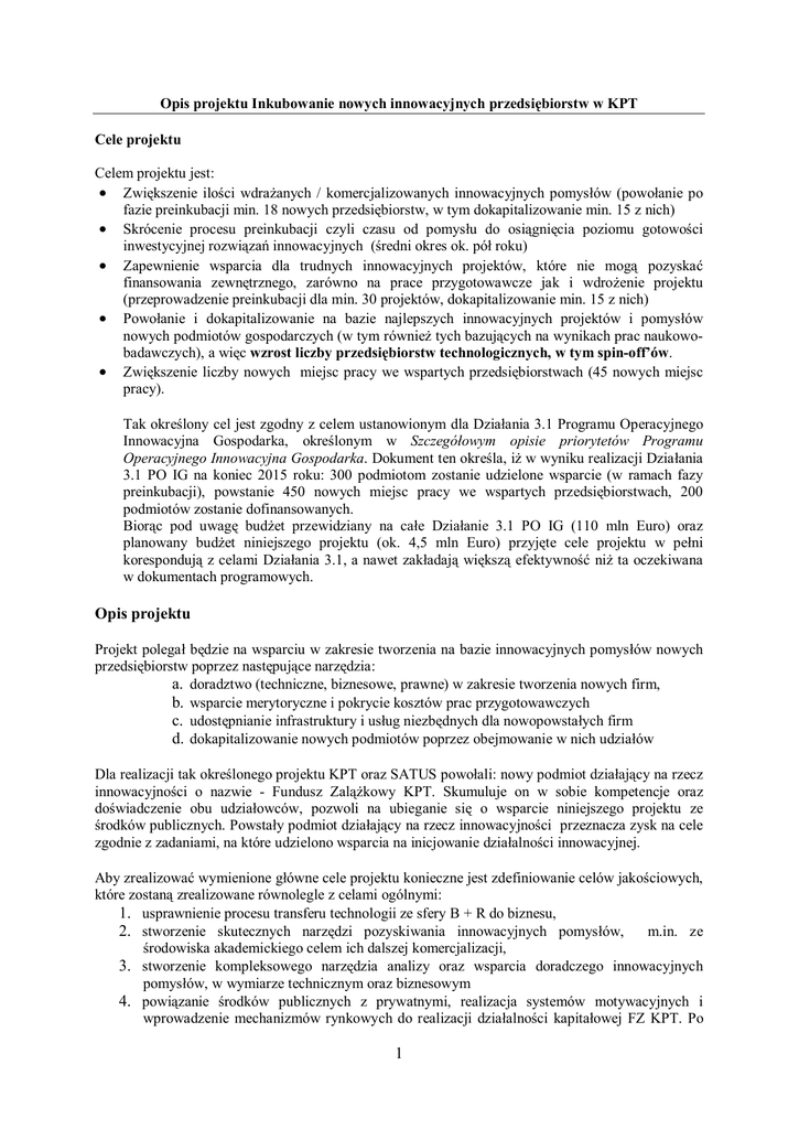 Opis projektu Inkubowanie nowych innowacyjnych przedsi biorstw w KPT Cele projektu Celem projektu jest: Zwi kszenie ilo ci wdra anych / komercjalizowanych innowacyjnych pomys ów (powo anie po fazie preinkubacji min. 18 nowych przedsi biorstw, w tym dokapitalizowanie min. 15 z nich) Skrócenie procesu preinkubacji czyli czasu od pomys u do osi gni cia poziomu gotowo ci inwestycyjnej rozwi za innowacyjnych ( redni okres ok. pó roku) Zapewnienie wsparcia dla trudnych innowacyjnych projektów, które nie mog pozyska finansowania zewn trznego, zarówno na prace przygotowawcze jak i wdro enie projektu (przeprowadzenie preinkubacji dla min. 30 projektów, dokapitalizowanie min. 15 z nich) Powo anie i dokapitalizowanie na bazie najlepszych innowacyjnych projektów i pomys ów nowych podmiotów gospodarczych (w tym równie tych bazuj cych na wynikach prac naukowobadawczych), a wi c wzrost liczby przedsi biorstw technologicznych, w tym spin-off’ów. Zwi kszenie liczby nowych miejsc pracy we wspartych przedsi biorstwach (45 nowych miejsc pracy). Tak okre lony cel jest zgodny z celem ustanowionym dla Dzia ania 3.1 Programu Operacyjnego Innowacyjna Gospodarka, okre lonym w Szczegó owym opisie priorytetów Programu Operacyjnego Innowacyjna Gospodarka. Dokument ten okre la, i w wyniku realizacji Dzia ania 3.1 PO IG na koniec 2015 roku: 300 podmiotom zostanie udzielone wsparcie (w ramach fazy preinkubacji), powstanie 450 nowych miejsc pracy we wspartych przedsi biorstwach, 200 podmiotów zostanie dofinansowanych. Bior c pod uwag bud et przewidziany na ca e Dzia anie 3.1 PO IG (110 mln Euro) oraz planowany bud et niniejszego projektu (ok. 4,5 mln Euro) przyj te cele projektu w pe ni koresponduj z celami Dzia ania 3.1, a nawet zak adaj wi ksz efektywno ni ta oczekiwana w dokumentach programowych. Opis projektu Projekt polega b dzie na wsparciu w zakresie tworzenia na bazie innowacyjnych pomys ów nowych przedsi biorstw poprzez nast puj ce narz dzia: a. doradztwo (techniczne, biznesowe, prawne) w zakresie tworzenia nowych firm, b. wsparcie merytoryczne i pokrycie kosztów prac przygotowawczych c. udost pnianie infrastruktury i us ug niezb dnych dla nowopowsta ych firm d. dokapitalizowanie nowych podmiotów poprzez obejmowanie w nich udzia ów Dla realizacji tak okre lonego projektu KPT oraz SATUS powo ali: nowy podmiot dzia aj cy na rzecz innowacyjno ci o nazwie - Fundusz Zal kowy KPT. Skumuluje on w sobie kompetencje oraz do wiadczenie obu udzia owców, pozwoli na ubieganie si o wsparcie niniejszego projektu ze rodków publicznych. Powsta y podmiot dzia aj cy na rzecz innowacyjno ci przeznacza zysk na cele zgodnie z zadaniami, na które udzielono wsparcia na inicjowanie dzia alno ci innowacyjnej. Aby zrealizowa wymienione g ówne cele projektu konieczne jest zdefiniowanie celów jako ciowych, które zostan zrealizowane równolegle z celami ogólnymi: 1. usprawnienie procesu transferu technologii ze sfery B + R do biznesu, 2. stworzenie skutecznych narz dzi pozyskiwania innowacyjnych pomys ów, m.in. ze rodowiska akademickiego celem ich dalszej komercjalizacji, 3. stworzenie kompleksowego narz dzia analizy oraz wsparcia doradczego innowacyjnych pomys ów, w wymiarze technicznym oraz biznesowym 4. powi zanie rodków publicznych z prywatnymi, realizacja systemów motywacyjnych i wprowadzenie mechanizmów rynkowych do realizacji dzia alno ci kapita owej FZ KPT. Po 1 okresie realizacji projektu FZ KPT b dzie spó o wysokich kompetencjach w zakresie: wy aniania najlepszych pomys ów innowacyjnych, oceny inwestycji, realizacji prac przygotowawczych, realizacji wej kapita owych o wysokiej warto ci merytorycznej. 5. wykszta cenie zespo u specjalistów o wysokich kompetencjach w tworzeniu i wspieraniu innowacyjnych spó ek 6. uzyskanie samofinansowania przez FZ KPT po realizacji projektu, 7. stworzenie warunków do reinwestowania zysków z dokonanych inwestycji kapita owych w kolejne projekty inwestycyjne, Dzi ki po czeniu w ramach jednego podmiotu – Funduszu Zal kowego KPT, kompetencji i do wiadczenia KPT oraz SATUS oraz dzi ki otrzymaniu dofinansowania na realizacj niniejszego projektu mo liwe b dzie kompleksowe wsparcie doradcze i finansowe projektodawców od pomys u, poprzez faz preinkubacji, do powo ania spó ki, jej dokapitalizowania oraz wdro enia biznesowego projektu. Równolegle dzi ki powi zaniu rodków publicznych (FZ KPT) z prywatnymi (SATUS) mo liwy dzie efektywny monitoring inwestycji i powi kszanie warto ci spó ki wraz z podnoszeniem warto ci funduszu SATUS. Opis grupy docelowej projektu: Szczególnie wa nym elementem projektu jest grupa docelowa projektu (odbiorcy us ug), która aktualnie znajduje si w obszarze luki finansowej w finansowaniu inwestycji. Grup docelow (odbiorc us ug) b pomys odawcy posiadaj cy innowacyjny projekt / pomys , o wysokim potencjale wzrostu. Wnioskodawca zak ada, e znaczna cz projektów b dzie bazowa a na wynikach prac naukowo-badawczych, w zwi zku z tym dzia ania promocyjne FZ KPT jak i samo poszukiwanie projektów zostanie mocno skoncentrowane na rodowiskach akademickich, w tym na 3 uczelniach krakowskich, b cych udzia owcami KPT. Opis dzia w projekcie: Dzia ania w projekcie – faza preinkubacji oraz inwestycji b schematu: realizowane wg nast puj cego FAZA PREINKUBACJI – sk adaj ca si z 3 etapów oraz 3 punktów oceny (tzw. filtrów), decyduj cych o odrzuceniu projektu lub zakwalifikowaniu do dalszych prac 1 etap: Nabór projektów 1. Wyszukiwanie innowacyjnych projektów / pomys ów 2. Ocena pozyskanych projektów / pomys ów, wraz z decyzj o zakwalifikowaniu projektu do 2. Etapu (tzw. pierwszy filtr) 2 etap: Przygotowanie i weryfikacja wst pnego biznes planu 1. Wsparcie wnioskodawcy w zakresie przygotowania wst pnego biznes planu 2. Ocena projektów na podstawie wst pnych biznes planów oraz wybór projektów do dalszych prac przygotowawczych (tzw. drugi filtr) 3. Negocjacje i podpisanie warunkowych umów inwestycyjnych 3 etap: Finalizacja preinkubacji – re