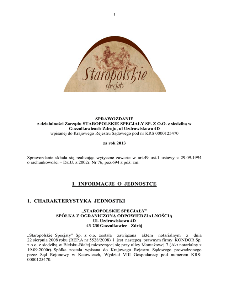 1 SPRAWOZDANIE z działalności Zarządu STAROPOLSKIE SPECJAŁY SP. Z O.O. z siedzibą w Goczałkowicach-Zdroju, ul Uzdrowiskowa 4D wpisanej do Krajowego Rejestru Sądowego pod nr KRS 0000125470 za rok 2013 Sprawozdanie składa się realizując wytyczne zawarte w art.49 ust.1 ustawy z 29.09.1994 o rachunkowości – Dz.U. z 2002r. Nr 76, poz.694 z póź. zm. I. INFORMACJE O JEDNOSTCE 1. CHARAKTERYSTYKA JEDNOSTKI „STAROPOLSKIE SPECJAŁY” SPÓŁKA Z OGRANICZONĄ ODPOWIEDZIALNOŚCIĄ Ul. Uzdrowiskowa 4D 43-230 Goczałkowice - Zdrój „Staropolskie Specjały” Sp. z o.o. została zawiązana aktem notarialnym z dnia 22 sierpnia 2008 roku (REP.A nr 5528/2008) i jest następcą prawnym firmy KONDOR Sp. z o.o. z siedzibą w Bielsku-Białej mieszczącej się przy ulicy Montażowej 7 (Akt notarialny z 19.09.2000r). Spółka została wpisana do Krajowego Rejestru Sądowego prowadzonego przez Sąd Rejonowy w Katowicach, Wydział VIII Gospodarczy pod numerem KRS: 0000125470. 2 Historia udziałowców Spółki począwszy od roku 2008. Anna Ewa Warzecha 1.100 udziałów po 500 zł. 100% (do 16.02.2010 roku) Anna Ewa Warzecha 1.090 udziałów po 500 zł. 99% (od 17.02.2010 roku do chwili obecnej) ZPM Henryk Kania SA 10 udziałów po 500 zł 1% (od 17.02.2010 roku do 20.06.2010 roku) Grzegorz Mariusz Minczanowski 10 udziałów po 500 zł 1% (od 21.06.2010 roku do 26.09.2010 roku) Aleksandra Jadwiga Minczanowska 10 udziałów po 500 zł. 1% (od 27.09.2010 roku do 19.06.2012) Grzegorz Mariusz Minczanowski 10 udziałów po 500 zł. 1% (od 20.06.2012 roku do 13.05.2013) Na 31.12.2013 udziałowcami są: Anna Ewa Warzecha 1.090 udziałów po 500 zł. 99% (od 17.02.2010 roku) Dominika Rąba 10 udziałów po 500 zł. 1% (od 13.05.2013 roku) Zarząd Spółki : - Joanna Barbara Dziubek – Prezes Zarządu (do dnia 30.08.2010) - Ewa Barbara Łuczyk – Prezes Zarządu (od dnia 30.08.2010 do 31.08.2012) - Joanna Barbara Dziubek – Prezes Zarządu (od dnia 31.08.2012 do chwili obecnej) 2. SPRZEDAŻ Spółka z o.o. KONDOR aktem notarialnym z dnia 22.08.2008r. REP.A nr 5528/2008 została przekształcona w Spółkę działającą pod nazwą: „STAROPOLSKIE SPECJAŁY”. Celem działalności jest rozbiór i sprzedaż mięsa produkcyjnego, oraz konfekcja i sprzedaż mięsa kulinarnego. Za rok 2013r. spółka osiągnęła przychód ze sprzedaży towarów handlowych w wysokości 20.946.985,58 zł, generując stratę na sprzedaży w wysokości 324.020,10 zł. 3 3. PERSONEL Informacje o liczbie, strukturze wieku i wykształcenia zatrudnionych przedstawiono w tabelach. Liczba zatrudnionych WYSZCZEGÓLNIENIE Kobiety Mężczyźni RAZEM 2012 ROK 4 1 5 2013 ROK 5 3 8 Struktura wieku zatrudnionych WYSZCZEGÓLNIENIE Do 25 lat 26 - 30 31 - 40 41 - 50 Powyżej 50 RAZEM 2012 ROK 0 0 5 0 0 5 2013 ROK 0 0 5 3 0 8 Struktura wykształcenia zatrudnionych WYSZCZEGÓLNIENIE Podstawowe Zawodowe Średnie Wyższe RAZEM 2012 ROK 0 1 0 4 5 2013 ROK 0 1 2 5 8 4. FINANSOWANIE, DZIAŁALNOŚĆ INWESTYCYJNA Głównym bankiem obsługującym Spółkę jest PKO BP S.A. O/Bielsko-Biała, oraz ING BANK ŚLĄSKI S.A. Kapitał własny Spółki na dzień 31 grudnia 2010 roku wynosił 1.525.889,16 zł. Kapitał podstawowy Spółki na dzień 31 grudnia 2013 roku wynosił 550.000,00 zł i składa się z 1.100 udziałów o wartości 500,00 zł każdy. 4 KREDYT INWESTYCYJNY W 2011 roku w związku z realizowanym przedsięwzięciem inwestycyjnym Spółka zawarła z Bankiem ING Bank Śląski S.A umowę kredytu inwestycyjnego na kwotę 21.980.000,00 zł na finansowanie inwestycji polegającej na budowie, wyposażeniu oraz uruchomieniu Zakładu Rozbioru Mięsa wraz z magazynem wysokiego składowania . W roku 2013 Aneksem nr 7 do umowy kredytu inwestycyjnego przesunięto spłaty rat kredytowych począwszy od 31.01.2014 r. W dniu 11 lutego 2014 Aneksem nr 10 zwiększono wartość kredytu o 7.500.000,00 zł, do kwoty 29.480.000,00 zł oraz przesunięto spłatę rat kredytowych począwszy od 30.04.2014r. Nowy kredyt zostanie w całości przeznaczony na zapłacenie zobowiązań inwestycyjnych. DOTACJA W dniu 18.10.2011 spółka podpisała Umowę przyznania pomocy nr 01610-69040OR1200012/10 z Agencją Restrukturyzacji i Modernizacji Rolnictwa w ramach Programu Rozwoju Obszarów Wiejskich na lata 2007-2013 w ramach „Zwiększenia wartości dodanej podstawowej produkcji rolnej i leśnej” . Celem pomocy jest budowa , wyposażenie oraz uruchomienie Zakładu Przetwórstwa Mięsa wraz z magazynem wysokiego składowania. Agencja zobowiązała się na określonych w umowie warunkach , po złożeniu wniosku o płatność pomoc finansową w wysokości 20.000.000,00 zł. Spółka pierwszą zaliczkę wysokości 10.000.000,00 zł otrzymała w dniu 09.11.2011 r. GWARANCJA BANKOWA Warunkiem wynikającym z w/w umowy było zawarcie umowy gwarancji bankowej zwrotu zaliczki. W dniu 06.10.2011 Ing Bank Śląski S.A. wystawił gwarancję transakcji zbiorczej nr KLG/4506/-INT/11 na kwotę 11.000.000,00 zł z terminem ważności do 25 lipca 2013 r. Zmiany terminów ważności gwarancji bankowej dokonano następującymi aneksami: - Aneksem nr 1 z 10.10.2011 r zmieniono termin ważności gwarancji z dnia 6 października 2011 do dnia 25 sierpnia 2013. - Aneksem nr 2 z 09.04.2013 r zmieniono termin ważności gwarancji z dnia 25 sierpnia 2013 do dnia 25 lutego 2014. - Aneksem nr 3 z 12.11.2013 r zmieniono termin ważności gwarancji z dnia 25 lutego 2014 do dnia 31 lipca 2014. OBLIGACJE Obligacje Serii A 22 kwietnia 2013 r. Zarząd Spółki Staropolskie Specjały podjął uchwałę nr 1/04/2013 w przedmiocie emisji przez Spółkę obligacji na okaziciela serii A. 20 maja 2013 uchwałą nr 3/05/2013 Zarządu dokonano przydziału obligacji serii A. Wyemitowano 7.200,00 Obligacji serii A o łącznej wartości nominalnej 7.200.000,00 zł. 5 Obligacje zostały wyemitowane na okres 2 lat . Stawką referencyjną kuponu wypłacanego w okresie kwartalnym dla Obligatariuszy jest 3-miesięczna stopa pro