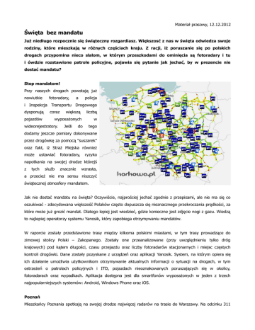 Materiał prasowy, 12.12.2012 Święta bez mandatu Już niedługo rozpocznie się świąteczny rozgardiasz. Większosć z nas w święta odwiedza swoje rodziny, które mieszkają w różnych częściach kraju. Z racji, iż poruszanie się po polskich drogach przypomina nieco slalom, w którym przeszkodami do ominięcia są fotoradary i tu i ówdzie rozstawione patrole policyjne, pojawia się pytanie jak jechać, by w prezencie nie dostać mandatu? Stop mandatom! Przy naszych drogach powstają już nowiutkie fotoradary, a policja i Inspekcja Transportu Drogowego dysponują pojazdów coraz większą liczbą wyposażonych w wideorejestratory. Jeśli do tego dodamy jeszcze pomiary dokonywane przez drogówkę za pomocą "suszarek" oraz fakt, iż Straż Miejska również może ustawiać fotoradary, ryzyko napotkania na swojej drodze którejś z tych służb znacznie wzrasta, a przecież nie ma sensu niszczyć świątecznej atmosfery mandatem. Jak nie dostać mandatu na święta? Oczywiście, najprościej jechać zgodnie z przepisami, ale nie ma się co oszukiwać - zdecydowana większość Polaków często dopuszcza się nieznacznego przekroczania prędkości, za które może już grozić mandat. Dlatego lepiej jest wiedzieć, gdzie konieczne jest zdjęcie nogi z gazu. Wiedzą to najlepiej operatorzy systemu Yanosik, który zapobiega otrzymywaniu mandatów. W raporcie zostały przedstawione trasy między kilkoma polskimi miastami, w tym trasy prowadzące do zimowej stolicy Polski – Zakopanego. Zostały one przeanalizowane (przy uwzględnieniu tylko dróg krajowych) pod kątem długości, czasu przejazdu oraz liczby fotoradarów stacjonarnych i miejsc częstych kontroli drogówki. Dane zostały pozyskane z urządzeń oraz aplikacji Yanosik. System, na którym opiera się ich działanie umożliwia użytkownikom otrzymywanie aktualnych informacji o sytuacji na drogach, w tym ostrzeżeń o patrolach policyjnych i ITD, pojazdach nieoznakowanych poruszających się w okolicy, fotoradarach oraz wypadkach. Aplikacja dostępna jest dla smartfonów wyposażonych w jeden z trzech najpopularniejszych systemów: Android, Windows Phone oraz iOS. Poznań Mieszkańcy Poznania spotkają na swojej drodze najwięcej radarów na trasie do Warszawy. Na odcinku 311 km mogą im zrobić zdjęcie 34 fotoradary, a w 17 miejscach najczęściej odbywają się kontrole policji. Na przeciwległym biegunie znajduje się trasa o długości 167 km (2h 32m) do Wrocławia. Tam na kierowców czekają tylko 3 fotoradary i 7 miejsc częstych kontroli. Inaczej sytuacja przedstawia się na trasie Poznań – Bydgoszcz (143 km) – 15 fotoradarów i 6 miejsc kontroli. Podobnie jak na drodze do Szczecina chociaż odległość jest tutaj większa – 236 km. Można spotkać na niej 14 fotoradarów i 7 miejsc, w których często dokonywane są pomiary. Warszawa Podróżujący ze stolicy najmniej fotradarów, bo tylko 4, miną jadąc do Białegostoku (192 km), więcej natomiast znajduje się na niej miejsc częstych kontroli – 20. Na 212 km trasie do Olsztyna 8 fotoradarów i dwa razy więcej miejsc kontroli. Z kolei jadący z Warszawy do Rzeszowa przejadą 295 km, a na swej drodze napotkają 21 fotoradarów i prawie tyle samo ulubionych miejsc drogówki - 19. Teoretycznie mogą więc zostać namierzeni przez radar co 15 km. Łódź Jadąc z Gdańska do Łodzi (350 km) kierowcy mogą zostać uwiecznieni na zdjęciach z fotoradaru 34 razy. Tak samo sytuacja wygląda na trasie z Łodzi do Krakowa (252 km). Średnio można więc co kilkanaście kilometrów zostać tam przyłapanym na przekroczeniu prędkości. Na tej drugiej trasie dodatkowo znajduje się nieco więcej miejsc częstych kontroli - 19. Zakopane A jak wyglądają drogi do zimowej stolicy Polski - Zakopanego? Najwięcej fotoradarów kierowcy mogą napotkać na trasie z Gdańska – 51 urządzeń. Nic w tym dziwnego, gdyż i trasa jest długa i liczy sobie 739 km. Kierowcy muszą uważać także na miejsca częstych kontroli policyjnych. Z danych z systemu Yanosik wynika, że na tej trasie znajduje się ich nieco więcej niż fotoradarów, bo aż 59. Jadący z Poznania do Zakopanego pokonają drogę o długości 516 km i na swej drodze napotkają 38 fotoradarów oraz 25 miejsc częstych kontroli. Krótszą trasę pokonają mieszkańcy Warszawy – 399 km, ale zagęszczenie miejsc, w których często można spotkać drogówkę jest na niej większe niż na pozostałych. Policjantów z urządzeniami pomiarowymi można spotkać średnio co 10 km. Miejsc takich jest 39, a fotoradarów 31. Aby dojechać do Zakopanego z Wrocławia należy pokonać 373 km, na których można napotkać, w tym zestawieniu, najmniej radarów – tylko 9 miejsc częstych kontroli i 16 fotoradarów. Miejsca częstych kontroli oraz fotoradary stacjonarne są na stałe wbite do bazy danych jaką posługuje się Yanosik. Uwagi odnośnie ich lokalizacji można zgłaszać za pośrednictwem serwisu Korkowo.pl, po kliknięciu w dane miejsce na mapie. Za pośrednictwem Korkowo.pl można także podejrzeć trasę jaką chcemy pokonać. W czasie rzeczywistym Yanosik pokazuje także powiadomienia o zdarzeniach zgłoszonych przez innych użytkowników, znajdujących się w okolicy. Otrzymamy więc także informacje o tym czy na naszej trasie aktualnie znajduje się patrol policji lub ITD oraz czy wydarzył się na niej jakiś wypadek. Jak nietrudno się domyślić, najwięcej wypadków użytkownicy zgłosili na najdłużej trasie Gdańsk – Zakopane. W ciągu miesiąca w systemie Yanosik pojawiło się ponad 400 zgłoszeń o wypadkach, ktore miały na niej miejsce. Dziennie daje to ok. 16 takich zdarzeń. Na tej samej drodze w ciągu miesiąca zgłoszono też najwięcej, bo ponad 600 kontroli ITD. Statystycznie rzecz ujmując kierowcy spotykają kontrolę na tej drodze co ok. 32 km. ........................................ Dystrybucja materiałów: Magda Zglińska [email protected] tel.: 519-181-900 Creandi.pl
