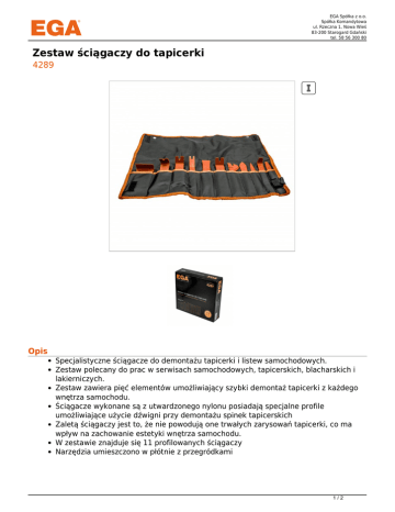 EGA Spółka z o.o. Spółka Komandytowa ul. Rzeczna 1, Nowa Wieś 83-200 Starogard Gdański tel. 58 56 300 80 Zestaw ściągaczy do tapicerki 4289 Opis Specjalistyczne ściągacze do demontażu tapicerki i listew samochodowych. Zestaw polecany do prac w serwisach samochodowych, tapicerskich, blacharskich i lakierniczych. Zestaw zawiera pięć elementów umożliwiający szybki demontaż tapicerki z każdego wnętrza samochodu. Ściągacze wykonane są z utwardzonego nylonu posiadają specjalne profile umożliwiające użycie dźwigni przy demontażu spinek tapicerskich Zaletą ściągaczy jest to, że nie powodują one trwałych zarysowań tapicerki, co ma wpływ na zachowanie estetyki wnętrza samochodu. W zestawie znajduje się 11 profilowanych ściągaczy Narzędzia umieszczono w płótnie z przegródkami 1/2 EGA Spółka z o.o. Spółka Komandytowa ul. Rzeczna 1, Nowa Wieś 83-200 Starogard Gdański tel. 58 56 300 80 Warianty Lp. Nr katalogowy 1 4289 EAN 2/2 Powered by TCPDF (www.tcpdf.org)