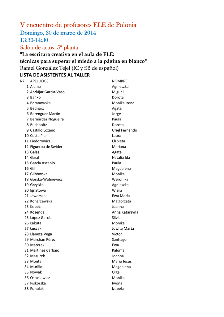 V encuentro de profesores ELE de Polonia Domingo, 30 de marzo de 2014 13:30-14:30 Salón de actos, 5ª planta "La escritura creativa en el aula de ELE: técnicas para superar el miedo a la página en blanco" Rafael González Tejel (IC y SB de español) LISTA DE ASISTENTES AL TALLER Nº 1 2 3 4 5 6 7 8 9 10 11 12 13 14 15 16 17 18 19 20 21 22 23 24 25 26 27 28 29 30 31 32 33 34 35 36 37 38 APELLIDOS Alama Andújar García‐Vaso Bańko Baranowska Bednarz Berenguer Martín Bernárdez Nogueira Buchholtz Castillo Lozano Costa Pla Fiedorowicz Figueroa de Swider Galas Garal García Ascanio Gil Glibowska Górska‐Wolniewicz Grzyśka Ignatowa Jaworska Konarzewska Kopeć Kosenda López García Łakuta Łuczak Llaneza Vega Marchán Pérez Marczak Martínez Carbajo Mazurek Montal Murillo Nowak Ostasiewicz Piskorska Ponulak NOMBRE Agnieszka Miguel Dorota Monika Irena Agata Jorge Paula Dorota Uriel Fernando Laura Elżbieta Mariana Agata Natalia Ida Paula Magdalena Monika Weronika Agnieszka Wiera Ewa Maria Małgorzata Joanna Anna Katarzyna Silvia Monika Jowita Marta Víctor Santiago Ewa Paloma Joanna María Jesús Magdalena Olga Monika Iwona Izabela 39 40 41 42 43 44 45 46 47 48 49 50 51 52 53 54 55 56 57 58 59 60 61 62 63 Prot Rodakiewicz Rodríguez Fernel Rubio Moreno Sagermann Bustinza Sienkiewicz Sisniegas Muñoz Smutek‐Rusek Sobstel Staniszewska Swenderska Szopa Szymańska Śliwak‐Kosińska Tarczewska Turbiarz Tyburska Vázquez Casanova Wasil Wieszun Wojciechowska Wolańska‐Zasępa Wołowska Wódkowska Zimny Danuta Karolina Antonio Raúl Leonor Joanna Maria Evelyn Patricia Ewa Ewa Małgorzata Ewa Sylwia Magdalena Magdalena Agnieszka Katarzyna Elzbieta Xabier Agnieszka Kamila Grażyna Izabela Edyta Ewa Agata