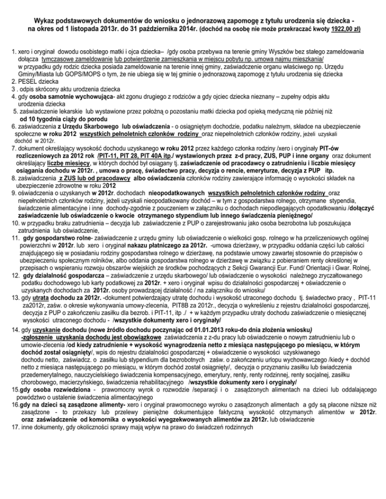 Wykaz podstawowych dokumentów do wniosku o jednorazową zapomogę z tytułu urodzenia się dziecka na okres od 1 listopada 2013r. do 31 października 2014r. (dochód na osobę nie może przekraczać kwoty 1922,00 zł) 1. xero i oryginał dowodu osobistego matki i ojca dziecka– /gdy osoba przebywa na terenie gminy Wyszków bez stałego zameldowania dołącza tymczasowe zameldowanie lub potwierdzenie zamieszkania w miejscu pobytu np. umowa najmu mieszkania/ w przypadku gdy rodzic dziecka posiada zameldowanie na terenie innej gminy, zaświadczenie organu właściwego np. Urzędu Gminy/Miasta lub GOPS/MOPS o tym, że nie ubiega się w tej gminie o jednorazową zapomogę z tytułu urodzenia się dziecka 2. PESEL dziecka 3 . odpis skrócony aktu urodzenia dziecka 4. gdy osoba samotnie wychowująca- akt zgonu drugiego z rodziców a gdy ojciec dziecka nieznany – zupełny odpis aktu urodzenia dziecka 5. zaświadczenie lekarskie lub wystawione przez położną o pozostaniu matki dziecka pod opieką medyczną nie później niż od 10 tygodnia ciąży do porodu 6. zaświadczenia z Urzędu Skarbowego lub oświadczenia - o osiągniętym dochodzie, podatku należnym, składce na ubezpieczenie społeczne w roku 2012 wszystkich pełnoletnich członków rodziny oraz niepełnoletnich członków rodziny, jeżeli uzyskali dochód w 2012r. 7. dokument określający wysokość dochodu uzyskanego w roku 2012 przez każdego członka rodziny /xero i oryginały PIT-ów rozliczeniowych za 2012 rok /PIT-11, PIT 28, PIT 40A itp./ wystawionych przez z-d pracy, ZUS, PUP i inne organy oraz dokument określający liczbę miesięcy, w których dochód był osiągany tj. zaświadczenie od pracodawcy o zatrudnieniu i liczbie miesięcy osiągania dochodu w 2012r. , umowa o pracę, świadectwo pracy, decyzja o rencie, emeryturze, decyzja z PUP itp. 8. zaświadczenia z ZUS lub od pracodawcy albo oświadczenia członków rodziny zawierające informację o wysokości składek na ubezpieczenie zdrowotne w roku 2012 9. oświadczenia o uzyskanych w 2012r. dochodach nieopodatkowanych wszystkich pełnoletnich członków rodziny oraz niepełnoletnich członków rodziny, jeżeli uzyskali nieopodatkowany dochód – w tym z gospodarstwa rolnego, otrzymane stypendia, świadczenie alimentacyjne i inne dochody-zgodnie z pouczeniem w załączniku o dochodach niepodlegających opodatkowaniu /dołączyć zaświadczenie lub oświadczenie o kwocie otrzymanego stypendium lub innego świadczenia pieniężnego/ 10. w przypadku braku zatrudnienia – decyzja lub zaświadczenie z PUP o zarejestrowaniu jako osoba bezrobotna lub poszukująca zatrudnienia lub oświadczenie, 11. gdy gospodarstwo rolne- zaświadczenie z urzędu gminy lub oświadczenie o wielkości gosp. rolnego w ha przeliczeniowych ogólnej powierzchni w 2012r. lub xero i oryginał nakazu płatniczego za 2012r. -umowa dzierżawy, w przypadku oddania części lub całości znajdującego się w posiadaniu rodziny gospodarstwa rolnego w dzierżawę, na podstawie umowy zawartej stosownie do przepisów o ubezpieczeniu społecznym rolników, albo oddania gospodarstwa rolnego w dzierżawę w związku z pobieraniem renty określonej w przepisach o wspieraniu rozwoju obszarów wiejskich ze środków pochodzących z Sekcji Gwarancji Eur. Fund/ Orientacji i Gwar. Rolnej, 12. gdy działalność gospodarcza – zaświadczenie z urzędu skarbowego/ lub oświadczenie o wysokości należnego zryczałtowanego podatku dochodowego lub karty podatkowej za 2012r. + xero i oryginał wpisu do działalności gospodarczej + oświadczenie o uzyskanych dochodach za 2012r. osoby prowadzącej działalność / na załączniku do wniosku/ 13. gdy utrata dochodu za 2012r. -dokument potwierdzający utratę dochodu i wysokość utraconego dochodu tj. świadectwo pracy , PIT-11 za2012r, zaśw. o okresie wykonywania umowy-zlecenia, PIT8B za 2012r., decyzja o wykreśleniu z rejestru działalności gospodarczej, decyzja z PUP o zakończeniu zasiłku dla bezrob. i PIT-11, itp ./ + w każdym przypadku utraty dochodu zaświadczenie o miesięcznej wysokości utraconego dochodu - /wszystkie dokumenty xero i oryginały/ 14. gdy uzyskanie dochodu (nowe źródło dochodu poczynając od 01.01.2013 roku-do dnia złożenia wniosku)) -zgłoszenie uzyskania dochodu jest obowiązkowe zaświadczenia z z-du pracy lub oświadczenie o nowym zatrudnieniu lub o umowie-zlecenia /od kiedy zatrudnienie + wysokość wynagrodzenia netto z miesiąca następującego po miesiącu, w którym dochód został osiągnięty/, wpis do rejestru działalności gospodarczej + oświadczenie o wysokości uzyskiwanego dochodu netto, zaświadcz. o zasiłku lub stypendium dla bezrobotnych zaśw. o zakończeniu urlopu wychowawczego /kiedy + dochód netto z miesiąca następującego po miesiącu, w którym dochód został osiągnięty/, decyzja o przyznaniu zasiłku lub świadczenia przedemerytalnego, nauczycielskiego świadczenia kompensacyjnego, emerytury, renty, renty rodzinnej, renty socjalnej, zasiłku chorobowego, macierzyńskiego, świadczenia rehabilitacyjnego /wszystkie dokumenty xero i oryginały/ 15.gdy osoba rozwiedziona - prawomocny wyrok o rozwodzie /separacji i o zasądzonych alimentach na dzieci lub oddalającego powództwo o ustalenie świadczenia alimentacyjnego 16.gdy na dzieci są zasądzone alimenty- xero i oryginał prawomocnego wyroku o zasądzonych alimentach a gdy są płacone niższe niż zasądzone - to przekazy lub przelewy pieniężne dokumentujące faktyczną wysokość otrzymanych alimentów w 2012r. oraz zaświadczenie od komornika o wysokości wyegzekwowanych alimentów za 2012r. lub oświadczenie 17. inne dokumenty, gdy okoliczności sprawy mają wpływ na prawo do świadczeń rodzinnych