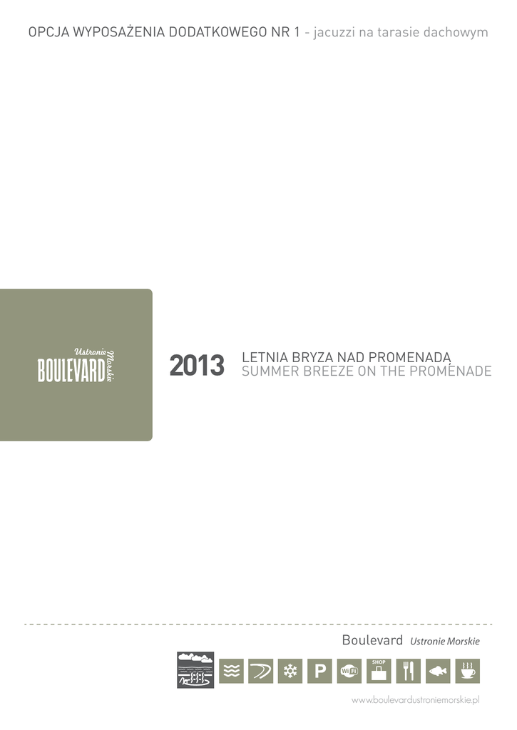 OPCJA WYPOSAŻENIA DODATKOWEGO NR 1 - jacuzzi na tarasie dachowym LETNIA BRYZA NAD PROMENADĄ SUMMER BREEZE ON THE PROMENADE Boulevard Ustronie Morskie SHOP Wi Fi www.boulevardustroniemorskie.pl ZAINWESTUJ I ZARABIAJ PODWÓJNIE! INVEST AND EARN DOUBLE! www.zdrojowainvest.pl OPCJA WYPOSAŻENIA DODATKOWEGO NR 1 jacuzzi na tarasie dachowym INDEX 1. Wizualne przedstawienie lokalizacji jacuzzi 2. Proponowane jacuzzi renomowanej marki Victory SPA wraz ze specyfikacją oraz cenami JACUZZI CLASSIC JACUZZI DELUXE SYSTEM CLASSIC SYSTEM DELUXE 3. Kontakt i adresy LETNIA BRYZA NAD PROMENADĄ SUMMER BREEZE ON THE PROMENADE www.boulevardustroniemorskie.pl 1. Wizualne przedstawienie lokalizacji jacuzzi Daisy Classic ILOŚĆ MIEJSC 3 (2 siedzące + 1 leżące) WYMIARY 200 x 120 Victory SPA C.22 kondygnacja: III APARTAMENT 1-POKOJOWY Z WIDOKIEM NA MORZE: Powerzchnia całkowita: 29,10 m2 Liczba pomieszczeń: 3 Rodzaj lokalu: apartament Powierzchnie dod. taras na dachu 38,20 m2 Standard wykończony ZESTAWIENIE POWIERZCHNI: 1. Korytarz 2. Łazienka 3. Pokoj z aneksem kuch. 2 6,60 m 3,60 m2 18,90 m2 N W E S www.boulevardustroniemorskie.pl 2. Proponowane jacuzzi renomowanej marki Victory SPA wraz ze specyfikacją oraz cenami Daisy Classic ILOŚĆ MIEJSC 3 (2 siedzące + 1 leżące) Iris Classic ILOŚĆ MIEJSC 5 (4 siedzące + 1 leżące) JACUZZI CLASSIC WYMIARY 200 x 120 Victory SPA WYMIARY 225 x 215 Victory SPA 2250 40 0 340 2000 480 450 2250 780 640 330 610 580 630 720 ~890 600 Cena netto [PLN]* 18.900 3.730 1.920 1.510 3.500 930 4.000 JACUZZI WODNO-POWIETRZNE LAMPA UV OZONATOR RADIO/MP3 WODOODPORNE RADIO STEREO Z CD SCHODY PROMIENIOWA DMUCHAWA POWIETRZA 26.700 3.730 1.920 1.510 3.500 2.470 4.000 Tylko dla Klientów Zdrojowej Invest montaż w cenie! www.boulevardustroniemorskie.pl 0 34 450 850 360 ~890 500 1050 495 420 750 470 1200 1040 2. Proponowane jacuzzi renomowanej marki Victory SPA wraz ze specyfikacją oraz cenami Daisy Deluxe ILOŚĆ MIEJSC 3 (2 siedzące + 1 leżące) Iris Deluxe ILOŚĆ MIEJSC 5 (4 siedzące + 1 leżące) JACUZZI DELUXE DOSTĘPNE KOLORY WYMIARY 200 x 120 Victory SPA WYMIARY 225 x 215 Victory SPA 2250 40 0 340 2000 480 450 2250 780 640 330 610 580 630 600 720 ~890 0 34 450 850 360 Cena netto [PLN]* 29.430 1.650 3.730 1.920 3.500 920 4.000 JACUZZI WODNO-POWIETRZNE BIAŁY AKRYL AKRYL W INNYM KOLORZE LAMPA UV OZONATOR WODOODPORNE RADIO STEREO Z CD FUNKCJA KOMUNIKACJI ZA POMOCĄ SMS PROMIENIOWA DMUCHAWA POWIETRZA 45.150 2.890 3.730 1.920 3.500 920 4.000 Tylko dla Klientów Zdrojowej Invest montaż w cenie i dodatkowy kolor srebrny do wyboru! www.boulevardustroniemorskie.pl ~890 500 1050 495 420 750 470 1200 1040 2. Tylko dla Klientów Zdrojowej Invest montaż w cenie SYSTEM CLASSIC SYSTEM DELUXE Portable SPA Classic Portable SPA Deluxe Victory SPA Victory SPA System wodno-powietrzny: System wodno-powietrzny: • elektroniczne sterowanie • ciekłokrystaliczny wyświetlacz funkcji • program „zimowy” – system przeciwdziałający zamarzaniu wody w wannie • elektroniczne sterowanie • ciekłokrystaliczny wyświetlacz funkcji • program „zimowy” – system przeciwdziałający zamarzaniu wody w wannie Masaż wodny: Masaż wodny: • wirujące dysze na plecy • dysze na stopy - • czujnik poziomu wody (zabezpieczenie pompy przed pracą na sucho) • wirujące dysze na plecy • wirujące dysze na stopy • dysze średnie stałe z regulowanym kierunkiem strumienia wody • niezależne załączanie dwóch sekcji hydromasażu • niezależna regulacja natężenia strumienia za pomocą systemu dopowietrzenia • system turbodoładowania dysz masażowych (dodatkowe dopowietrzenie systemu wodnego przez dmuchawę powietrza) • czujnik poziomu wody (zabezpieczenie pompy przed pracą na sucho) Masaż powietrzny: Masaż powietrzny: • płynna regulacja intensywności masażu powietrznego • pulsacyjny masaż powietrzny • płynna regulacja intensywności masażu powietrznego • pulsacyjny masaż powietrzny (B-MODE) Dodatkowe wyposażenie standardowe: Dodatkowe wyposażenie standardowe: • zegar • program filtracji • kolorowe oświetlenie podwodne – chromoterapia • wodoodporny pilot zdalnego sterowania • obudowa z kompozytu • przykrycie termoizolacyjne • regulacja temperatury wody – przepływowy elektryczny podgrzewacz wody z zabezpieczeniem w przypadku braku przepływu wody • system filtracji – skimmer z wymiennym wkładem filtracyjnym • system izolacji termicznej wanny oparty na piance PU • • • • • • • • • • • niezależna regulacja natężenia strumienia za pomocą systemu dopowietrzenia - zegar program filtracji kolorowe oświetlenie podwodne – chromoterapia wbudowane radio i odtwarzacz mp3 wodoodporny pilot zdalnego sterowania obudowa akrylowa z elementami z kompozytu schody przykrycie termoizolacyjne – 10/15 cm system łatwego otwierania przykrycia (oprócz DAISY) regulacja temperatury wody – przepływowy elektryczny podgrzewacz wody z zabezpieczeniem w przypadku braku przepływu wody • system filtracji – skimmer z wymiennym wkładem filtracyjnym • system izolacji termicznej wanny oparty na piance PU www.boulevardustroniemorskie.pl 3. Kontakt i adresy W sprawie jacuzzi zapraszamy do kontaktu bezpośrednio ze swoim dotychczasowym Doradcą Edytą Grunwald Kierownikiem Biura Sprzedaży w Świnoujściu M +48 693 959 800 lub naszymi Biurami Boulevard Ustronie Morskie ul. Kościuszki 78-111 Ustronie Morskie Poland Dojazd GPS N E Biuro w Kołobrzegu ul. Sułkowskiego 9 (Marine Hotel*****) 78-100 Kołobrzeg Polska T +48 94 352 31 14 F +48 94 352 32 73 [email protected] 54° 12' 57" 15° 45' 30" Biuro w Świnoujściu ul. Uzdrowiskowa 20 przy promenadzie (Baltic Park Promenada) 72-600 Świnoujście Polska T +48 91 327 80 80 F +48 91 322 11 33 [email protected] Biuro w Warszawie ul. Marszałkowska 72 00-545 Warszawa Polska T/F +48 22 713 89 00 [email protected] www.boulevardustroniemorskie.pl ZAINWESTUJ I ZARABIAJ PODWÓJNIE! IN