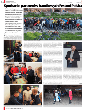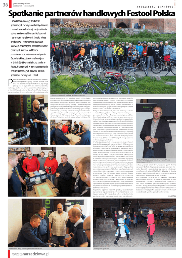 36 gazeta narzędziowa październik - listopad 2016 a k tu a l n o ś c i b r a n ż o w e Spotkanie partnerów handlowych Festool Polska Firma Festool, wiodący producent systemowych rozwiązań w branży drzewnej i remontowo-budowlanej, swoje działania opiera na dialogu z klientami końcowymi i partnerami handlowymi. Szeroka oferta produktowa i systemowość rozwiązań sprawiają, że niezbędne jest organizowanie cyklicznych spotkań, na których prezentowane są najnowsze rozwiązania. Ostatnie takie spotkanie miało miejsce w dniach 26-28 września br. na zamku w Reszlu. Uczestniczyli w nim przedstawiciele 27 firm sprzedających na rynku polskim systemowe rozwiązania Festool. P rzedstawienie nowości zostało poprzedzone prezentacjami, które podsumowywały pierwsze półrocze 2016 roku oraz przedstawiały plany Festool na jego drugą połowę oraz początek 2017 roku z zakresu sprzedaży, marketingu, szkoleń oraz serwisu. Uczestników szkolenia przywitał Michał Walczak, dyrektor handlowy Festool Polska. Następnie zaprezentował wyniki firmy w pierwszej połowie bieżącego roku, Uczestnicy spotkania podczas wycieczki rowerowej które w porównaniu do roku ubiegłego wzrosły o 23%. - Spektakularne rezultaty firma Festool zawdzięcza konsekwentnej realizacji planu rozwoju polskiej spółki, aktywności naszych partnerów handlowych oraz sprzyjającej sytuacji rynkowej. Z początkiem tego roku przeorganizowaliśmy dział sprzedaży i, chcąc być jeszcze bliżej rynku, podwoiliśmy liczbę doradców technicznych, którzy wykonują bezpośrednie pokazy i prezentacje u naszych wspólnych klientów końcowych. Wdrożony plan zakłada coroczny 2-cyfrowy wzrost obrotów i ich podwojenie do 2021 r. oraz obejmuje 7 obszarów strategicznych dla Festool Polska, które zawierają cele do realizacji w kolejnych 5 la- Prezenetacje i testy nowości produktowych Festool gazetanarzedziowa.pl tach. Festool jest liderem na polskim rynku w segmencie pilarek, frezarek górnowrzecionowych i szlifierek mimośrodowych. Dodatkowo odnotowujemy bardzo duże wzrosty w segmencie narzędzi akumulatorowych oraz odkurzaczy. Poprzez działania skoncentrowane na klientach końcowych i dystrybutorach chcemy być najlepszym partnerem w biznesie - stwierdził Michał Walczak. Następnie Mariusz Czajkowski, kierownik marketingu i szkoleń w Festool Polska, podsumował aktywności marketingowe w pierwszej połowie roku: - Zgodnie z naszą strategią na najbliższe lata położyliśmy duży nacisk na zwiększenie rozpoznawalności marki Festool w branży remontowo-budowlanej. Jednym z przykładów realizacji tego planu była nasza obecność na Targach BUDMA, które okazały się dla nas dużym sukcesem. Ponadto zapraszamy Polskich rzemieślników z branży remontowo-budowlanej do testowania nowych produktów, a tym samym dzielenia się z firmą swoimi uwagami. Dzięki temu użytkownicy naszych narzędzi biorą aktywny udział w ich tworzeniu. W działaniach marketingowych wspieramy naszych partnerów handlowych, czego bardzo dobrym przykładem jest ciężarówka pokazowa, która odwiedziła Polskę na przełomie kwietnia i maja. Byliśmy z nią w 9 lokalizacjach, mnożąc zadowolonych i entuzjastycznych klientów. W kolejnej części spotkania Jerzy Januszewski, kierownik serwisu, omówił jego działalność w ostatnich latach. - 70% napraw wykonywanych w serwisie Festool Polska to naprawy w ramach Service all-Inclusive – powiedział Jerzy Januszewski. - Oznacza to, że użytkownicy naszych narzędzi nie ponoszą dodatkowych kosztów, gdyż usługa Service all-Inclusive zapewnia bezpłatną naprawę przez 36 miesięcy od daty zakupu. Dlatego przewidywalne są koszty posiadania i eksploatacji naszych narzędzi. Ponadto 4% naszych napraw to tak zwane naprawy w ramach gestu handlowego. Wyciągamy rękę do użytkowników, którzy od lat pracują maszynami Festool i są naszymi stałymi klientami. W takim wypadku naprawiamy bezpłatnie w ramach gwarancji Service all-Inclusive maszyny uszkodzone mechaniczne z winy użytkownika, np. po upadku z dużej wysokości czy przejechane przez samochód. Mamy zespół doświadczonych mechaników, jesteśmy wyposażeni w najnowocześniejsze przyrządy pomiarowe: Panel 2, Wibrometr, Basytec, Unitec czy Secutest. Wydajemy certyfikaty sprawności i bezpieczeństwa elektrycznego dla serwisowanych maszyn wymagane przez prawo budowlane. Współpracujemy z działami produkcji i kontroli jakości w naszej centrali, co pozwala usprawniać maszyny Festool i mieć zadowolonych użytkowników. Przykładem tego jest polerka SHINEX, która została optymalnie dostosowana do nowoczesnych systemów polerskich dodał kierownik serwisu. Po południu regionalny kierownik sprzedaży Leszek Damazyn zaprezentował tegoroczne nowości Festool oraz korzyści wynikające z Systemu 18 V Festool. Szczegółowo omówił technologię airstream, która w znaczący sposób skraca czas ładowania i Pokazy walk rycerskich Michał Walczak, dyrektor handlowy Festool Polska, prezentuje wyniki firmy wydłuża żywotność baterii. Nowe, rozłączalne łączniki Domino oraz System 18 V Festool zaprezentował doradca techniczny Przemysław Dominiak, a prezentacji nowego systemu polerskiego i zmodyfikowanych szlifierek RTS/DTS/ETS 125 podjął się doradca techniczny Maciej Kożuchowski. Jak zawsze, uczestnicy spotkania mieli możliwość sprawdzenia narzędzi w praktyce. Bloki szkoleniowe były przeplatane spotkaniami towarzyskimi podczas których uczestnicy spotkania mogli wymienić się swoimi wrażeniami i opiniami o zaprezentowanych rozwiązaniach. Firma Festool zadbała nie tylko część merytoryczną spotkania, ale także o atrakcje, z których najbardziej podobała się wycieczka rowerowa po pięknych okolicach Reszla oraz koncert organowy w klasztorze w Świętej Lipce. Nie zabrakło również mocnych wrażeń podczas biesiady rycerskiej i pokazów walk rycerskich. M.Cz. (FESTOOL)