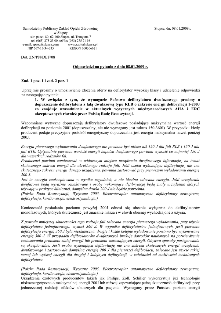 Samodzielny Publiczny Zakład Opieki Zdrowotnej w Słupcy Słupca, dn. 08.01.2009r. skr. poczt. 80, 62-400 Słupca, ul. Traugutta 7 tel. (063) 275 23 00, tel/fax (063) 275 21 16 e-mail: [email protected] www.szpital.slupca.pl NIP 667-15-34-335 REGON 000306621 Dot. ZN/PN/DEF/08 Odpowiedzi na pytania z dnia 08.01.2009 r. Zad. 1 poz. 1 i zad. 2 poz. 1 Uprzejmie prosimy o umożliwienie złożenia oferty na defibrylator wysokiej klasy i udzielenie odpowiedzi na następujące pytania: 1. W związku z tym, że wymagacie Państwo defibrylatora dwufazowego prosimy o dopuszczenie defibrylatora z falą dwufazową typu RLB o zakresie energii defibrylacji 1-200J co znajduje uzasadnienie w aktualnych wytycznych międzynarodowych AHA i ERC akceptowanych również przez Polską Radę Resuscytacji. Wspomniane wytyczne dopuszczają defibrylatory dwufazowe posiadające maksymalną wartość energii defibrylacji na poziomie 200J (dopuszczalny, ale nie wymagany jest zakres 150-360J). W przypadku kiedy producent podaje precyzyjnie protokół energetyczny dopuszczalna jest energia maksymalna nawet poniżej 200J. Energia pierwszego wyładowania dwufazowego nie powinna być niższa niż 120 J dla fali RLB i 150 J dla fali BTE. Optymalnie pierwsza wartość energii impulsu dwufazowego powinna wynosić co najmniej 150 J dla wszystkich rodzajów fal. Producenci powinni zamieszczać w widocznym miejscu urządzenia dwufazowego informacje˛ na temat skutecznego zakresu energii dla określonego rodzaju fali. Jeśli osoba wykonująca defibrylacje˛ nie zna skutecznego zakresu energii danego urządzenia, powinna zastosować przy pierwszym wyładowaniu energię 200 J. Jest to energia zaakceptowana w wyniku uzgodnień, a nie idealna zalecana energia. Jeśli urządzenia dwufazowe będą wyraźnie oznakowane i osoby wykonujące defibrylację będą znały urządzenia których używają w praktyce klinicznej, domyślna dawka 200 J nie będzie potrzebna. (Polska Rada Resuscytacji, Wytyczne 2005, Elektroterapia: automatyczne defibrylatory zewnętrzne, defibrylacja, kardiowersja, elektrostymulacja.) Konieczność posiadania poziomu powyżej 200J odnosi się obecnie wyłącznie do defibrylatorów monofazowych, których skuteczność jest znacznie niższa i w chwili obecnej wychodzą one z użycia. Z powodu mniejszej skuteczności tego rodzaju fali zalecana energia pierwszego wyładowania, przy użyciu defibrylatora jednofazowego, wynosi 360 J. W wypadku defibrylatorów jednofazowych, jeśli pierwsza defibrylacja energią 360 J była nieskuteczna, drugie i każde kolejne wyładowanie powinno być wykonywane energią 360 J. W przypadku defibrylatorów dwufazowych brakuje dowodów naukowych na potwierdzenie zastosowania protokołu stałej energii lub protokołu wzrastających energii. Obydwa sposoby postępowania są akceptowalne. Jeśli osoba wykonująca defibrylację nie zna zakresu skutecznych energii urządzenia dwufazowego i zastosowała domyślną energię 200 J dla pierwszej defibrylacji, zalecane jest użycie takiej samej lub wyższej energii dla drugiej i kolejnych defibrylacji, w zależności od możliwości technicznych defibrylatora. (Polska Rada Resuscytacji, Wytyczne 2005, Elektroterapia: automatyczne defibrylatory zewnętrzne, defibrylacja, kardiowersja, elektrostymulacja.) Urządzenia czołowych producentów takich jak Philips, Zoll, Schiller wykorzystują już technologie niskoenergetyczne o maksymalnej energii 200J lub niższej zapewniające pełną skuteczność defibrylacji przy jednoczesnej redukcji efektów ubocznych dla pacjenta. Wymagany przez Państwa poziom energii maksymalnej min. 250J nie znajduje uzasadnienia w wytycznych i uniemożliwia zaoferowanie sprzętu nowoczesnego, wysokiej klasy, czołowych marek. Pragniemy zauważyć, ze oferowany przez nas defibrylator jako jedno z najnowocześniejszych urządzeń tego typu na rynku spełnia wszystkie pozostałe wymagania zawarte w SIWZ. Odp. TAK. 2. Pytania do zadania nr 1 Defibrylator z kardiowersją – 4 szt i defibrylator z kardiowersją i stymulacją – wersja szpitalna 1 szt. Ad.6.(dla obu specyfikacji) Czy zamawiający dopuści defibrylator, którego całkowity ciężar wynosi 7,09 kg. 0,09 kilograma nie wpływa na cechę przenośności, nie czyni również odczuwalnej dla Użytkownika różnicy. Odp. TAK. Ad.8.(dla obu specyfikacji) Czy Zamawiający pisząc w specyfikacji; „Możliwość rozbudowy o dodatkowe moduły pomiarowe SpO2, 12 odprowadzeń EKG, NIBP, EtCO2 – opcje muszą by dostępne na dzień składania ofert”, wymaga, aby ww. opcje były zamontowane w defibrylatorze i uwzględnione w cenie? Odp. Zamawiający nie wymaga, aby ww. opcje były dostępne na dzień składania ofert – MODYFIKACJA SIWZ 08.01.2009 r. Ad.14. (dla obu specyfikacji) Czy Zamawiający dopuści nowoczesne defibrylatory w zakresie wyboru energii 1-200J Defibrylacja dwufazowa energiami większymi od 200J jest obecnie stosowana coraz rzadziej, Czołowi producenci defibrylatorów już od kilku lat wykorzystują defibrylację niskoenergetyczną (energia maksymalna ≤ 200J) gwarantującą pełną skuteczność a jednocześnie zmniejszającą ryzyko powikłań ( oparzenia, uszkodzenia mięśnia sercowego). Zgodnie z aktualnymi międzynarodowymi wytycznymi ERC (Europejska Rada Resuscytacji), AHA (Amerykańskie Towarzystwo Kardiologiczne) i PRC (Polska Rada Resuscytacji) nie ma dowodów na większą skuteczność defibrylacji energiami powyżej 200J. Nowoczesne defibrylatory dwufazowe wysokiej klasy wyposażone są w funkcję kompensacji impedancji pacjenta zapewniającą najwyższą skuteczność nawet w przypadku pacjentów otyłych, o dużej impedancji klatki piersiowej. Dzięki takim rozwiązaniom nie ma konieczności stosowania energii powyżej 200J, co zostało potwierdzone badaniami. Odp. TAK. Zamawiający dopuszcza energię maksymalną defibrylacji min. 200J - MODYFIKACJA SIWZ 08.01.2009 r. Ad.19. (dla obu specyfikacji) Czy zamawiający dopuści defibrylator, w kt