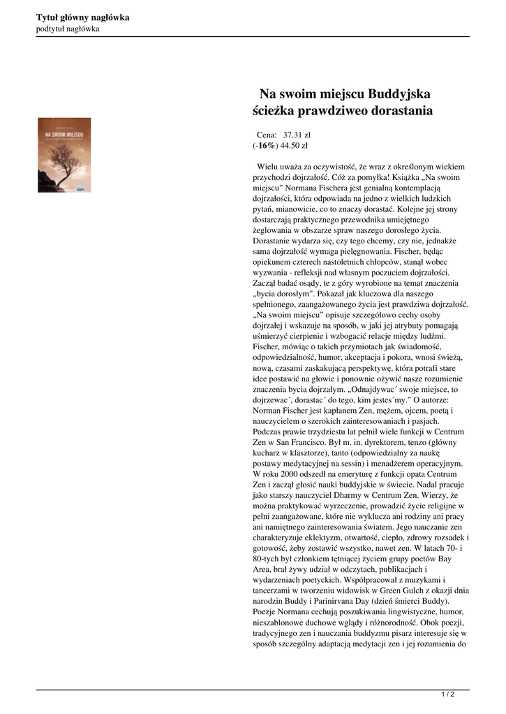 Tytuł główny nagłówka podtytuł nagłówka Na swoim miejscu Buddyjska ścieżka prawdziweo dorastania Cena: 37.31 zł (-16%) 44.50 zł Wielu uważa za oczywistość, że wraz z określonym wiekiem przychodzi dojrzałość. Cóż za pomyłka! Książka „Na swoim miejscu” Normana Fischera jest genialną kontemplacją dojrzałości, która odpowiada na jedno z wielkich ludzkich pytań, mianowicie, co to znaczy dorastać. Kolejne jej strony dostarczają praktycznego przewodnika umiejętnego żeglowania w obszarze spraw naszego dorosłego życia. Dorastanie wydarza się, czy tego chcemy, czy nie, jednakże sama dojrzałość wymaga pielęgnowania. Fischer, będąc opiekunem czterech nastoletnich chłopców, stanął wobec wyzwania - refleksji nad własnym poczuciem dojrzałości. Zaczął badać osądy, te z góry wyrobione na temat znaczenia „bycia dorosłym”. Pokazał jak kluczowa dla naszego spełnionego, zaangażowanego życia jest prawdziwa dojrzałość. „Na swoim miejscu” opisuje szczegółowo cechy osoby dojrzałej i wskazuje na sposób, w jaki jej atrybuty pomagają uśmierzyć cierpienie i wzbogacić relacje między ludźmi. Fischer, mówiąc o takich przymiotach jak świadomość, odpowiedzialność, humor, akceptacja i pokora, wnosi świeżą, nową, czasami zaskakującą perspektywę, która potrafi stare idee postawić na głowie i ponownie ożywić nasze rozumienie znaczenia bycia dojrzałym. „Odnajdywac´ swoje miejsce, to dojrzewac´, dorastac´ do tego, kim jestes´my.” O autorze: Norman Fischer jest kapłanem Zen, mężem, ojcem, poetą i nauczycielem o szerokich zainteresowaniach i pasjach. Podczas prawie trzydziestu lat pełnił wiele funkcji w Centrum Zen w San Francisco. Był m. in. dyrektorem, tenzo (główny kucharz w klasztorze), tanto (odpowiedzialny za naukę postawy medytacyjnej na sessin) i menadżerem operacyjnym. W roku 2000 odszedł na emeryturę z funkcji opata Centrum Zen i zaczął głosić nauki buddyjskie w świecie. Nadal pracuje jako starszy nauczyciel Dharmy w Centrum Zen. Wierzy, że można praktykować wyrzeczenie, prowadzić życie religijne w pełni zaangażowane, które nie wyklucza ani rodziny ani pracy ani namiętnego zainteresowania światem. Jego nauczanie zen charakteryzuje eklektyzm, otwartość, ciepło, zdrowy rozsadek i gotowość, żeby zostawić wszystko, nawet zen. W latach 70- i 80-tych był członkiem tętniącej życiem grupy poetów Bay Area, brał żywy udział w odczytach, publikacjach i wydarzeniach poetyckich. Współpracował z muzykami i tancerzami w tworzeniu widowisk w Green Gulch z okazji dnia narodzin Buddy i Parinirvana Day (dzień śmierci Buddy). Poezje Normana cechują poszukiwania lingwistyczne, humor, nieszablonowe duchowe wglądy i różnorodność. Obok poezji, tradycyjnego zen i nauczania buddyzmu pisarz interesuje się w sposób szczególny adaptacją medytacji zen i jej rozumienia do 1/2 Tytuł główny nagłówka podtytuł nagłówka kultury Zachodu i codziennego życia, do świata biznesu, prawników, rozwiązywania konfliktów, dialogu międzyreligijnego (zajmuje się przede wszystkim medytacją żydowską i katolickim dialogiem między-monastycznym), opieki nad umierającymi (nauczał przez wiele lat w ramach projektu Zen Hospice Project), świata technologii etc. Wybrane opinie o książce: „Inspirująca prezentacja dojrzałości, Zenowska w swojej eleganckiej prostocie, cudownie mądra.” Sylvia Boorstein, autorka Pay Attention, For Goodness’ Sake Niezwykle głęboka, poruszająca i nośna... Każde słowo jest okazją do dawania sobie wsparcia w najpraktyczniejszy ze sposobów, poprzez coś, co może oznaczać bycie najlepszą wersją siebie i podążanie ścieżką mądrego działania, współczucia i integralności. Jon Kabat-Zinn, autor Wherever You Go, There You Are and Full Catastrophe Living „Przemyślana, mądra, intencjonalna, piękna. Potrafi stawiać pytania z serca.” Jack Kornfield, autor A Path With Heart „Ta książka pięknie pokazuje, że prawdziwa dojrzałość znaczy więcej niż fizyczny wysiłek, jest procesem trwającym całe życie.” Noah Levine, autor Dharma Punx „Książka dająca orzeźwienie! Dla każdego, kto zmaga się ze swoja praktyką, pośród złożoności, frustracji i dwuznaczności realnego życia.” Charlotte Joko Beck, autor Zen na co dzień 2/2 Powered by TCPDF (www.tcpdf.org)