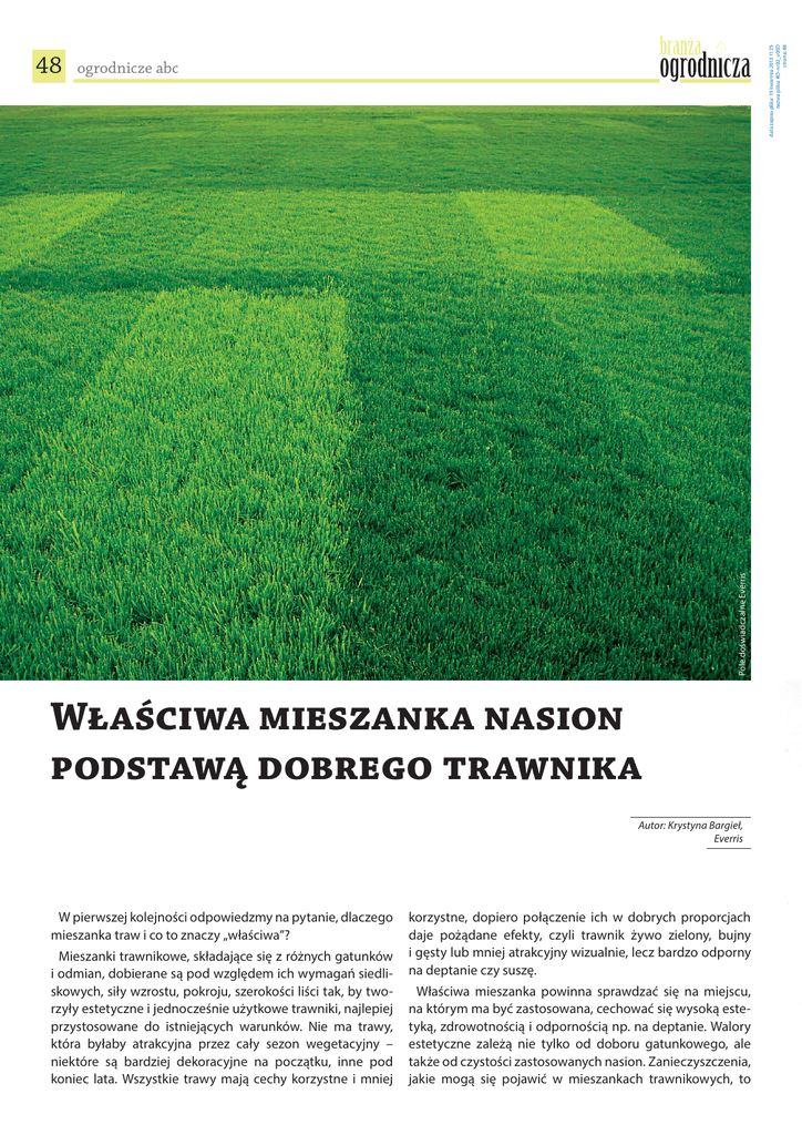 data zapisu pliku: 19 kwietnia 2013 11:25 nazwa pliku: BO-nr02_v05D strona: 48 ogrodnicze abc Pole doświadczalne Everris 48 Właściwa mieszanka nasion podstawą dobrego trawnika Autor: Krystyna Bargieł, Everris W pierwszej kolejności odpowiedzmy na pytanie, dlaczego mieszanka traw i co to znaczy „właściwa”? Mieszanki trawnikowe, składające się z różnych gatunków i odmian, dobierane są pod względem ich wymagań siedliskowych, siły wzrostu, pokroju, szerokości liści tak, by tworzyły estetyczne i jednocześnie użytkowe trawniki, najlepiej przystosowane do istniejących warunków. Nie ma trawy, która byłaby atrakcyjna przez cały sezon wegetacyjny – niektóre są bardziej dekoracyjne na początku, inne pod koniec lata. Wszystkie trawy mają cechy korzystne i mniej korzystne, dopiero połączenie ich w dobrych proporcjach daje pożądane efekty, czyli trawnik żywo zielony, bujny i gęsty lub mniej atrakcyjny wizualnie, lecz bardzo odporny na deptanie czy suszę. Właściwa mieszanka powinna sprawdzać się na miejscu, na którym ma być zastosowana, cechować się wysoką estetyką, zdrowotnością i odpornością np. na deptanie. Walory estetyczne zależą nie tylko od doboru gatunkowego, ale także od czystości zastosowanych nasion. Zanieczyszczenia, jakie mogą się pojawić w mieszankach trawnikowych, to data zapisu pliku: 19 kwietnia 2013 11:25 nazwa pliku: BO-nr02_v05D strona: 49 ogrodnicze abc np. fragmenty roślin, piasek, a także nasiona innych, niepożądanych roślin, przede wszystkim chwastów. Czyszczenie nasion, podnoszące jakość mieszanki, jest zabiegiem bardzo kosztownym, dlatego można założyć, że im tańsza mieszanka, tym więcej zanieczyszczeń i tym mniej „trawy w trawniku”. Tym samym mamy prawo oczekiwać, że droższe mieszanki będą lepiej oczyszczone, dzięki czemu w początkowej fazie wzrostu trawnika będzie mniej problemów związanych z występowaniem chwastów. Czystość nasion to jeden z argumentów przemawiających za wybieraniem produktów z tzw. wyższej półki, kolejny to stosowanie w droższych mieszankach traw gazonowych, które krzewią się nisko i przystosowane są do niskiego koszenia (w przeciwieństwie do znacznie tańszych traw pastewnych), dzięki czemu po kilku latach trawnik jest gęsty i nie wymaga renowacji. Na rynku mieszanek nasion traw, przeznaczonych zarówno dla klientów detalicznych, jak i firm zakładających tereny zieleni, dominuje kilka marek, tj. Agro-Land, Barenbrug, Kalnas, Rolimpex. Wśród nich, już od kilku lat, coraz lepiej widoczna staje się firma Everris (wywodząca się z amerykańskiej firmy Scotts), która wprowadziła na rynek serię produktów Landscaper Pro, w skład której, oprócz nawozów (patrz nr 1 „Branży Ogrodniczej”), wchodzą cztery mieszanki nasion. Everris zdecydował o poszerzeniu oferty produktów trawnikowych o nasiona. – Zależy nam na kompleksowej obsłudze firm zakładających i pielęgnujących tereny zieleni. Chcemy, by nasi klienci mieli pewność, że od samego początku stosują produkty najwyższej jakości, bo tylko to gwarantuje najlepsze efekty i zadowolenie ich klientów – mówi Maciej Mynett, szef firmy Everris w Polsce. Firma od lat prowadzi badania, które mają na celu wyselekcjonowanie najlepszych odmian, najbardziej odpornych na niekorzystne warunki środowiska, tj. susza, zacienienie, deptanie, choroby i niskie temperatury. Dzięki temu firma pomaga swoim klientom zredukować nakłady pracy na pielęgnację obiektów, na których zastosowano jej mieszanki. W hurtowniach ogrodniczych dostępne są następujące produkty firmy Everris: Finesse, Sun&Shade, Performance i Supreme. Pierwsza mieszanka – Finesse – to trawnik najbardziej elegancki, o delikatnym, wąskim liściu, gęsty, o ładnym, żywym wybar- 49 wieniu i stosunkowo wolno rosnący, dzięki czemu może być rzadziej koszony. O szybkości kiełkowania tej mieszanki i mrozoodporności pozytywnie wypowiedziała się Małgorzata Suchorska z firmy Cedrus, która zastosowała ją w swoim ogrodzie: – Nasiona były wysiewane w połowie października 2011 r., a po trzech tygodniach trawnik już był żywo zielony. Sprawdzianem dla niego była zima – prawie bezśnieżna i bardzo ostra, ale pierwsze dni wiosny rozwiały nasze obawy – trawnik przezimował w bardzo dobrej kondycji. Podobnie pozytywną opinię przekazał Rafał Świątkowski z firmy Abies: – Stosuję tę trawę w wykonywanych przez siebie ogrodach ze względu na szybkie kiełkowanie, mrozoodporność, świetny kolor i gęstość. Kolejna mieszanka dostępna na rynku – Sun&Shade – została tak skomponowana, by można było zastosować jedną mieszankę niezależnie od stopnia nasłonecznienia obsiewanego terenu. Podczas renowacji placu Jakuba Wujka w Szczecinie, firma Ekoos, która realizowała część prac, zastosowała tę mieszankę ze względu na jej uniwersalny charakter. Jak mówi Stanisław Połuch, właściciel firmy wykonawczej: – Obsiane powierzchnie szybko się zazieleniły i w krótkim czasie mogliśmy udostępnić teren spacerowiczom. W roku po wysiewie zauważyliśmy wysoką odporność na deptanie i okresowe niedobory wody. Mieszanki przeznaczone do intensywniejszego użytkowana, np. na place zabaw, to Performance i Supreme, które charakteryzują się wysoką odpornością na deptanie przy jednoczesnej wysokiej wartości estetycznej. Mieszanka Supreme jest tegoroczną nowością w ofercie firmy Everris (patrz dział NOWOŚCI) – 15-procentowy dodatek wiechliny łąkowej (Poa pratensis) gwarantuje intensywne zadarnienie trawnika, wysoką odporność na deptanie i inne uszkodzenia mechaniczne, a także wysoką zdolność do regeneracji po okresie suszy. Nasiona wiechliny, drobne i zazwyczaj długo kiełkujące, zostały w mieszance pokryte specjalna powłoką (Smart Start), która ma zdolność do magazynowania wody (nawet 500 razy więcej wody w stosunku do swojej masy), dzięki czemu na