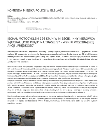 KOMENDA MIEJSKA POLICJI W ELBLĄGU Źródło: http://www.elblag.policja.gov.pl/o01/aktualnosci/11889,Jechal-motocyklem-126-kmh-w-miescie-Inny-kierowca-wjechal-pod-pr ad-na-trasie-s7-.html Wygenerowano: Sobota, 4 marca 2017, 00:46 Strona znajduje się w archiwum. JECHAŁ MOTOCYKLEM 126 KM/H W MIEŚCIE. INNY KIEROWCA WJECHAŁ „POD PRĄD” NA TRASIE S7 - WYNIKI WCZORAJSZEJ AKCJI „PRĘDKOŚĆ” Wczoraj w działaniach „Prędkość” elbląscy i pasłęccy policjanci skontrolowali 127 pojazdów. Wśród nich, aż 46 kierowców przekroczyło dopuszczalną prędkość. Rekordzistą okazał się 37-letni kierowca motocykla honda, który w Elblągu na ulicy Płk. Dąbka miał 126 km/h. Przekroczył prędkość o 76km/h i tym samym stracił prawo jazdy na trzy miesiące. Uprawnienia stracił także 81-latek, który wjechał „pod prąd” na trasie s7. W działaniach udział brali policjanci zaopatrzeni w ręczne mierniki prędkości i wideorejestratory w radiowozach. W sumie na 127 kontrolowanych kierowców, aż 46 przekroczyło dopuszczalną prędkość. Policjanci nałożyli ponad 60 mandatów karnych. Kierowca motocykla, który stracił prawo jazdy na trzy miesiące, został zatrzymany wczoraj około godziny 12. na ulicy Płk. Dąbka w Elblągu. Miał na liczniku 126 km/h i zwalniał. Policjanci przypuszczają, że jego prędkość mogła być dużo większa. Przekroczył ją o 76 km/h. Prawo jazdy miał od 19 lat. Nie próbował się tłumaczyć, jednak bardzo żałował całej sytuacji, gdyż miał już zaplanowane europejskie wakacje na motocyklu. Teraz może tylko podróżować jako pasażer. Kolejny z kierowców, który w ewidentny sposób stworzył zagrożenie dla innych użytkowników drogi, to 81-letni mieszkaniec powiatu ostródzkiego. Mężczyzna podróżował z żoną osobowa skodą. O całej sytuacji zaalarmował policje inny kierowca, który widział „wyczyny” staruszka. Na wysokości Pasłęka wjechał on „pod prąd” na trasę s7. Policjanci zatrzymali go na „starej siódemce”. Celowo nie chciał się zatrzymać do kontroli. Tłumaczył, że od 50 lat nie został ukarany za złą jazdę i nic złego nie zrobił. Ze względów bezpieczeństwa policjanci zatrzymali mu prawo jazdy i skierują do starosty wniosek o przebadanie mężczyzny pod kątem możliwości psychomotorycznych, niezbędnych do kierowania pojazdami. Zdaniem policjantów do najczęściej popełnianych przez kierowców wykroczeń należy zaliczyć nadmierną prędkość, ludzką brawurę i jazdę po alkoholu. Policjanci zapowiadają konsekwentną walkę z piratami drogowymi i przestrzegają, że warto ściągnąć nogę z gazu, aby bezpiecznie dotrzeć do celu, nie ryzykując zatrzymania prawa jazdy, czy ukarania wysokim mandatem karnym. Ocena: 0/5 (0) Tweetnij