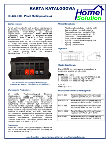 KARTA KATALOGOWA HS476-XXX - Panel Multioperatorski Zastosowanie: Charakterystyka: Panel Multioperatorski jest idealnym rozwiązaniem do montażu w Rozdzielniach Teletechnicznych w budownictwie wielorodzinnym jak również indywidualnym. Standardowo Panel HS476-222 wyposażony jest zgodnie z Rozporządzeniem MTBIGW z dnia 22.11.2012, w dwa adaptery światłowodowe SC/APC, w dwa gniazda komputerowe RJ45 Kat. 5e, oraz dwa adaptery typu „F”. Dzięki modularnej budowie panel może być konfigurowany zgodnie z wymaganiami Projektanta oraz Inwestora w dowolne interfejsy typu QuickPort w tym złącza F, złącza BNC, RJ45 Kat 5e, 6+ oraz 6A jak również gniazda HDMI czy adaptery światłowodowe LC lub SC. • • • • • • • • • Plastikowa konstrukcja – materiał UL94 Beznarzędziowy montaż modułów Pionowy lub poziomy montaż w TSM System montażu kompatybilny z HS Pojemność - 12 portów QuickPort Zintegrowane etykiety opisowe Zgodny z prawem Budowlanym §192e Zgodny z TIA568.C.2 Zgodny z PN-EN50173 Wymiary: Opcje dodatkowe: Panel HS476-xyz może zostać wyposażony w dodatkowe gniazda wg schematu: HS476-xyz – gdzie x – oznacza ilość modułów QuickPort RJ45 Kat. 5e y – oznacza ilość adapterów typu F 3.0 GHz z – oznacza ilość adapterów typu SC/APC HS476-222 Home Solution Panel Multioperatorski wyposażony w gniazda: 2xRJ45 Kat. 5e, 2xF, 2xSC/APC Wymagania Projektowe: W każdej Telekomunikacyjnej Skrzynce Mieszkaniowej należy zainstalować Panel Multioperatorski HS476-222, w którym będą zakończone zgodnie z Prawem Budowlanym wszystkie kable Teletechnicznej Infrastruktury Budynkowej. Panel powinien być modularny i umożliwiać montaż 12 gniazd z czego 6 gniazd jest przeznaczone dla operatorów, a pozostałe 6 stanowi zapas. Panel Multioperatorski musi być wyposażony minimum w 2xRJ45 Kat.5e, 2xF 3GHz, 2xSC/APC oraz umożliwiać zainstalowanie dodatkowych gniazd teletechnicznych. Panel musi posiadać etykiety opisowe umożliwiające prawidłowe opisanie połączeń. Połączenia powinny być identyfikowane po numerze lokalu oraz literach „A” i „B” x,y,z ≥ 2 oraz x+y+z ≤ 12 Przykładowe numery katalogowe: HS476-222 Panel Multioperatorski Home Solution wyposażony: 2xKat. 5e, 2xF, 2xSC/APC HS476-222.6 Panel Multioperatorski Home Solution wyposażony: 2xKat. 6+, 2xF, 2xSC/APC HS476-422 Panel Multioperatorski Home Solution wyposażony: 4xKat. 5e, 2xF, 2xSC/APC HS476-422.6 Panel Multioperatorski Home Solution wyposażony: 4xKat. 6+, 2xF, 2xSC/ HS476-642 Panel Multioperatorski Home Solution wyposażony: 6xKat. 5e, 4xF, 2xSC/APC Gwarancja Producent oferuje 3 letnią gwarancję produktową od daty oddania instalacji do użytkowania. Szczegóły na stronie www.homesolution.pl Home Solution – www.homesolution.pl; [email protected]