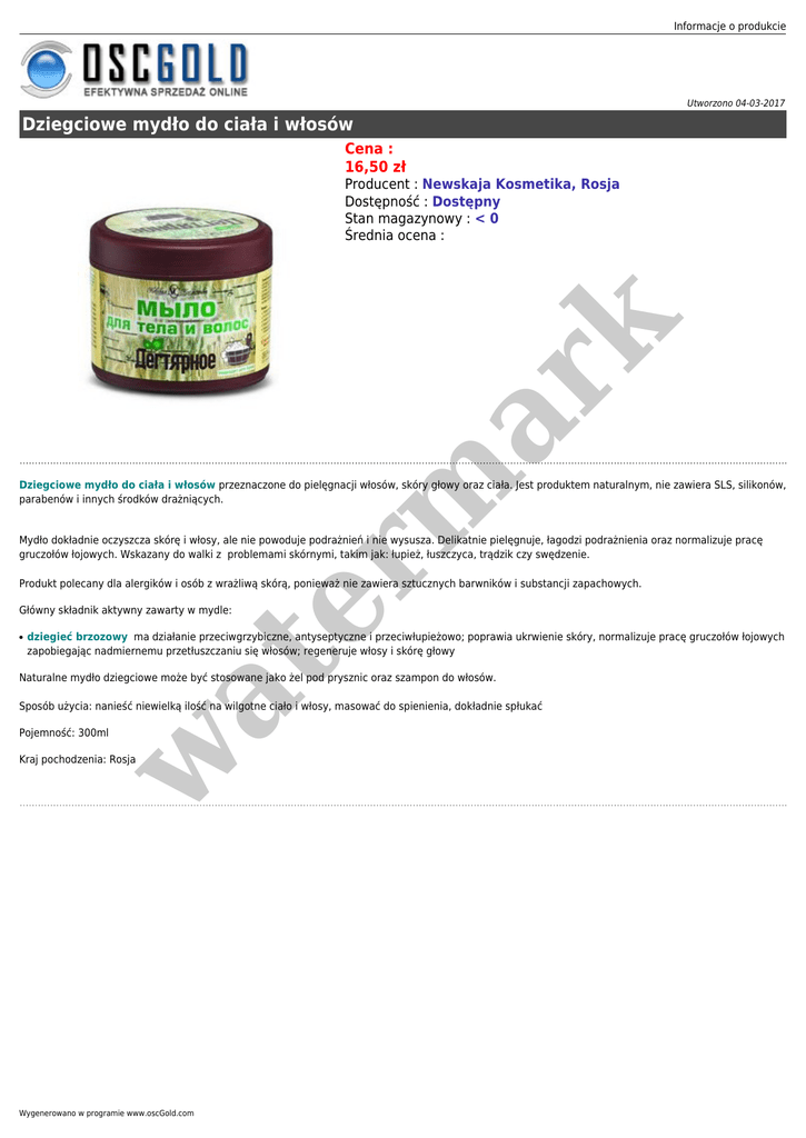 Informacje o produkcie Utworzono 04-03-2017 Dziegciowe mydło do ciała i włosów Cena : 16,50 zł er m ar k Producent : Newskaja Kosmetika, Rosja Dostępność : Dostępny Stan magazynowy : < 0 Średnia ocena : Dziegciowe mydło do ciała i włosów przeznaczone do pielęgnacji włosów, skóry głowy oraz ciała. Jest produktem naturalnym, nie zawiera SLS, silikonów, parabenów i innych środków drażniących. Mydło dokładnie oczyszcza skórę i włosy, ale nie powoduje podrażnień i nie wysusza. Delikatnie pielęgnuje, łagodzi podrażnienia oraz normalizuje pracę gruczołów łojowych. Wskazany do walki z problemami skórnymi, takim jak: łupież, łuszczyca, trądzik czy swędzenie. Produkt polecany dla alergików i osób z wrażliwą skórą, ponieważ nie zawiera sztucznych barwników i substancji zapachowych. Główny składnik aktywny zawarty w mydle: dziegieć brzozowy ma działanie przeciwgrzybiczne, antyseptyczne i przeciwłupieżowo; poprawia ukrwienie skóry, normalizuje pracę gruczołów łojowych zapobiegając nadmiernemu przetłuszczaniu się włosów; regeneruje włosy i skórę głowy at ● Naturalne mydło dziegciowe może być stosowane jako żel pod prysznic oraz szampon do włosów. Sposób użycia: nanieść niewielką ilość na wilgotne ciało i włosy, masować do spienienia, dokładnie spłukać w Pojemność: 300ml Kraj pochodzenia: Rosja Wygenerowano w programie www.oscGold.com