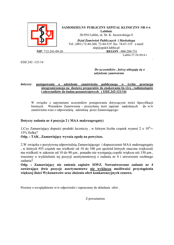 SAMODZIELNY PUBLICZNY SZPITAL KLINICZNY NR 4 w Lublinie 20-954 Lublin, ul. Dr. K. Jaczewskiego 8 NIP: 712-241-09-26 Dział Zamówień Publicznych i Marketingu Tel.: (081) 72-44-360, 72-44-519 fax: 74-67-155 e-mail: [email protected] REGON : 000-288-751 Lublin 27-10-2014 r. . EDZ.242 -121/14 Do uczestników , którzy ubiegają się o udzielenie zamówienia dotyczy: postępowanie o udzielenie zamówienia publicznego w trybie przetargu nieograniczonego na dostawę preparatów do znakowania In-vivo , radioizotopów i odczynników do badan pozaustrojowych ( EDZ.242-121/14) W związku z zapytaniami uczestników postępowania dotyczącymi treści Specyfikacji Istotnych Warunków Zamówienia - przesyłamy treść zapytań nadesłanych do w/w zamówienia wraz z odpowiedzią udzieloną przez Zamawiającego: Dotyczy zadania nr 4 pozycja 2 ( MAA makroagregaty) 1.Czy Zamawiający dopuści produkt leczniczy , w którym liczba cząstek wynosi 2 x 106+15% fiolkę? Odp. : TAK , Zamawiający wyraża zgodę na powyższe. 2.W związku z pozytywną odpowiedzią Zamawiającego i dopuszczenie MAA makroagregaty , w których 955 cząstek ma wielkość od 10 do 100 µm spośród których znaczna większość ma wielkość w zakresie od 10 do 90 µm , ponadto nie występują cząstki większe niż 150 µm , wnosimy o wydzielenie tej pozycji asortymentowej z zadania nr 4 i utworzenie osobnego zadania? Odp. : Zamawiający nie zmienia zapisów SIWZ. Nowoutworzone zadanie nr 4 zawierające dwie pozycje asortymentowe nie wyklucza możliwości przystąpienia większej ilości Wykonawców oraz złożenia ofert konkurencyjnych cenowo. Prosimy o uwzględnienie w/w odpowiedzi i zapraszamy do składania ofert . Z poważaniem