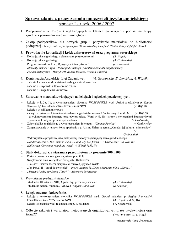Sprawozdanie z pracy zespołu nauczycieli języka angielskiego semestr I - r. szk. 2006 / 2007 1. Przeprowadzenie testów klasyfikacyjnych w klasach pierwszych i podział na grupy, zgodnie z poziomem wiedzy i umiejętności. 2. Zakup podręczników dla nowych grup i pozyskanie materiałów do biblioteczki podręcznej - kasety i materiały uzupełniające: ‘Gramatyka dla gimnazjum’, ‘British history highlight’, słowniki 3. Prowadzenie konsultacji i kółek zainteresowań oraz programu autorskiego - Kółko języka angielskiego z elementami przyrodniczymi (A. Wójcik) Kółko języka angielskiego (A. Grabowska) Program autorski w Ic - „Brytyjczycy i Amerykanie” (E. Lendzion) Elementy historii Anglii – Bitwa pod Hastings, powstanie kościoła anglikańskiego Postaci historyczne – Henryk VII, Robert Wallace, Winston Churchil 4. Kontynuacja Angielskiej Ligi Zadaniowej. - (A. Grabowska, E. Lendzion, A. Wójcik) zadanie 1 - praca ze słownikiem i wzbogacenie słownictwa zadanie 2 – wprawki z tłumaczenia tekstu zadanie 3 – zagadnienia kulturowe 5. Stosowanie metod aktywizujących na lekcjach i zajęciach pozalekcyjnych. - - Lekcje w kl.3a, 1b, z wykorzystaniem słownika WORDPOWER wyd. Oxford z udziałem p. Reginy Stawnickiej, konsultanta POLANGLO – OXFORD (A. Wójcik) Lekcje z w sali komputerowej: - z wykorzystaniem Internetu– utrwalanie angielskich czasowników frazowych w kl. 3a (A. Wójcik) - z wykorzystaniem Internetu oraz edytora tekstu Word w kl. IIa– strony z ćwiczeniami interakcyjnymi, panorama Londynu; pisanie opowiadania (A Grabowska) Zajęcia kółka angielskiego z wykorzystaniem Internetu – ‘Canada Factfile’ (A Grabowska) Zorganizowanie w ramach kółka spotkania z p. Aisling Usher na temat „Kanada, jej kultura i mieszkańcy” (A. Grabowska) Wykorzystanie projektów jako praktycznej metody wspierającej naukę języka obcego Holiday Brochure, The world in 2050, Poland, My best friend – A. Grabowska – Ib, IIIb, IIa Halloween, Christmas round the world - A. Wójcik kl.Ib, IIc 6. Stała dekoracja, związana z przedmiotem na poziomie 700 i 500 - Plakat / broszura wakacyjna - wystawa prac kl Ib Świętowanie dnia Wszystkich Świętych i Hallowe’en „Polska” – nazwa naszej ojczyzny w różnych językach świata „Jan Paweł II – drogi do świętości” – prace uczniów kl. IIc po obejrzeniu filmu „Karol...” „Święty Mikołaj czy Santa Claus?” – dekoracja świąteczna 7. Prowadzenie praktyk studenckich - studentka III roku KKNJO, 3 godz. tyg. przez cały semestr studentka Naucz. Studium J. Obcych ‘English Unlimited’ (A. Grabowska) (E Lendzion) 8. Lekcje otwarte i koleżeńskie, - Lekcje z wykorzystaniem słownika WORDPOWER wyd. Oxford udziałem p. Reginy Stawnickiej, konsultanta POLANGLO – OXFORD (A. Wójcik - kl.3a, 1b) Lekcja koleżeńska w kl. Id z udziałem p. E. Saldanha ( A. Grabowska) 9. Odbycie szkoleń i warsztatów metodycznych organizowanych przez wydawnictwa oraz INSETT (wszyscy naucz. j. ang.) opracowała Anna Grabowska
