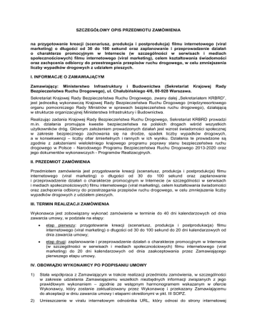 SZCZEGÓŁOWY OPIS PRZEDMIOTU ZAMÓWIENIA na przygotowanie kreacji (scenariusz, produkcja i postprodukcja) filmu internetowego (viral marketing) o długości od 30 do 100 sekund oraz zaplanowanie i przeprowadzenie działań o charakterze promocyjnym w Internecie (w szczególności w serwisach i mediach społecznościowych) filmu internetowego (viral marketing), celem kształtowania świadomości oraz zachęcenia odbiorcy do przestrzegania przepisów ruchu drogowego, w celu zmniejszenia liczby wypadków drogowych z udziałem pieszych. I. INFORMACJE O ZAMAWIAJĄCYM Zamawiający: Ministerstwo Infrastruktury i Budownictwa (Sekretariat Krajowej Bezpieczeństwa Ruchu Drogowego), ul. Chałubińskiego 4/6, 00-928 Warszawa. Rady Sekretariat Krajowej Rady Bezpieczeństwa Ruchu Drogowego, zwany dalej „Sekretariatem KRBRD”, jest jednostką wykonawczą Krajowej Rady Bezpieczeństwa Ruchu Drogowego (międzyresortowego organu pomocniczego Rady Ministrów w sprawach bezpieczeństwa ruchu drogowego), działającą w strukturze organizacyjnej Ministerstwa Infrastruktury i Budownictwa. Realizując zadania Krajowej Rady Bezpieczeństwa Ruchu Drogowego, Sekretariat KRBRD prowadzi m.in. działania promujące kwestie bezpieczeństwa na polskich drogach wśród wszystkich użytkowników dróg. Głównym założeniem prowadzonych działań jest wzrost świadomości społecznej w zakresie bezpiecznego zachowania się na drodze, spadek liczby wypadków drogowych, a w konsekwencji – liczby ofiar śmiertelnych i rannych w ich wyniku. Działania te prowadzone są zgodnie z założeniami wieloletniego krajowego programu poprawy stanu bezpieczeństwa ruchu drogowego w Polsce - Narodowego Programu Bezpieczeństwa Ruchu Drogowego 2013-2020 oraz jego dokumentów wykonawczych - Programów Realizacyjnych. II. PRZEDMIOT ZAMÓWIENIA Przedmiotem zamówienia jest przygotowanie kreacji (scenariusz, produkcja i postprodukcja) filmu internetowego (viral marketing) o długości od 30 do 100 sekund oraz zaplanowanie i przeprowadzenie działań o charakterze promocyjnym w Internecie (w szczególności w serwisach i mediach społecznościowych) filmu internetowego (viral marketing), celem kształtowania świadomości oraz zachęcenia odbiorcy do przestrzegania przepisów ruchu drogowego, w celu zmniejszenia liczby wypadków drogowych z udziałem pieszych. III. TERMIN REALIZACJI ZAMÓWIENIA Wykonawca jest zobowiązany wykonać zamówienie w terminie do 40 dni kalendarzowych od dnia zawarcia umowy, w podziale na etapy: etap pierwszy: przygotowanie kreacji (scenariusz, produkcja i postprodukacja) filmu internetowego (viral marketing) o długości od 30 do 100 sekund do 20 dni kalendarzowych od dnia zawarcia umowy; etap drugi: zaplanowanie i przeprowadzenie działań o charakterze promocyjnym w Internecie (w szczególności w serwisach i mediach społecznościowych) filmu internetowego (viral marketing) do 20 dni kalendarzowych od dnia zaakceptowania przez Zamawiającego pierwszego etapu umowy. IV. OBOWIĄZKI WYKONAWCY PO PODPISANIU UMOWY 1) Stała współpraca z Zamawiającym w trakcie realizacji przedmiotu zamówienia, w szczególności w zakresie udzielania Zamawiającemu wszelkich niezbędnych informacji związanych z jego prawidłowym wykonaniem – zgodnie ze wstępnym harmonogramem wskazanym w ofercie Wykonawcy, który zostanie zaktualizowany przez Wykonawcę i przekazany Zamawiającemu do akceptacji w dniu zawarcia umowy i etapami określonymi w pkt. III SOPZ. 2) Umieszczenie w viralu internetowym odnośnika URL, który odnosi do strony internetowej www.krbrd.gov.pl, otagowanym w sposób umożliwiający śledzenie ruchu na stronie. 3) Przygotowany film internetowy (viral marketing), powinien uwzględnić wersję dla osób niesłyszących i niedosłyszących (co najmniej transkrypcja tekstowa). 4) Przygotowanie materiału z planu zdjęciowego (making-of) o długości min. 120 sekund, przedstawiającego powstawanie filmu internetowego (viral marketing), który zostanie przekazany wraz z raportem z wykonania przedmiotu umowy przy odbiorze przedmiotu zamówienia. 5) Zaplanowanie i przeprowadzenie działań o charakterze promocyjnym w Internecie (w szczególności w serwisach i mediach społecznościowych) filmu internetowego (viral marketing) przez minimalnie 10 dni kalendarzowych od dnia zaakceptowania przez Zamawiającego pierwszego etapu umowy. 6) Dostarczenie Zamawiającemu wszystkich wykonanych elementów przedmiotu zamówienia na płycie DVD i przenośnym dysku zewnętrznym (pendrive) w formacie AVI, MOV w rozdzielczości (format High Definition). 7) Dostarczenie Zamawiającemu raportu z wykonania przedmiotu umowy. Raport będzie zawierał opis z przeprowadzenia działań o charakterze promocyjnym w Internecie (serwisach, mediach społecznościowych) filmu internetowego (viral marketing) oraz przygotowanie materiału z planu zdjęciowego (making-of) o długości min. 120 sekund, przedstawiającego powstawanie filmu internetowego (viral marketing). 8) Przekazanie Zamawiającemu autorskich praw majątkowych do wszystkich utworów (i ich projektów) powstałych w związku z realizacją przedmiotu zamówienia oraz udzielenie Zamawiającemu prawa zależnego do tych utworów. 9) Wykonawca będzie zobowiązany do osobistego stawiennictwa w siedzibie Zamawiającego każdorazowo, gdy Zamawiający uzna to za niezbędne do prawidłowej realizacji zamówienia. 10) Wykonawca będzie zobowiązany do odbierania oraz dostarczania na własny koszt od i do Zamawiającego wszelkich materiałów niezbędnych do realizacji zamówienia. 11) Współpraca pomiędzy Zamawiającym a Wykonawcą będzie polegała na kontaktach bezpośrednich, telefonicznych i mailowych, a wszelkie materiały związane z realizacją zamówienia w miarę możliwości technicznych przekazywane będą na bieżąco za pośrednictwem poczty elektronicznej w plikach .doc. 12) Wykonawca jest zobowiązany do sprawnej i terminowej realizacji zamówienia, w tym uwzględniania w