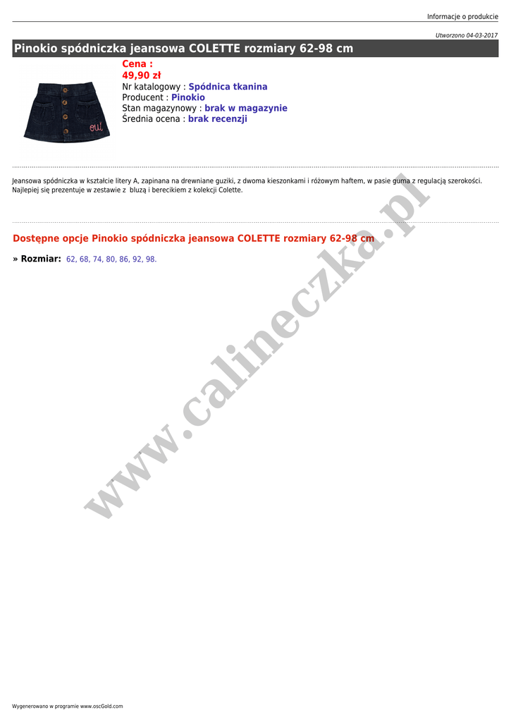 Informacje o produkcie Utworzono 04-03-2017 Pinokio spódniczka jeansowa COLETTE rozmiary 62-98 cm Cena : 49,90 zł Nr katalogowy : Spódnica tkanina Producent : Pinokio Stan magazynowy : brak w magazynie Średnia ocena : brak recenzji zk a. pl Jeansowa spódniczka w kształcie litery A, zapinana na drewniane guziki, z dwoma kieszonkami i różowym haftem, w pasie guma z regulacją szerokości. Najlepiej się prezentuje w zestawie z bluzą i berecikiem z kolekcji Colette. Dostępne opcje Pinokio spódniczka jeansowa COLETTE rozmiary 62-98 cm w w w .c al in ec » Rozmiar: 62, 68, 74, 80, 86, 92, 98. Wygenerowano w programie www.oscGold.com