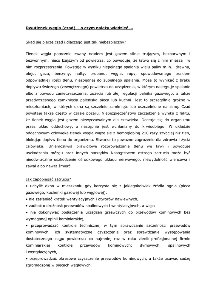 Dwutlenek węgla (czad) – o czym należy wiedzieć … Skąd się bierze czad i dlaczego jest tak niebezpieczny? Tlenek węgla potocznie zwany czadem jest gazem silnie trującym, bezbarwnym i bezwonnym, nieco lżejszym od powietrza, co powoduje, że łatwo się z nim miesza i w nim rozprzestrzenia. Powstaje w wyniku niepełnego spalania wielu paliw m.in.: drewna, oleju, gazu, benzyny, nafty, propanu, węgla, ropy, spowodowanego brakiem odpowiedniej ilości tlenu, niezbędnej do zupełnego spalania. Może to wynikać z braku dopływu świeżego (zewnętrznego) powietrza do urządzenia, w którym następuje spalanie albo z powodu zanieczyszczenia, zużycia lub złej regulacji palnika gazowego, a także przedwczesnego zamknięcia paleniska pieca lub kuchni. Jest to szczególnie groźne w mieszkaniach, w których okna są szczelnie zamknięte lub uszczelnione na zimę. Czad powstaje także często w czasie pożaru. Niebezpieczeństwo zaczadzenia wynika z faktu, że tlenek węgla jest gazem niewyczuwalnym dla człowieka. Dostaje się do organizmu przez układ oddechowy, a następnie jest wchłaniany do krwioobiegu. W układzie oddechowym człowieka tlenek węgla wiąże się z hemoglobiną 210 razy szybciej niż tlen, blokując dopływ tlenu do organizmu. Stwarza to poważne zagrożenie dla zdrowia i życia człowieka. Uniemożliwia prawidłowe rozprowadzanie tlenu we krwi i powoduje uszkodzenia mózgu oraz innych narządów Następstwem ostrego zatrucia może być nieodwracalne uszkodzenie ośrodkowego układu nerwowego, niewydolność wieńcowa i zawał albo nawet śmierć. Jak zapobiegać zatruciu? • uchylić okno w mieszkaniu gdy korzysta się z jakiegokolwiek źródła ognia (pieca gazowego, kuchenki gazowej lub węglowej), • nie zasłaniać kratek wentylacyjnych i otworów nawiewnych, • zadbać o drożność przewodów spalinowych i wentylacyjnych, a więc: • nie dokonywać podłączenia urządzeń grzewczych do przewodów kominowych bez wymaganej opinii kominiarskiej, • przeprowadzać kontrole techniczne, w tym sprawdzanie szczelności przewodów kominowych, ich systematyczne czyszczenie oraz sprawdzanie występowania dostatecznego ciągu powietrza; co najmniej raz w roku zlecić profesjonalnej firmie kominiarskiej kontrolę przewodów kominowych: dymowych, spalinowych i wentylacyjnych, • przeprowadzać okresowe czyszczenie przewodów kominowych, a także usuwać sadzę zgromadzoną w piecach węglowych, • użytkować sprawne techniczne urządzenia, w których odbywa się proces spalania, zgodnie z instrukcją producenta: kontrolować stan techniczny urządzeń grzewczych, • stosować urządzenia posiadające stosowne dopuszczenia w zakresie wprowadzenia do obrotu; w sytuacjach wątpliwych należy żądać okazania wystawionej przez producenta lub importera urządzenia tzw. deklaracji zgodności, czyli dokumentu zawierającego informacje o specyfikacji technicznej oraz przeznaczeniu i zakresie stosowania danego urządzenia, • w przypadku wymiany okien na nowe, sprawdzić poprawność działania wentylacji, ponieważ nowe okna są najczęściej o wiele bardziej szczelne w stosunku do wcześniej stosowanych w budynku i mogą pogarszać wentylację, • systematycznie sprawdzać ciąg powietrza, np. poprzez przykładanie kartki papieru do otworu, bądź kratki wentylacyjnej; jeśli nic nie zakłóca wentylacji, kartka powinna przywrzeć do wyżej wspomnianego otworu lub kratki, • często wietrzyć pomieszczenie, w których odbywa się proces spalania (kuchnie, łazienki wyposażone w termy gazowe), a najlepiej zapewnić, nawet niewielkie, rozszczelnienie okien, • nie bagatelizować objawów duszności, bólów i zawrotów głowy, nudności, wymiotów, osłabienia, przyspieszenia czynności serca i oddychania, gdyż mogą być sygnałem, że ulegamy zatruciu czadem; w takiej sytuacji należy natychmiast przewietrzyć pomieszczenie, w którym się znajdujemy i zasięgnąć porady lekarskiej. Jakie są objawy zatrucia tlenkiem węgla? • ból głowy, • zawroty głowy, • ogólne zmęczenie, • duszność, • trudnościami z oddychaniem, oddech przyspieszony, nieregularny • senność, • nudności. Jak pomóc przy zatruciu tlenkiem węgla? • należy natychmiast zapewnić dopływ świeżego, czystego powietrza, • jak najszybciej wynieść osobę poszkodowaną w bezpieczne miejsce, na świeże powietrze, • rozluźnić poszkodowanemu ubranie, ale nie rozbierać go, gdyż nie można doprowadzić do jego przemarznięcia • wezwać służby ratownicze (pogotowie ratunkowe – tel. 999, straż pożarna – tel. 998 lub112) oraz pogotowie gazowe. Jeśli po wyniesieniu na świeże powietrze zaczadzony nie oddycha, należy niezwłocznie przystąpić do wykonania sztucznego oddychania i masażu serca. Gdy poczujesz gaz: • zawiadom jak najszybciej pogotowie gazowe i administrację, • powiadom sąsiadów, • nie włączaj światła ani żadnych urządzeń elektrycznych, • nie zapalaj zapałek ani zapalniczek, • zamknij zawór gazu w mieszkaniu, • otwórz szeroko okno, • wyjdź na zewnątrz budynku.