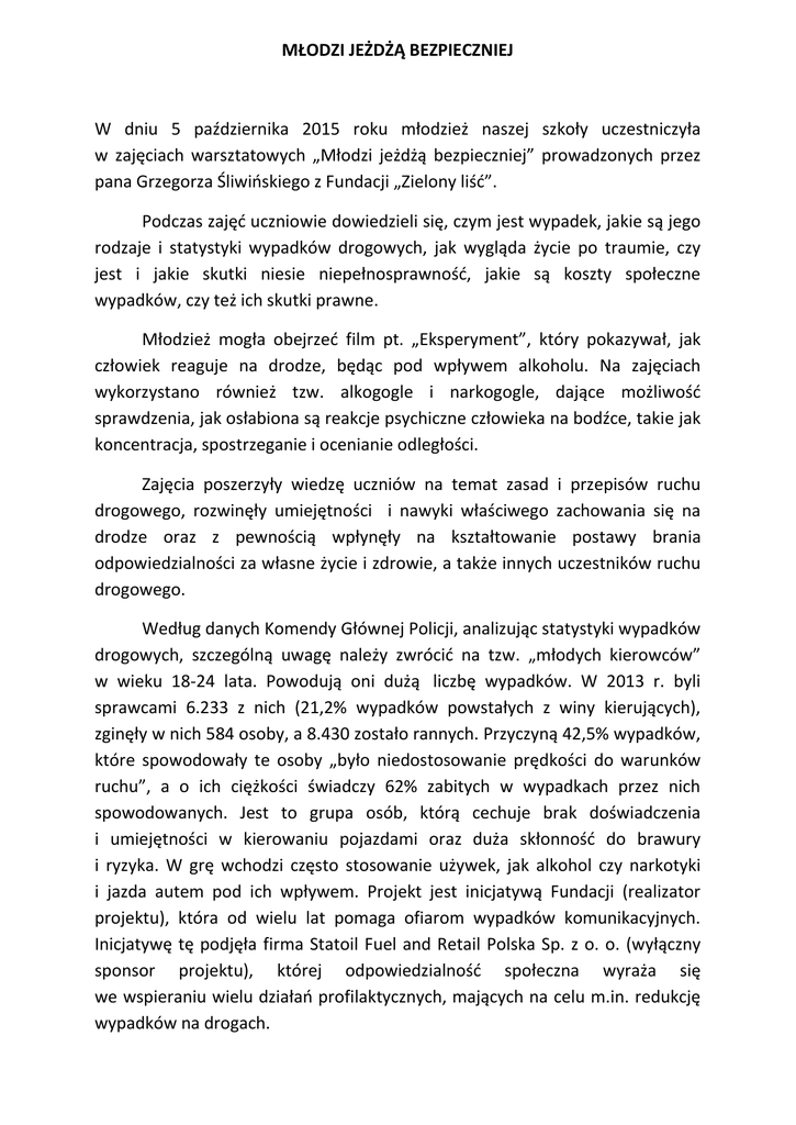 MŁODZI JEŻDŻĄ BEZPIECZNIEJ W dniu 5 października 2015 roku młodzież naszej szkoły uczestniczyła w zajęciach warsztatowych „Młodzi jeżdżą bezpieczniej” prowadzonych przez pana Grzegorza Śliwińskiego z Fundacji „Zielony liść”. Podczas zajęć uczniowie dowiedzieli się, czym jest wypadek, jakie są jego rodzaje i statystyki wypadków drogowych, jak wygląda życie po traumie, czy jest i jakie skutki niesie niepełnosprawność, jakie są koszty społeczne wypadków, czy też ich skutki prawne. Młodzież mogła obejrzeć film pt. „Eksperyment”, który pokazywał, jak człowiek reaguje na drodze, będąc pod wpływem alkoholu. Na zajęciach wykorzystano również tzw. alkogogle i narkogogle, dające możliwość sprawdzenia, jak osłabiona są reakcje psychiczne człowieka na bodźce, takie jak koncentracja, spostrzeganie i ocenianie odległości. Zajęcia poszerzyły wiedzę uczniów na temat zasad i przepisów ruchu drogowego, rozwinęły umiejętności i nawyki właściwego zachowania się na drodze oraz z pewnością wpłynęły na kształtowanie postawy brania odpowiedzialności za własne życie i zdrowie, a także innych uczestników ruchu drogowego. Według danych Komendy Głównej Policji, analizując statystyki wypadków drogowych, szczególną uwagę należy zwrócić na tzw. „młodych kierowców” w wieku 18-24 lata. Powodują oni dużą liczbę wypadków. W 2013 r. byli sprawcami 6.233 z nich (21,2% wypadków powstałych z winy kierujących), zginęły w nich 584 osoby, a 8.430 zostało rannych. Przyczyną 42,5% wypadków, które spowodowały te osoby „było niedostosowanie prędkości do warunków ruchu”, a o ich ciężkości świadczy 62% zabitych w wypadkach przez nich spowodowanych. Jest to grupa osób, którą cechuje brak doświadczenia i umiejętności w kierowaniu pojazdami oraz duża skłonność do brawury i ryzyka. W grę wchodzi często stosowanie używek, jak alkohol czy narkotyki i jazda autem pod ich wpływem. Projekt jest inicjatywą Fundacji (realizator projektu), która od wielu lat pomaga ofiarom wypadków komunikacyjnych. Inicjatywę tę podjęła firma Statoil Fuel and Retail Polska Sp. z o. o. (wyłączny sponsor projektu), której odpowiedzialność społeczna wyraża się we wspieraniu wielu działań profilaktycznych, mających na celu m.in. redukcję wypadków na drogach.