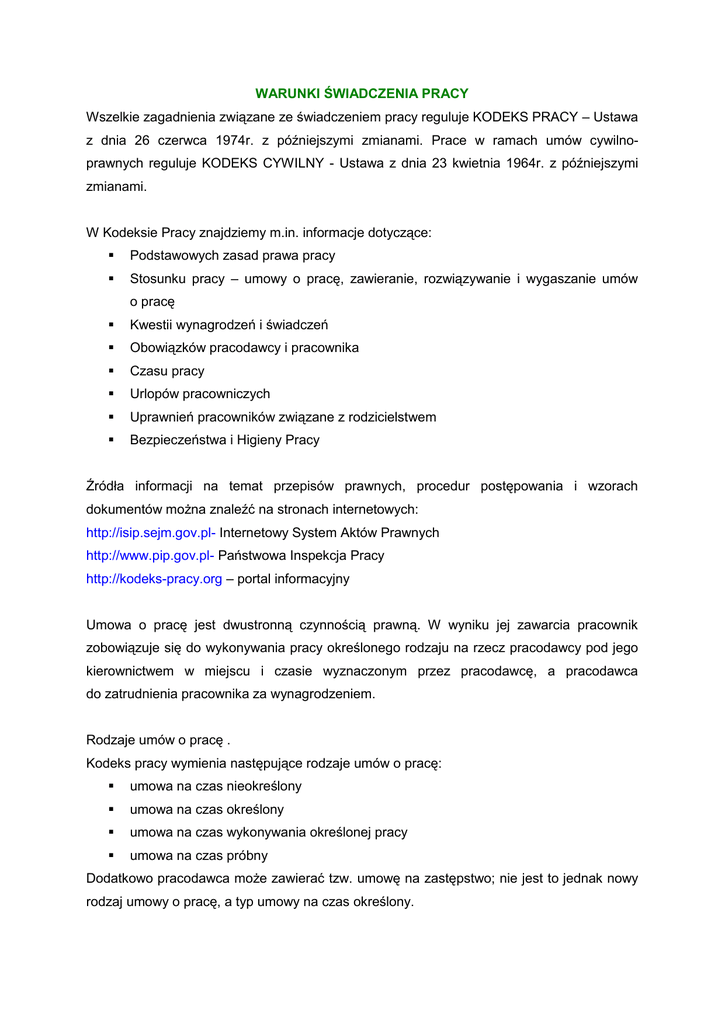 WARUNKI ŚWIADCZENIA PRACY Wszelkie zagadnienia związane ze świadczeniem pracy reguluje KODEKS PRACY – Ustawa z dnia 26 czerwca 1974r. z późniejszymi zmianami. Prace w ramach umów cywilnoprawnych reguluje KODEKS CYWILNY - Ustawa z dnia 23 kwietnia 1964r. z późniejszymi zmianami. W Kodeksie Pracy znajdziemy m.in. informacje dotyczące: Podstawowych zasad prawa pracy Stosunku pracy – umowy o pracę, zawieranie, rozwiązywanie i wygaszanie umów o pracę Kwestii wynagrodzeń i świadczeń Obowiązków pracodawcy i pracownika Czasu pracy Urlopów pracowniczych Uprawnień pracowników związane z rodzicielstwem Bezpieczeństwa i Higieny Pracy Źródła informacji na temat przepisów prawnych, procedur postępowania i wzorach dokumentów można znaleźć na stronach internetowych: http://isip.sejm.gov.pl- Internetowy System Aktów Prawnych http://www.pip.gov.pl- Państwowa Inspekcja Pracy http://kodeks-pracy.org – portal informacyjny Umowa o pracę jest dwustronną czynnością prawną. W wyniku jej zawarcia pracownik zobowiązuje się do wykonywania pracy określonego rodzaju na rzecz pracodawcy pod jego kierownictwem w miejscu i czasie wyznaczonym przez pracodawcę, a pracodawca do zatrudnienia pracownika za wynagrodzeniem. Rodzaje umów o pracę . Kodeks pracy wymienia następujące rodzaje umów o pracę: umowa na czas nieokreślony umowa na czas określony umowa na czas wykonywania określonej pracy umowa na czas próbny Dodatkowo pracodawca może zawierać tzw. umowę na zastępstwo; nie jest to jednak nowy rodzaj umowy o pracę, a typ umowy na czas określony. Tylko umowa na czas nieokreślony jest umową bezterminową. Pozostałe zawiera się na określony czas. Umowa na czas nieokreślony brak określonego z góry czasu trwania stosunku pracy; istnieje podporządkowanie pracownika pracodawcy; pracodawca ponosi ryzyko związane z ewentualnymi szkodami wyrządzonymi przez pracownika podmiotom zewnętrznym; najbardziej korzystna z punktu widzenia pracownika, w związku z tym niesie największe obciążenia dla pracodawcy; Umowa na czas określony zawierana na z góry określony okres; w okresie trwania umowy istnieje podporządkowanie pracownika pracodawcy; pracodawca ponosi ryzyko związane z ewentualnymi szkodami wyrządzonymi przez pracownika podmiotom zewnętrznym w czasie trwania umowy; może być rozwiązana za wypowiedzeniem, w przypadku, gdy staż pracy u danego pracodawcy jest krótszy niż sześć miesięcy, to okres wypowiedzenia umowy na czas określony (tak jak i umowy na czas nieokreślony) wyniesie dwa tygodnie. Gdy staż wynosi od pół roku do mniej niż trzech lat okres wypowiedzenia to miesiąc, a trzy miesiące przy co najmniej trzyletnim stażu. Jeśli okres zatrudnienia na podstawie umowy na czas określony będzie dłuższy niż limit 33 miesięcy, lub jeśli łączna liczba zawartych umów okresowych będzie wyższa niż trzy, pracownik od następnego dnia od dnia upływu 33-miesięcznego limitu trwania tych umów, będzie zatrudniony na podstawie umowy na czas nieokreślony. - rodzajem tej umowy jest umowa sezonowa - czas jej trwania ograniczony jest do jednego sezonu. Umowa na okres próbny umowa ta poprzedza zawarcie umowy o pracę; łączny okres próbny u jednego pracodawcy nie może przekroczyć 3 miesięcy; umowa ta pozwala sprawdzić pracodawcy umiejętności i kwalifikacje pracownika na danym stanowisku; z kolei pracownikowi daje możliwość oceny, czy dana praca spełnia jego oczekiwania; istnieje możliwość rozwiązania umowy na okres próbny za wypowiedzeniem – okres wypowiedzenia zależy od czasu trwania umowy (jeśli okres próbny trwa mniej niż 2 tygodnie, to okres wypowiedzenia wynosi 3 dni; jeśli okres próbny trwa powyżej 2 tygodni, ale krócej niż 3 miesiące - okres wypowiedzenia wynosi 1 tydzień; jeśli okres próbny trwa 3 miesiące - okres wypowiedzenia wynosi 2 tygodnie). Umowa na zastępstwo na czas nieobecności pracownika w pracy, może być oznaczony konkretny termin lub do czasu powrotu właściwego pracownika; może zostać rozwiązana za 3-dniowym wypowiedzeniem. Umowa na czas wykonania określonej pracy termin zakończenia trwania umowy nie jest dokładnie określony; dotyczy to umów na pracę sezonową lub cykliczną; umowa jest zawierana w celu wykonania określonego zadania (pracy); w okresie trwania umowy pracownik jest podporządkowany pracodawcy nie przewiduje rozwiązania stosunku pracy za wypowiedzeniem. Elementy umowy o pracę Umowa o pracę określa strony umowy, rodzaj umowy, datę jej zawarcia oraz warunki pracy i płacy, w szczególności: rodzaj pracy, miejsce wykonywania pracy, wynagrodzenie za pracę odpowiadające rodzajowi pracy, ze wskazaniem składników wynagrodzenia, wymiar czasu pracy, termin rozpoczęcia pracy. Tryb rozwiązywania umowy o pracę Umowa o pracę rozwiązuje się: na mocy porozumienia stron, przez oświadczenie jednej ze stron z zachowaniem okresu wypowiedzenia (rozwiązanie umowy o pracę za wypowiedzeniem), przez oświadczenie jednej ze stron bez zachowania okresu wypowiedzenia (rozwiązanie umowy o pracę bez wypowiedzenia), z upływem czasu, na który była zawarta, z dniem ukończenia pracy, dla której wykonania była zawarta. Oprócz tego stosunek pracy powstały na podstawie umowy może wygasnąć: w wyniku śmierci pracodawcy lub pracownika. z upływem 3 miesięcy nieobecności pracownika w pracy, np. z powodu tymczasowego aresztowania, chyba że pracodawca rozwiązał wcześniej umowę o pracę bez wypowiedzenia z winy pracownika Wynagrodzenie za pracę Wynagrodzenie za pracę powinno być tak ustalone, aby odpowiadało w szczególności rodzajowi wykonywanej pracy i kwalifikacjom wymaganym przy jej wykonywaniu, a także uwzględniało ilość i jakość świadczonej pracy. Płaca minimalna - najniższa z możliwych płac, najczęściej ustalana na drodze prawnej przez dane państwo. W Polsce minimalne wynagrodzenie ustalane jest corocznie na podstawie ustawy z 
