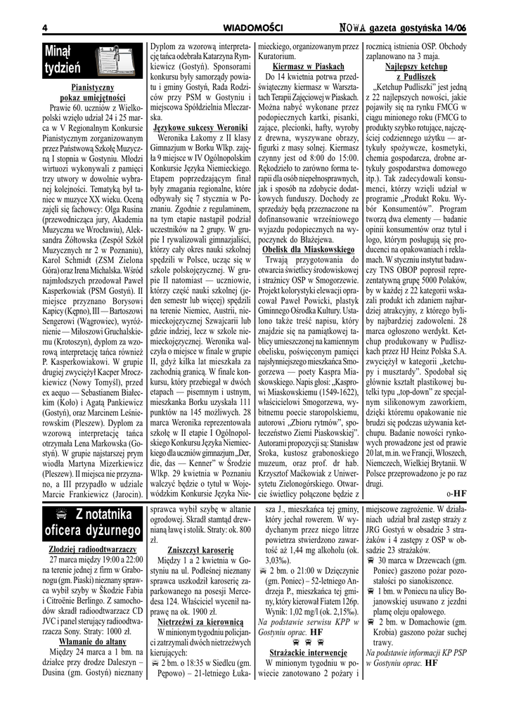 4 Min¹³ tydzieñ WIADOMOCI 4 4 Pianistyczny pokaz umiejêtnoci Prawie 60. uczniów z Wielkopolski wziê³o udzia³ 24 i 25 marca w V Regionalnym Konkursie Pianistycznym zorganizowanym przez Pañstwow¹ Szko³ê Muzyczn¹ I stopnia w Gostyniu. M³odzi wirtuozi wykonywali z pamiêci trzy utwory w dowolnie wybranej kolejnoci. Tematyk¹ by³ taniec w muzyce XX wieku. Ocen¹ zajêli siê fachowcy: Olga Rusina (przewodnicz¹ca jury, Akademia Muzyczna we Wroc³awiu), Aleksandra ¯ó³towska (Zespó³ Szkó³ Muzycznych nr 2 w Poznaniu), Karol Schmidt (ZSM Zielona Góra) oraz Irena Michalska. Wród najm³odszych przodowa³ Pawe³ Kasperkowiak (PSM Gostyñ). II miejsce przyznano Borysowi Kapicy (Kêpno), III Bartoszowi Sengerowi (W¹growiec), wyró¿nienie Mi³oszowi Gruchalskiemu (Krotoszyn), dyplom za wzorow¹ interpretacjê tañca równie¿ P. Kasperkowiakowi. W grupie drugiej zwyciê¿y³ Kacper Mroczkiewicz (Nowy Tomyl), przed ex aequo Sebastianem Bia³eckim (Ko³o) i Agat¹ Pankiewicz (Gostyñ), oraz Marcinem Lenierowskim (Pleszew). Dyplom za wzorow¹ interpretacjê tañca otrzyma³a Lena Markowska (Gostyñ). W grupie najstarszej prym wiod³a Martyna Mizerkiewicz (Pleszew). II miejsca nie przyznano, a III przypad³o w udziale Marcie Frankiewicz (Jarocin). p Z notatnika oficera dy¿urnego Z³odziej radioodtwarzaczy 27 marca miêdzy 19:00 a 22:00 na terenie jednej z firm w Grabonogu (gm. Piaski) nieznany sprawca wybi³ szyby w kodzie Fabia i Citroënie Berlingo. Z samochodów skrad³ radioodtwarzacz CD JVC i panel steruj¹cy radioodtwarzacza Sony. Straty: 1000 z³. W³amanie do altany Miêdzy 24 marca a 1 bm. na dzia³ce przy drodze Daleszyn Dusina (gm. Gostyñ) nieznany NOWA gazeta gostyñska 14/06 Dyplom za wzorow¹ interpretacjê tañca odebra³a Katarzyna Rymkiewicz (Gostyñ). Sponsorami konkursu by³y samorz¹dy powiatu i gminy Gostyñ, Rada Rodziców przy PSM w Gostyniu i miejscowa Spó³dzielnia Mleczarska. Jêzykowe sukcesy Weroniki Weronika £akomy z II klasy Gimnazjum w Borku Wlkp. zajê³a 9 miejsce w IV Ogólnopolskim Konkursie Jêzyka Niemieckiego. Etapem poprzedzaj¹cym fina³ by³y zmagania regionalne, które odbywa³y siê 7 stycznia w Poznaniu. Zgodnie z regulaminem, na tym etapie nast¹pi³ podzia³ uczestników na 2 grupy. W grupie I rywalizowali gimnazjalici, którzy ca³y okres nauki szkolnej spêdzili w Polsce, ucz¹c siê w szkole polskojêzycznej. W grupie II natomiast uczniowie, którzy czêæ nauki szkolnej (jeden semestr lub wiêcej) spêdzili na terenie Niemiec, Austrii, niemieckojêzycznej Szwajcarii lub gdzie indziej, lecz w szkole niemieckojêzycznej. Weronika walczy³a o miejsce w finale w grupie II, gdy¿ kilka lat mieszka³a za zachodni¹ granic¹. W finale konkursu, który przebiega³ w dwóch etapach pisemnym i ustnym, mieszkanka Borku uzyska³a 111 punktów na 145 mo¿liwych. 28 marca Weronika reprezentowa³a szko³ê w II etapie I Ogólnopolskiego Konkursu Jêzyka Niemieckiego dla uczniów gimnazjum Der, die, das Kenner w rodzie Wlkp. 29 kwietnia w Poznaniu walczyæ bêdzie o tytu³ w Wojewódzkim Konkursie Jêzyka Nie- mieckiego, organizowanym przez Kuratorium. Kiermasz w Piaskach Do 14 kwietnia potrwa przedwi¹teczny kiermasz w Warsztatach Terapii Zajêciowej w Piaskach. Mo¿na nabyæ wykonane przez podopiecznych kartki, pisanki, zaj¹ce, plecionki, hafty, wyroby z drewna, wyszywane obrazy, figurki z masy solnej. Kiermasz czynny jest od 8:00 do 15:00. Rêkodzie³o to zarówno forma terapii dla osób niepe³nosprawnych, jak i sposób na zdobycie dodatkowych funduszy. Dochody ze sprzeda¿y bêd¹ przeznaczone na dofinansowanie wrzeniowego wyjazdu podopiecznych na wypoczynek do B³a¿ejewa. Obelisk dla Miaskowskiego Trwaj¹ przygotowania do otwarcia wietlicy rodowiskowej i stra¿nicy OSP w Smogorzewie. Projekt kolorystyki elewacji opracowa³ Pawe³ Powicki, plastyk Gminnego Orodka Kultury. Ustalono tak¿e treæ napisu, który znajdzie siê na pami¹tkowej tablicy umieszczonej na kamiennym obelisku, powiêconym pamiêci najs³ynniejszego mieszkañca Smogorzewa poety Kaspra Miaskowskiego. Napis g³osi: Kasprowi Miaskowskiemu (1549-1622), w³acicielowi Smogorzewa, wybitnemu poecie staropolskiemu, autorowi Zbioru rytmów, spo³eczeñstwo Ziemi Piaskowskiej. Autorami propozycji s¹: Stanis³aw Sroka, kustosz grabonoskiego muzeum, oraz prof. dr hab. Krzysztof Maækowiak z Uniwersytetu Zielonogórskiego. Otwarcie wietlicy po³¹czone bêdzie z rocznic¹ istnienia OSP. Obchody zaplanowano na 3 maja. Najlepszy ketchup z Pudliszek Ketchup Pudliszki jest jedn¹ z 22 najlepszych nowoci, jakie pojawi³y siê na rynku FMCG w ci¹gu minionego roku (FMCG to produkty szybko rotuj¹ce, najczêciej codziennego u¿ytku artyku³y spo¿ywcze, kosmetyki, chemia gospodarcza, drobne artyku³y gospodarstwa domowego itp.). Tak zadecydowali konsumenci, którzy wziêli udzia³ w programie Produkt Roku. Wybór Konsumentów. Program tworz¹ dwa elementy badanie opinii konsumentów oraz tytu³ i logo, którym pos³uguj¹ siê producenci na opakowaniach i reklamach. W styczniu instytut badawczy TNS OBOP poprosi³ reprezentatywn¹ grupê 5000 Polaków, by w ka¿dej z 22 kategorii wskazali produkt ich zdaniem najbardziej atrakcyjny, z którego byliby najbardziej zadowoleni. 28 marca og³oszono werdykt. Ketchup produkowany w Pudliszkach przez HJ Heinz Polska S.A. zwyciê¿y³ w kategorii ketchupy i musztardy. Spodoba³ siê g³ównie kszta³t plastikowej butelki typu top-down ze specjalnym silikonowym zaworkiem, dziêki któremu opakowanie nie brudzi siê podczas u¿ywania ketchupu. Badanie nowoci rynkowych prowadzone jest od prawie 20 lat, m.in. we Francji, W³oszech, Niemczech, Wielkiej Brytanii. W Polsce przeprowadzono je po raz drugi. o-HF sprawca wybi³ szybê w altanie ogrodowej. Skrad³ stamt¹d drewnian¹ ³awê i stolik. Straty: ok. 800 z³. Zniszczy³ karoseriê Miêdzy 1 a 2 kwietnia w Gostyniu na ul. Podlenej nieznany sprawca uszkodzi³ karoseriê zaparkowanego na posesji Merce