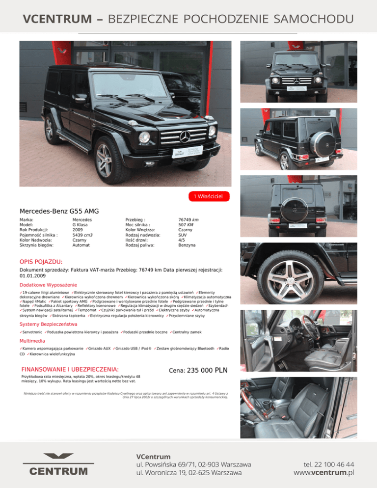 Mercedes-Benz G55 AMG Marka: Model: Rok Produkcji: Pojemność silnika : Kolor Nadwozia: Skrzynia biegów: Mercedes G Klasa 2009 5439 cm3 Czarny Automat Przebieg : Moc silnika : Kolor Wnętrza: Rodzaj nadwozia: Ilość drzwi: Rodzaj paliwa: 76749 km 507 KM Czarny SUV 4/5 Benzyna OPIS POJAZDU: Dokument sprzedaży: Faktura VAT-marża Przebieg: 76749 km Data pierwszej rejestracji: 01.01.2009 Dodatkowe Wyposażenie ✓19-calowe felgi aluminiowe ✓Elektrycznie sterowany fotel kierowcy i pasażera z pamięcią ustawień ✓Elementy dekoracyjne drewniane ✓Kierownica wykończona drewnem ✓Kierownica wykończona skórą ✓Klimatyzacja automatyczna ✓Napęd 4Matic ✓Pakiet sportowy AMG ✓Podgrzewane i wentylowane przednie fotele ✓Podgrzewane przednie i tylne fotele ✓Podsufitka z Alcantary ✓Reflektory ksenonowe ✓Regulacja klimatyzacji w drugim rzędzie siedzeń ✓Szyberdach ✓System nawigacji satelitarnej ✓Tempomat ✓Czujniki parkowania tył i przód ✓Elektryczne szyby ✓Automatyczna skrzynia biegów ✓Skórzana tapicerka ✓Elektryczna regulacja położenia kierownicy ✓Przyciemniane szyby Systemy Bezpieczeństwa ✓Servotronic ✓Poduszka powietrzna kierowcy i pasażera ✓Poduszki przednie boczne ✓Centralny zamek Multimedia ✓Kamera wspomagająca parkowanie ✓Gniazdo AUX ✓Gniazdo USB / iPod® ✓Zestaw głośnomówiący Bluetooth ✓Radio CD ✓Kierownica wielofunkcyjna FINANSOWANIE I UBEZPIECZENIA: Cena: 235 000 PLN Przykładowa rata miesięczna, wpłata 20%, okres leasingu/kredytu 48 miesięcy, 10% wykupu. Rata leasingu jest wartością netto bez vat. Niniejsza treść nie stanowi oferty w rozumieniu przepisów Kodeksu Cywilnego oraz opisu towaru ani zapewnienia w rozumieniu art. 4 Ustawy z dnia 27 lipca 2002r o szczególnych warunkach sprzedaży konsumenckiej. Powered by TCPDF (www.tcpdf.org)