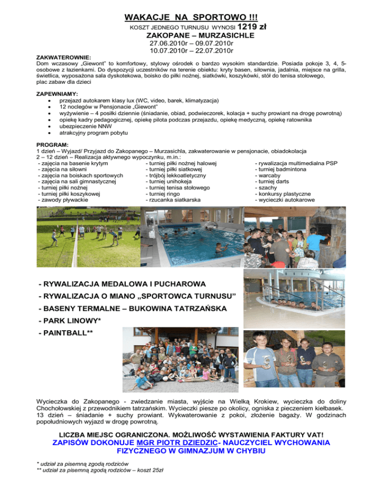 WAKACJE NA SPORTOWO !!! KOSZT JEDNEGO TURNUSU WYNOSI 1219 zł ZAKOPANE – MURZASICHLE 27.06.2010r – 09.07.2010r 10.07.2010r – 22.07.2010r ZAKWATEROWNIE: Dom wczasowy „Giewont” to komfortowy, stylowy ośrodek o bardzo wysokim standardzie. Posiada pokoje 3, 4, 5osobowe z łazienkami. Do dyspozycji uczestników na terenie obiektu: kryty basen, siłownia, jadalnia, miejsce na grilla, świetlica, wyposażona sala dyskotekowa, boisko do piłki nożnej, siatkówki, koszykówki, stół do tenisa stołowego, plac zabaw dla dzieci ZAPEWNIAMY: przejazd autokarem klasy lux (WC, video, barek, klimatyzacja) 12 noclegów w Pensjonacie „Giewont” wyżywienie – 4 posiłki dziennie (śniadanie, obiad, podwieczorek, kolacja + suchy prowiant na drogę powrotną) opiekę kadry pedagogicznej, opiekę pilota podczas przejazdu, opiekę medyczną, opiekę ratownika ubezpieczenie NNW atrakcyjny program pobytu PROGRAM: 1 dzień – Wyjazd/ Przyjazd do Zakopanego – Murzasichla, zakwaterowanie w pensjonacie, obiadokolacja 2 – 12 dzień – Realizacja aktywnego wypoczynku, m.in.: - zajęcia na basenie krytym - turniej piłki nożnej halowej - rywalizacja multimedialna PSP - zajęcia na siłowni - turniej piłki siatkowej - turniej badmintona - zajęcia na boiskach sportowych - trójbój lekkoatletyczny - warcaby - zajęcia na sali gimnastycznej - turniej unihokeja - turniej darts - turniej piłki nożnej - turniej tenisa stołowego - szachy - turniej piłki koszykowej - turniej ringo - konkursy plastyczne - zawody pływackie - rzucanka siatkarska - wycieczki autokarowe - RYWALIZACJA MEDALOWA I PUCHAROWA - RYWALIZACJA O MIANO „SPORTOWCA TURNUSU” - BASENY TERMALNE – BUKOWINA TATRZAŃSKA - PARK LINOWY* - PAINTBALL** Wycieczka do Zakopanego - zwiedzanie miasta, wyjście na Wielką Krokiew, wycieczka do doliny Chochołowskiej z przewodnikiem tatrzańskim. Wycieczki piesze po okolicy, ogniska z pieczeniem kiełbasek. 13 dzień – śniadanie + suchy prowiant. Wykwaterowanie z pokoi, złożenie bagaży. W godzinach popołudniowych wyjazd w drogę powrotną. LICZBA MIEJSC OGRANICZONA. MOŻLIWOŚĆ WYSTAWIENIA FAKTURY VAT! ZAPISÓW DOKONUJE MGR PIOTR DZIEDZIC- NAUCZYCIEL WYCHOWANIA FIZYCZNEGO W GIMNAZJUM W CHYBIU * udział za pisemną zgodą rodziców ** udział za pisemną zgodą rodziców – koszt 25zł