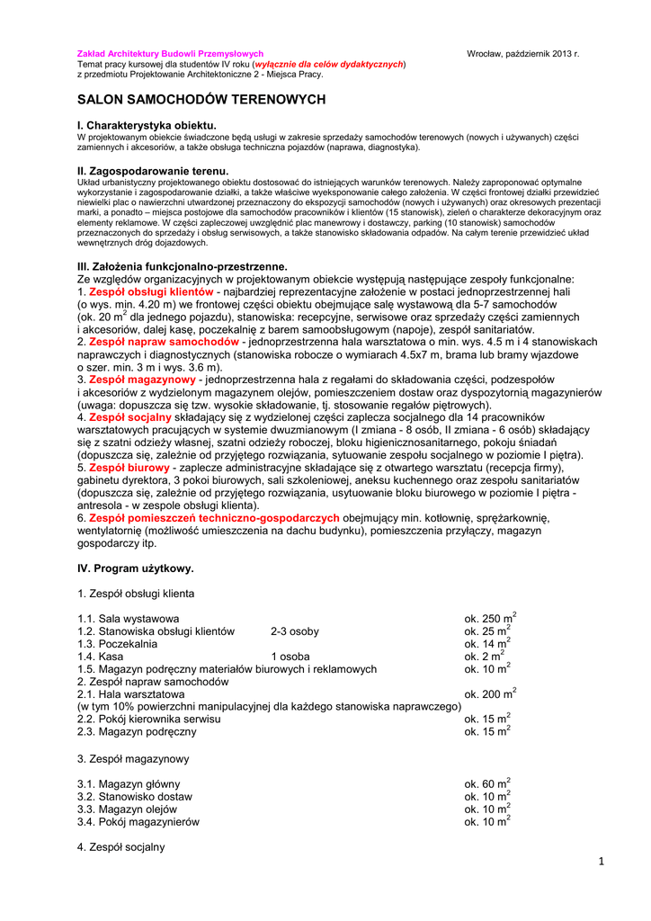 Zakład Architektury Budowli Przemysłowych Temat pracy kursowej dla studentów IV roku (wyłącznie dla celów dydaktycznych) z przedmiotu Projektowanie Architektoniczne 2 - Miejsca Pracy. Wrocław, październik 2013 r. SALON SAMOCHODÓW TERENOWYCH I. Charakterystyka obiektu. W projektowanym obiekcie świadczone będą usługi w zakresie sprzedaŜy samochodów terenowych (nowych i uŜywanych) części zamiennych i akcesoriów, a takŜe obsługa techniczna pojazdów (naprawa, diagnostyka). II. Zagospodarowanie terenu. Układ urbanistyczny projektowanego obiektu dostosować do istniejących warunków terenowych. NaleŜy zaproponować optymalne wykorzystanie i zagospodarowanie działki, a takŜe właściwe wyeksponowanie całego załoŜenia. W części frontowej działki przewidzieć niewielki plac o nawierzchni utwardzonej przeznaczony do ekspozycji samochodów (nowych i uŜywanych) oraz okresowych prezentacji marki, a ponadto – miejsca postojowe dla samochodów pracowników i klientów (15 stanowisk), zieleń o charakterze dekoracyjnym oraz elementy reklamowe. W części zapleczowej uwzględnić plac manewrowy i dostawczy, parking (10 stanowisk) samochodów przeznaczonych do sprzedaŜy i obsług serwisowych, a takŜe stanowisko składowania odpadów. Na całym terenie przewidzieć układ wewnętrznych dróg dojazdowych. III. ZałoŜenia funkcjonalno-przestrzenne. Ze względów organizacyjnych w projektowanym obiekcie występują następujące zespoły funkcjonalne: 1. Zespół obsługi klientów - najbardziej reprezentacyjne załoŜenie w postaci jednoprzestrzennej hali (o wys. min. 4.20 m) we frontowej części obiektu obejmujące salę wystawową dla 5-7 samochodów 2 (ok. 20 m dla jednego pojazdu), stanowiska: recepcyjne, serwisowe oraz sprzedaŜy części zamiennych i akcesoriów, dalej kasę, poczekalnię z barem samoobsługowym (napoje), zespół sanitariatów. 2. Zespół napraw samochodów - jednoprzestrzenna hala warsztatowa o min. wys. 4.5 m i 4 stanowiskach naprawczych i diagnostycznych (stanowiska robocze o wymiarach 4.5x7 m, brama lub bramy wjazdowe o szer. min. 3 m i wys. 3.6 m). 3. Zespół magazynowy - jednoprzestrzenna hala z regałami do składowania części, podzespołów i akcesoriów z wydzielonym magazynem olejów, pomieszczeniem dostaw oraz dyspozytornią magazynierów (uwaga: dopuszcza się tzw. wysokie składowanie, tj. stosowanie regałów piętrowych). 4. Zespół socjalny składający się z wydzielonej części zaplecza socjalnego dla 14 pracowników warsztatowych pracujących w systemie dwuzmianowym (I zmiana - 8 osób, II zmiana - 6 osób) składający się z szatni odzieŜy własnej, szatni odzieŜy roboczej, bloku higienicznosanitarnego, pokoju śniadań (dopuszcza się, zaleŜnie od przyjętego rozwiązania, sytuowanie zespołu socjalnego w poziomie I piętra). 5. Zespół biurowy - zaplecze administracyjne składające się z otwartego warsztatu (recepcja firmy), gabinetu dyrektora, 3 pokoi biurowych, sali szkoleniowej, aneksu kuchennego oraz zespołu sanitariatów (dopuszcza się, zaleŜnie od przyjętego rozwiązania, usytuowanie bloku biurowego w poziomie I piętra antresola - w zespole obsługi klienta). 6. Zespół pomieszczeń techniczno-gospodarczych obejmujący min. kotłownię, spręŜarkownię, wentylatornię (moŜliwość umieszczenia na dachu budynku), pomieszczenia przyłączy, magazyn gospodarczy itp. IV. Program uŜytkowy. 1. Zespół obsługi klienta 2 1.1. Sala wystawowa ok. 250 m 2 1.2. Stanowiska obsługi klientów 2-3 osoby ok. 25 m 2 1.3. Poczekalnia ok. 14 m 2 1.4. Kasa 1 osoba ok. 2 m 2 1.5. Magazyn podręczny materiałów biurowych i reklamowych ok. 10 m 2. Zespół napraw samochodów 2 2.1. Hala warsztatowa ok. 200 m (w tym 10% powierzchni manipulacyjnej dla kaŜdego stanowiska naprawczego) 2 2.2. Pokój kierownika serwisu ok. 15 m 2 2.3. Magazyn podręczny ok. 15 m 3. Zespół magazynowy 3.1. Magazyn główny 3.2. Stanowisko dostaw 3.3. Magazyn olejów 3.4. Pokój magazynierów 2 ok. 60 m 2 ok. 10 m 2 ok. 10 m 2 ok. 10 m 4. Zespół socjalny 1 4.1. Szatnia - wg norm 4.2. Umywalnia - wg norm 4.3. Pokój śniadań - wg norm 4.4. Toalety - wg norm 14 pracowników - szatnia odzieŜy własnej, szatnia odzieŜy roboczej system pracy dwuzmianowym (I zmiana - 8 osób, II zmiana - 6 osób), 5. Zespół biurowy 2 5.1. Sekretariat (recepcja firmy) 1 osoba ok. 20 m 2 5.2. Gabinet dyrektora 1 osoba ok. 20 m 2 5.3. Pokoje biurowe (3 pomieszczenia) 3 osoby ok. 40 m 2 5.4. Sala zebrań (szkoleniowa) ok. 30 m 2 5.5. Archiwum ok. 15 m 2 5.6. Serwer ok. 10 m 2 5.7. Aneks kuchenny ok. 5 m 5.8. Toalety - wg norm 6. Zespół pomieszczeń techniczno-gospodarczych 2 6.1. Kotłownia ok. 20 m 2 6.2. SpręŜarkownia ok. 10 m 2 6.3. Pomieszczenie przyłączy ok. 10 m 2 6.4. Magazyn gospodarczy ok. 15 m Uwaga: Dopuszcza się modyfikację programu w zaleŜności od przyjętej koncepcji (wymagana jest akceptacja prowadzącego adiunkta). V. Elementy zagospodarowania terenu. 1. Zespół kubaturowy obiektów salonu sprzedaŜy i stacji obsługi samochodów terenowych. 2. Plac ekspozycji samochodów nowych i uŜywanych. 3. Parking dla samochodów osobowych pracowników i klientów (15 stanowisk). 4. Plac manewrowy i dostawczy. 5. Parking dla samochodów do sprzedaŜy i obsług serwisowych (10 stanowisk). 6. Boks na odpady. 7. Ogrodzenie terenu, drogi wewnętrzne, zieleń, chodniki i place piesze, elementy małej architektury, akcenty reklamowe itp. VI. Zakres opracowania. Plansze projektowe (poŜądany format A3 w układzie poziomym). 1) orientacja (1:2000), zagospodarowanie terenu 1:500, 2) rzut parteru 1:200, 3) rzut piętra (antresoli) 1:200, 4) rzut dachu 1:200, 5) przekroje (w ilości odpowiedniej dla przyjętej koncepcji – min. 2) 1:200, 6) elewacje (w ilości odpowiedniej dla przyjętej koncepcji – min. 4) 1:200, 7) fragment elewacji (ok.10 mb) z odpowiednimi fragmentami przekroju poziomego i pionowego 1:50, 8) perspektywa zakładu z lotu ptaka lub 
