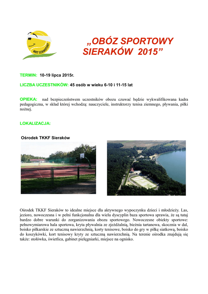 „OBÓZ SPORTOWY SIERAKÓW 2015” TERMIN: 10-19 lipca 2015r. LICZBA UCZESTNIKÓW: 45 osób w wieku 6-10 i 11-15 lat OPIEKA: nad bezpieczeństwem uczestników obozu czuwać będzie wykwalifikowana kadra pedagogiczna, w skład której wchodzą: nauczyciele, instruktorzy tenisa ziemnego, pływania, piłki nożnej. LOKALIZACJA: Ośrodek TKKF Sieraków Ośrodek TKKF Sieraków to idealne miejsce dla aktywnego wypoczynku dzieci i młodzieży. Las, jezioro, nowoczesna i w pełni funkcjonalna dla wielu dyscyplin baza sportowa sprawia, że są tutaj bardzo dobre warunki do zorganizowania obozu sportowego. Nowoczesne obiekty sportowe: pełnowymiarowa hala sportowa, kryta pływalnia ze zjeżdżalnią, bieżnia tartanowa, skocznia w dal, boisko piłkarskie ze sztuczną nawierzchnią, korty tenisowe, boisko do gry w piłkę siatkową, boisko do koszykówki, kort tenisowy kryty ze sztuczną nawierzchnią. Na terenie ośrodka znajdują się także: stołówka, świetlica, gabinet pielęgniarki, miejsce na ognisko. PROGRAM OBOZU: Profil sportowy: „tenis ziemny” Przeznaczony dla dzieci chcących uczyć się lub doskonalić w dyscyplinie tenisa ziemnego, zarówno dla stawiających pierwsze kroki w tenisie jak i dla tych regularnie już grających. Pozostałą część dnia wypełnią zajęcia do wyboru: piłka nożna, fitness, pływanie, gry i zabawy, animacje. − 2 treningi codziennie po 1,5 godz. zajęcia z tenisa ziemnego − sporty pozostałe do wyboru (piłka nożna, fitness, pływanie); − animacje wieczorne, zabawy, gry terenowe, (w przypadku złej pogody możliwość korzystania z hali sportowej) ; − ognisko z pieczeniem kiełbasek (również dla chętnych rodziców w ostatni wieczór turnusu); − podchody, gry terenowe, zabawy na plaży, kąpiel w jeziorze. Profil sportowy: „piłka nożna” Przeznaczony dla dzieci dla których piłka nożna jest sportem wiodącym. Instruktorzy lub trenerzy piłki nożnej zaplanują treningi dostosowane dla dzieci z podziałem na odpowiednie grupy wiekowe. Do dyspozycji pełnowymiarowe boisko ze sztuczną nawierzchnią, możliwość podziału na 3 mniejsze boiska. Pozostałą część dnia wypełnią zajęcia do wyboru: tenis, fitness, pływanie, gry i zabawy, animacje. − 2 treningi codziennie po 1,5 godz. zajęcia z piłki nożnej; − sporty pozostałe do wyboru (tenis, fitness, pływanie); − animacje wieczorne, zabawy, gry terenowe, (w przypadku złej pogody możliwość korzystania z hali sportowej) ; − ognisko z pieczeniem kiełbasek (również dla chętnych rodziców w ostatni wieczór turnusu); − podchody, gry terenowe, zabawy na plaży, kąpiel w jeziorze. RAMOWY PLAN DNIA 08:00 POBUDKA 08:30 ŚNIADANIE ZAJĘCIA 09:30- 13:00 PROGRAMOWE 13:30 OBIAD ZAJĘCIA 15:00-18:00 PROGRAMOWE 18:30 KOLACJA ZAJĘCIA WIECZORNE, 19:30- 21.30 ANIMACJE 22.00 CISZA NOCNA W CENIE ZAPEWNIAMY: • zakwaterowanie- w domkach drewnianych typu Warta, Fin, Berpol 5-7 osobowych z łazienką w każdym domku; • wyżywienie ( śniadanie obiad, kolacja, podwieczorek); • korzystanie z obiektów sportowych; • zajęcia programowe w zależności od wybranego profilu (piłka nożna, tenis ziemny, pływanie, fitness, koszykówka, gry i zabawy); • korzystanie ze sprzętu (zapewniamy sprzęt do tenisa ziemnego); • ubezpieczenie NNW; • opiekę wykwalifikowanej kadry; • pamiątkowe nagrody, koszulki. Dojazd i odbiór dziecka we własnym zakresie. Nauka pływania fakultatywnie (w zależności czy będzie czynna pływalnia) 35 zł za cały tydzień. CENA: 1050 zł dla MKT Szamotuły (minus ewentualna zniżka za ciągłość uczestnictwa w obozach max.10%) KONTAKT: Robert Wesołowski tel. 603 390 599, e-mail: [email protected] Warunkiem rezerwacji zaliczka w wysokości 300 zł na konto klubu do dnia 30 kwietnia 2015r z dopiskiem: „obóz Sieraków”.