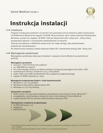 Genie Medical 2016.1 Instrukcja instalacji Instalacja Program instalacyjny powinien uruchomić się automatycznie po włożeniu płyty instalacyjnej CD-ROM Genie Medical do napędu CD-ROM. W przeciwnym razie należy otworzyć Eksploratora Windows, przejść do napędu CD-ROM i kliknąć dwukrotnie plik "setup.exe". Dalej należy postępować zgodnie z instrukcjami wyświetlanymi na ekranie. Podczas korzystania z NOAHlink należy mieć do niego dostęp, aby zaktualizować program po zainstalowaniu. Po zakończonej instalacji należy otworzyć folder SP1 i dwukrotnie kliknąć plik "setup.exe". Wymagania systemowe Wymagania systemowe dotyczące instalacji i używania Genie Medical są wymienione poniżej: Wymagania sprzętowe • procesor 1 GHz Pentium lub szybszy* • 512 MB RAM lub więcej* • do 5 GB wolnego miejsca na dysku twardym (zazwyczaj wymagane jest tylko 1 GB) • rozdzielczość ekranu: minimum 1024 x 768 pikseli • jeden COM, port USB lub Bluetooth dla urządzenia programującego • napęd CD-ROM, klawiatura i mysz Wymagania programowe (jeden z niżej wymienionych) • Windows 7 (32-/64-bitowy) • Windows 8 (wszystkie edycje oprócz RT) • Windows 10 (32-/64-bitowy) Opcjonalne narzędzia • NOAH (jeżeli nie jest wykorzystywana wbudowana baza danych Genie Medical)** • przeglądarka umożliwiająca dostęp do stron internetowych Oticon Medical • czytnik plików PDF do odczytu dokumentów w formacie PDF Obsługiwane urządzenia programujące • HI-PRO (firmware 3.0) •NOAHlink •EXPRESSlink3 * W przypadku zakupu nowego komputera minimalne wymagania systemowe są następujące: procesor 2 GHz Pentium CPU oraz 1 GB RAM. ** Nie należy instalować Genie Medical razem z NOAH 3.5 ani wcześniejszymi wersjami. Genie Medical 2016.1 Instalacja Genie Medical z własną bazą danych Moduł pacjenta jest instalowany automatycznie jako część Genie Medical. Jeśli Genie Medical działa w trybie bez NOAH (samodzielnie), pojawia się dodatkowy przycisk Organizatora (PACJENT). W module pacjenta można wprowadzić dane pacjenta, takie jak nazwisko, data urodzenia i adres, a także audiogram. Dane pacjenta są automatycznie zapisywane w bazie danych Genie Medical i wykorzystywane do kolejnych dopasowań. Aby uruchomić Genie Medical w trybie bez NOAH, należy kliknąć przycisk Start systemu Windows, programy, folder Oticon Medical, a następnie Genie Medical. Producent: Windows 7, Windows 8, Windows 10 są zastrzeżonymi znakami towarowymi firmy Microsoft Corporation w Stanach Zjednoczonych i innych krajach. NOAH jest zastrzeżonym znakiem towarowym HIMSA II K/S w Stanach Zjednoczonych. Poza Stanami Zjednoczonymi NOAH jest znakiem towarowym HIMSA II K/S. NOAHlink jest zastrzeżonym znakiem towarowym HIMSA II K/S w Danii. Poza Danią NOAHlink jest znakiem towarowym HIMSA. HI-PRO jest zastrzeżonym znakiem towarowym firmy GN Otometrics A/S w Stanach Zjednoczonych i innych krajach. EXPRESSlink jest zastrzeżonym znakiem towarowym firmy Sonic Innovations Inc. w Stanach Zjednoczonych i innych krajach. Dane zawarte w niniejszym dokumencie mogą ulec zmianie bez uprzedzenia. M52598PL / 2017.02 Oticon Medical AB Datavägen 37B SE-436 32 Askim Szwecja Telefon: +46 31 748 61 00 [email protected]