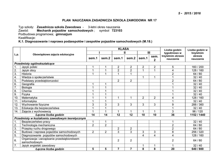 5 - 2015 / 2016 PLAN NAUCZANIA ZASADNICZA SZKOŁA ZAWODOWA NR 17 Typ szkoły: Zasadnicza szkoła Zawodowa - 3-letni okres nauczania Zawód: Mechanik pojazdów samochodowych ; symbol 723103 Podbudowa programowa; gimnazjum Kwalifikacje: K.1. Diagnozowanie i naprawa podzespołów i zespołów pojazdów samochodowych (M.18.) L.p. Obowiązkowe zajęcia edukacyjne Przedmioty ogólnokształcące 1. Język polski 2. Język obcy 3. Historia 4. Wiedza o społeczeństwie 5. Podstawy przedsiębiorczości 6. Geografia 7. Biologia 8. Chemia 9. Fizyka 10. Matematyka 11. Informatyka 12. Wychowanie fizyczne 13. Edukacja dla bezpieczeństwa 14. Zajęcia z wychowawcą Łączna liczba godzin Przedmioty w kształceniu zawodowym teoretycznym 1. Bezpieczeństwo pracy 2. Technologia mechaniczna 3. Przepisy ruchu drogowego 4. Budowa i naprawa pojazdów samochodowych 5. Diagnozowanie pojazdów samochodowych Organizacja i zarządzanie przedsiębiorstwem 6. samochodowym 7. Język angielski zawodowy Łączna liczba godzin KLASA II I III Liczba godzin tygodniowo w trzyletnim okresie nauczania Liczba godzin w trzyletnim okresie nauczania 160 / 200 128 / 160 64 / 80 32 / 40 64 / 80 32 / 40 32 / 40 32 / 40 32 / 40 128 / 160 32 / 40 288 / 360 32 / 40 96 / 120 1152 / 1440 sem.1 sem.2 sem.1 sem.2 sem.1 sem. 2 1 1 1 1 1 1 2 2 1 2 2 1 2 1 2 1 1 1 2 2 1 1 2 2 3 3 3 3 1 12 1 12 1 10 1 10 5 4 2 1 2 1 1 1 1 4 1 9 1 3 36 3 4 1 2 2 8 4 32 / 40 64 / 80 64 / 80 256 / 320 128 / 160 2 64 / 80 1 20 32 / 40 640 / 800 1 1 1 1 1 1 3 1 1 14 1 1 1 1 1 1 3 1 1 14 1 2 1 2 2 2 5 5 2 3 2 3 2 2 7 7 3 4 1 8 1 8 Przedmioty w kształceniu zawodowym praktycznym 1. Pracownia samochodowa – zajęcia praktyczne 2. Pracownia podstaw konstrukcji maszyn 3. Pracownia elektrotechniki i elektroniki Łączna liczba godzin Tygodniowy wymiar godzin obowiązkowych zajęć edukacyjnych Przedmioty w kształceniu nieobowiązkowym 1. Religia 2. Wychowanie do życia w rodzinie Razem godzin zajęć edukacyjnych 5 3 5 3 8 8 7 7 12 12 3 10 3 10 12 12 27 2 29 2 14 R 29,35 2 30 2 14 R 31,35 2 2 14 R 32,35 Egzamin potwierdzający pierwszą kwalifikację (K.1.) odbywa się pod koniec II semestru klasy trzeciej. Zajęcia indywidualne: nauka jazdy samochodem w wymiarze 30 godzin na ucznia. Zajęcia rewalidacyjne dla uczniów niepełnosprawnych – po 2 godz. na ucznia w każdym roku szkolnym. 24 3 3 30 768 / 960 96 / 120 96 / 120 960 / 1200 86 2752 / 3440 6 1,05 93,05 192 / 240 33,6 / 42 3722