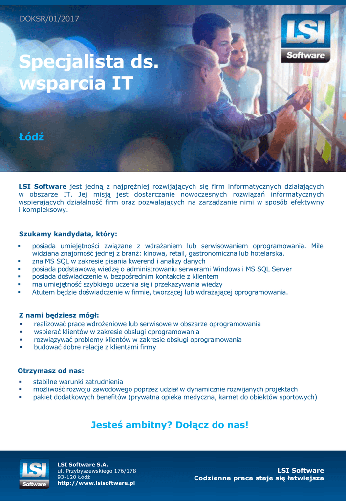 DOKSR/01/2017 Specjalista ds. wsparcia IT Łódź LSI Software jest jedną z najprężniej rozwijających się firm informatycznych działających w obszarze IT. Jej misją jest dostarczanie nowoczesnych rozwiązań informatycznych wspierających działalność firm oraz pozwalających na zarządzanie nimi w sposób efektywny i kompleksowy. Szukamy kandydata, który: posiada umiejętności związane z wdrażaniem lub serwisowaniem oprogramowania. Mile widziana znajomość jednej z branż: kinowa, retail, gastronomiczna lub hotelarska. zna MS SQL w zakresie pisania kwerend i analizy danych posiada podstawową wiedzę o administrowaniu serwerami Windows i MS SQL Server posiada doświadczenie w bezpośrednim kontakcie z klientem ma umiejętność szybkiego uczenia się i przekazywania wiedzy Atutem będzie doświadczenie w firmie, tworzącej lub wdrażającej oprogramowania. Z nami będziesz mógł: realizować prace wdrożeniowe lub serwisowe w obszarze oprogramowania wspierać klientów w zakresie obsługi oprogramowania rozwiązywać problemy klientów w zakresie obsługi oprogramowania budować dobre relacje z klientami firmy Otrzymasz od nas: stabilne warunki zatrudnienia możliwość rozwoju zawodowego poprzez udział w dynamicznie rozwijanych projektach pakiet dodatkowych benefitów (prywatna opieka medyczna, karnet do obiektów sportowych) Jesteś ambitny? Dołącz do nas! LSI Software S.A. ul. Przybyszewskiego 176/178 93-120 Łódź http://www.lsisoftware.pl LSI Software Codzienna praca staje się łatwiejsza