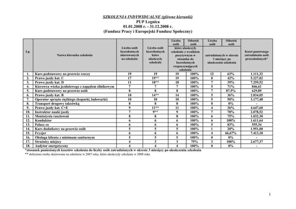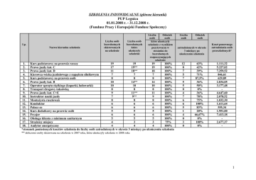SZKOLENIA INDYWIDUALNE (główne kierunki) PUP Legnica 01.01.2008 r. - 31.12.2008 r. (Fundusz Pracy i Europejski Fundusz Społeczny) Lp. Nazwa kierunku szkolenia Liczba osób bezrobotnych skierowanych na szkolenie Liczba osób bezrobotnych które ukończyły szkolenie Liczba Odsetek osób osób które ukończyły szkolenie z wynikiem pozytywnym w stosunku do bezrobotnych rozpoczynających szkolenie 1. Kurs podstawowy na przewóz rzeczy 19 19 19 100% 2. Prawo jazdy kat. C 17 19** 19 100% 3. Prawo jazdy kat. D 11 18** 18 100% 4. Kierowca wózka jezdniowego z napędem silnikowym 7 7 7 100% 5. Kurs podstawowy na przewóz osób 8 8 8 100% 6. Prawo jazdy kat. B 10 14** 14 100% 7. Operator sprzętu ciężkiego (koparki, ładowarki) 10 10 10 100% 8. Transport drogowy taksówką 8 8 8 100% 9. Prawo jazdy kat. C+E 9 11** 11 100% 10. Instruktor nauki jazdy 7 9** 9 100% 11. Montażysta rusztowań 8 8 8 100% 12. Konduktor 6 6 6 100% 13. Palacz co 6 6 6 100% 14. Kurs dodatkowy na przewóz osób 5 5 5 100% 15. Fryzjer 6 6 6 100% 16. Obsługa klienta z minimum sanitarnym 5 5 5 100% 17. Strażnicy miejscy 4 3 3 75% 18. Audytor energetyczny 4 4 4 100% *stosunek poniesionych kosztów szkolenia do liczby osób zatrudnionych w okresie 3 miesięcy po ukończeniu szkolenia ** doliczono osoby skierowane na szkolenie w 2007 roku, które ukończyły szkolenie w 2008 roku Liczba osób Odsetek osób zatrudnionych w okresie 3 miesięcy po ukończeniu szkolenia 12 8 7 5 7 5 5 0 4 7 6 6 5 1 4 0 3 0 63% 42% 39% 71% 87,5% 36% 50% 0% 36% 78% 75% 100% 83% 20% 66,67% 0% 100% 0% Koszt ponownego zatrudnienia osób przeszkolonych* 1.111,32 5.227,02 7.259,52 846,61 629,89 2.834,05 3.177,48 4.647,60 2.078,52 1.032,30 1.611,64 555,34 1.951,00 7.413,18 2.677,37 - 1 SZKOLENIA INDYWIDUALNE (główne kierunki) PUP Legnica 01.01.2008 r. - 31.12.2008 r. (Fundusz Pracy i Europejski Fundusz Społeczny) Lp. 1. 2. 3. 4. 5. 6. 7. 8. 9. 10. 11. 12. 13. 14. 15. 16. 17. 18. Nazwa kierunku szkolenia Kurs podstawowy na przewóz rzeczy Prawo jazdy kat. C Prawo jazdy kat. D Kierowca wózka jezdniowego z napędem silnikowym Kurs podstawowy na przewóz osób Prawo jazdy kat. B Operator sprzętu ciężkiego (koparki, ładowarki) Transport drogowy taksówką Prawo jazdy kat. C+E Instruktor nauki jazdy Montażysta rusztowań Konduktor Palacz co Kurs dodatkowy na przewóz osób Fryzjer Obsługa klienta z minimum sanitarnym Strażnicy miejscy Audytor energetyczny Liczba osób bezrobotnych skierowanych na szkolenie Liczba osób bezrobotnych które ukończyły szkolenie Koszt szkolenia /na 1 osobę/ Średni czas trwania szkolenia /w godzinach/ Średni koszt osobogodziny szkolenia 19 17 11 7 8 10 10 8 9 7 8 6 6 5 5 5 4 4 19 19* 18* 7 8 14* 10 8 11* 9* 8 6 6 5 5 5 4 4 725,00 2.067,50 2.900,00 510,00 725,00 1.125,00 1.300,00 650,00 1.895,00 2.820,00 950,00 1.600,00 512,60 380,00 5.000,00 550,00 2.400,00 1.440,00 34,35 51 81 67 34,35 61 176 28 46 208 80 171 40 10 240 20 344 50 21,10 40,54 35,81 7,61 21,10 18,44 7,38 23,21 67,68 13,56 11,87 9,35 12,81 38 20,80 27,50 6,98 28,80 * doliczono osoby skierowane na szkolenie w 2007 roku, które ukończyły szkolenie w 2008 roku Przeciętny czas trwania w/w szkoleń Przeciętny koszt w/w szkoleń 96,59 1.514,19 Przeciętny koszt osobogodziny w/w szkoleń 21,89 2 PUP Legnica 01.01.2008 r. - 31.12.2008 r. (Fundusz Pracy i Europejski Fundusz Społeczny) Liczba osób Lp. Nazwa egzaminu 1. 2. 3. Eksploatacja urządzeń elektroenergetycznych do 1 kV Eksploatacja urządzeń gazowych Uprawnienia na rzeczoznawcę majątkowego - część ustna RAZEM: Odsetek osób które zdały sfinansowany egzamin w stosunku do osób, które otrzymały wsparcie w tej formie Liczba osób Odsetek osób zatrudnionych w okresie 3 miesięcy po zdaniu sfinansowanego egzaminu Liczba osób bezrobotnych którym sfinansowano koszty egzamin Liczba osób bezrobotnych które zdały egzamin 2 2 2 100% 1 50% 1 1 1 0 1 0 100% 0% 1 - 100% - 4 3 3 75% 2 50% 3 PUP Legnica 01.01.2008 r. - 31.12.2008 r. (Fundusz Pracy i Europejski Fundusz Społeczny) Lp. Nazwa kierunku studiów podyplomowych 1. 2. 3. 4. 5. 6. Zarządzanie kadrami w nowoczesnej firmie Rachunkowość i podatki Zarządzanie i marketing Zarządzanie nieruchomościami i pośrednictwo w ich obrocie Gospodarka nieruchomościami. Zarządzanie, utrzymanie, wycena. Rachunkowość zarządcza i controlling. RAZEM: Liczba osób bezrobotnych którym sfinansowano koszty studiów podyplomowych Liczba osób bezrobotnych które ukończyły studia podyplomowe Liczba osób Odsetek osób które ukończyły dofinansowane studia podyplomowe w stosunku do osób, które otrzymały wsparcie w tej formie Liczba osób Odsetek osób zatrudnionych w okresie 3 miesięcy po zdaniu sfinansowanego studiów podyplomowych 1 1 1 1 0 0 0 0 0 0 0 0 0 0 0 0 1 1 0 0 100% 100% 0 0 0 2 2 100% 0 0 0 4 1 3 1 3 100% 100% 1 3 100% 75% 4 GŁÓWNE KIERUNKI SZKOLEŃ OSÓB BEZROBOTNYCH ZORGANIZOWANYCH POD ZAPOTRZEBOWANIE ZGŁOSZONE PRZEZ PRACODAWCÓW W OKRESIE OD 01.01.2008 R. DO 31.12.2008 R. Lp. 1. 2. 3. 4. 5. 6. 7. 8. 9. 10. 11. Nazwa kierunku szkolenia Kurs podstawowy na przewóz rzeczy Prawo jazdy kat. C Prawo jazdy kat. D Prawo jazdy kat. C+E Kurs podstawowy na przewóz osób Operator sprzętu ciężkiego (koparki, ładowarki) Kierowca wózka jezdniowego z napędem silnikowym Montażysta rusztowań Konduktor Strażnik miejski Strażak Liczba osób bezrobotnych skierowanych na szkolenie 19 17 11 10 9 8 7 8 6 4 3 5