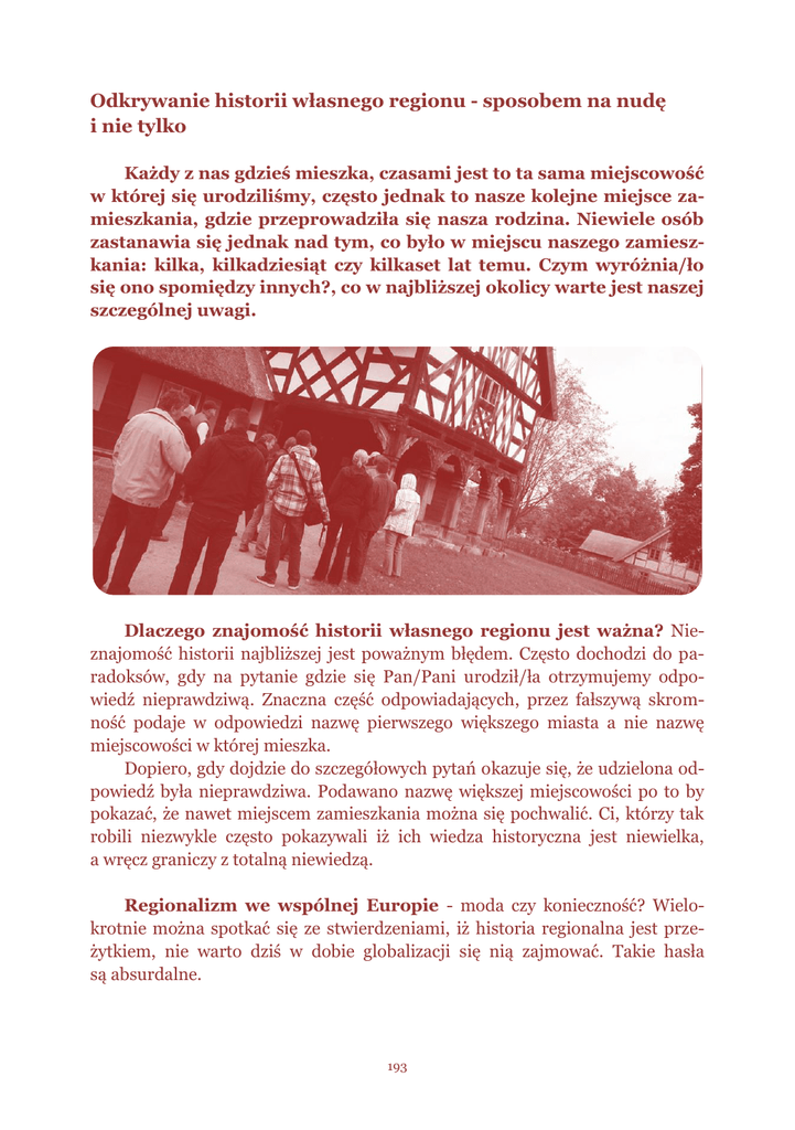 Odkrywanie historii własnego regionu - sposobem na nudę i nie tylko Każdy z nas gdzieś mieszka, czasami jest to ta sama miejscowość w której się urodziliśmy, często jednak to nasze kolejne miejsce zamieszkania, gdzie przeprowadziła się nasza rodzina. Niewiele osób zastanawia się jednak nad tym, co było w miejscu naszego zamieszkania: kilka, kilkadziesiąt czy kilkaset lat temu. Czym wyróżnia/ło się ono spomiędzy innych?, co w najbliższej okolicy warte jest naszej szczególnej uwagi. Dlaczego znajomość historii własnego regionu jest ważna? Nieznajomość historii najbliższej jest poważnym błędem. Często dochodzi do paradoksów, gdy na pytanie gdzie się Pan/Pani urodził/ła otrzymujemy odpowiedź nieprawdziwą. Znaczna część odpowiadających, przez fałszywą skromność podaje w odpowiedzi nazwę pierwszego większego miasta a nie nazwę miejscowości w której mieszka. Dopiero, gdy dojdzie do szczegółowych pytań okazuje się, że udzielona odpowiedź była nieprawdziwa. Podawano nazwę większej miejscowości po to by pokazać, że nawet miejscem zamieszkania można się pochwalić. Ci, którzy tak robili niezwykle często pokazywali iż ich wiedza historyczna jest niewielka, a wręcz graniczy z totalną niewiedzą. Regionalizm we wspólnej Europie - moda czy konieczność? Wielokrotnie można spotkać się ze stwierdzeniami, iż historia regionalna jest przeżytkiem, nie warto dziś w dobie globalizacji się nią zajmować. Takie hasła są absurdalne. 193 Dlaczego dziś - w dobie wspólnej Europy, dbałość o rozbudzanie zainteresowań historią regionu jest tak ważna? - odpowiedź jest prosta, każdy z mieszkańców nie tylko powinien, ale wręcz musi znać, przynajmniej w zarysie dzieje swej "Małej Ojczyzny". W innym przypadku przysłowie autorstwa Wincentego Pola: "Cudze chwalicie, swego nieznanie, sami nie wiecie, co posiadacie" jest nadal aktualne. Prof. Maria Ciechocińska - historyk, w artykule zatytułowanym "Regionalizm polski a wyzwania integracji europejskiej" napisała słowa, które moim zdaniem, będą aktualne jeszcze przez wieki: "Regionalizm i lokalizm stają się jednocześnie próbą odnalezienia się w globalnej wiosce, czyli w świecie poddanym procesom globalizacji. To regionalizm można uznać jako formę indywidualizacji w warunkach globalizacji, ponieważ dzięki niemu można łatwiej zaistnieć w warunkach bardzo ostrej konkurencji. Aby móc skutecznie współistnieć we wspomnianych wyżej globalnych tendencjach, nie wolno zaniedbywać wysiłków i codziennej troski na rzecz kultywowania rodzimych wzorców narodowych, tradycji regionalnych i lokalnych, które w warunkach gospodarki wolnorynkowej również powinny być dostępne jako produkty na rynku"3. W podobnym duchu wypowiadał się wybitny znawca problemów regionalizmu prof. Jerzy Damrosz, który tak pisał o konieczności uwzględnienia historii regionalnej w wychowaniu młodzieży: "Dlatego też wychowanie obywatelskie i patriotyczne, wzbogacone edukacją regionalno-etniczną, powinno być integralnym składnikiem programu szkolnego i impulsem do wzmocnienia roli polskości w integrującej się Europie. Zwróciłbym w tym miejscu uwagę na rolę regionalizmu, jako siły kulturotwórczej, ale nie odśrodkowej, lecz właśnie dośrodkowej, wzmacniającej potencjał kultury ogólnonarodowej"4. Po co nam wiedza regionalna? By nie poddawać się bezkrytycznie modzie przychodzącej od kilku lat z zachodniej Europy czy Ameryki, dbajmy o to by to co Nasze - własne - polskie stawało się znane na świecie, a ponieważ to trudne więc zacznijmy od nas samych. Poznajmy własną historię, dzieje ziemi najbliższej, losy naszych rodziców, dziadków czy pradziadków. Bądźmy dumni z przeszłości i wykorzystujmy dokonania dawnych pokoleń w budowaniu przyszłości. Nie łudźmy się, że ktoś zrobi to za nas. Niezmiernie rzadko powstają dobre prace o historii regionu i jego tradycjach. Dobre to znaczy takie jakie powstały po wielomiesięcznych czy też wieloletnich poszukiwaniach w archiwach i bibliotekach. To takie, przy napisaniu których dotarto, a raczej M. Ciechocińska, Regionalizm polski a wyzwania integracji europejskiej, [w:] Humanistyka w procesie transformacji 1989-2001, red. P. Matusak i R. Dmowski, Siedlce 2003, s. 34. 4 J. Damrosz, Podstawy ideowe wychowania obywatelskiego i patriotycznego (kultura i pamięć historyczna), [w:] Wojsko i kultura w dziejach Polski i Europy. Księga jubileuszowa profesora Piotra Matusaka w 65 rocznicę urodzin, red. R. Dmowski, J. Gmitruk, G. Korneć i W. Włodarkiewicz, Siedlce 2006, s. 663. 3 194 starano się dotrzeć do wszystkich dostępnych dziś źródeł, zarówno pisanych jak i wywołanych, czyli relacji ustnych. Praca historyka jest trudna i wymaga wielu lat poświęceń ale naprawdę warto się pomęczyć. Historia regionalna w szkole (między teorią a praktyką). Od lat treści regionalne, zgodnie z założeniami kolejnych reform edukacji, powinny być wykorzystywane we wszystkich typach szkół podczas lekcji historii, lekcji języka polskiego lub geografii. Należy zaznaczyć również, że w programach szkolnych znalazła się ścieżka edukacja regionalna oraz ścieżka edukacja czytelnicza i medialna. Cóż jednak z tego gdy przeładowane programy nauczania przy równoczesnym zmniejszeniu ilości godzin dydaktycznych nie pozwalają na przerobienie podstawowego materiału nauczania nie mówiąc już o jego rozszerzaniu. Wiedza o regionie funkcjonuje jednak w szkołach niejako równolegle do treści przekazywanych na lekcjach. W wielu szkołach w pracowni historycznej znajdują się pamiątki historyczne w tym z historii regionu. Skarbnicą materiałów regionalnych, często pomijaną przez poszukujących śladów przeszłości są natomiast biblioteki zarówno szkolne jak i inne mieszczące się na terenie określonej miejscowości. Prof. dr hab. Jadwiga Kołodziejska - bibliotekoznawca w książce "Drukowa