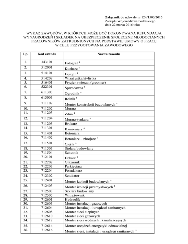 Załącznik do uchwały nr 124/1500/2016 Zarządu Województwa Podlaskiego dnia 22 marca 2016 toku WYKAZ ZAWODÓW, W KTÓRYCH MOŻE BYĆ DOKONYWANA REFUNDACJA WYNAGRODZEŃ I SKŁADEK NA UBEZPIECZENIE SPOŁECZNE MŁODOCIANYCH PRACOWNIKÓW ZATRUDNIONYCH NA PODSTAWIE UMOWY O PRACĘ W CELU PRZYGOTOWANIA ZAWODOWEGO Lp. Kod zawodu Nazwa zawodu 1. 343101 Fotograf ˢ 2. 512001 Kucharz ˢ 3. 514101 4. 5. 6. 514208 516401 522301 Fryzjer ˢ Wizażystka/stylistka Fryzjer zwierząt (groomer) 7. 611303 Ogrodnik ˢ 8. 613003 Rolnik ˢ 9. 711102 10. 11. 711202 711203 Monter konstrukcji budowlanych ˢ Murarz 12. 711204 13. 14. 711205 711301 15. 16. 711401 711402 17. 711501 18. 19. 20. 711503 711504 712101 21. 22. 23. 24. 25. 712202 712203 712204 712302 712401 26. 712403 27. 28. 29. 30. 31. 32. 33. 34. 712503 712505 712601 712603 712604 712608 712610 712612 35. 36. 712614 712616 Sprzedawca ˢ Zdun ˢ Murarz-tynkarz ˢ Brukarz Kamieniarz ˢ Betoniarz Betoniarz – zbrojarz ˢ Cieśla ˢ Stolarz budowlany Szkutnik Dekarz ˢ Glazurnik Parkieciarz Posadzkarz Sztukator Monter izolacji budowlanych ˢ Monter izolacji przemysłowych ˢ Szklarz budowlany Witrażownik Hydraulik Monter instalacji gazowych Monter instalacji i urządzeń sanitarnych Monter sieci cieplnych Monter sieci gazowych Monter sieci wodnych i kanalizacyjnych Monter urządzeń energetyki odnawialnej Monter sieci, instalacji i urządzeń sanitarnych ˢ 37. 38. 712904 712905 Technolog robót wykończeniowych w budownictwie Monter zabudowy i robót wykończeniowych w budownictwie ˢ Malarz – tapeciarz 39. 40. 713101 713201 41. 42. 713203 713303 43. 44. 45. 46. 721101 721103 721204 721301 47. 721306 Blacharz samochodowy ˢ 48. 722101 49. 50. 51. 52. 53. 722102 722104 722202 722203 722204 Kowal ˢ Kowal wyrobów zdobniczych Podkuwacz koni Płatnerz Rusznikarz 54. 55. 56. 722205 722301 722307 57. 58. 59. 60. 722308 722313 722314 723103 61. 723107 Mechanik motocyklowy ˢ 62. 723310 Mechanik – monter maszyn i urządzeń ˢ 63. 731103 64. 65. 731105 731106 Mechanik precyzyjny ˢ Ortopeda mechanik 66. 731305 67. 68. 69. 70. 71. 72. 73. 74. 731402 731405 731409 731606 731607 731609 731610 731702 75. 76. 731704 731808 77. 78. 79. 80. 731901 731904 731905 732201 81. 732301 Lakiernik ˢ Lakiernik samochodowy Kominiarz ˢ Brązownik Ludwisarz Spawacz Blacharz ˢ Ślusarz ˢ Ślusarz galanterii metalowej Frezer Operator obrabiarek skrawających ˢ Operator obrabiarek sterowanych numerycznie Tokarz Tokarz w metalu Mechanik pojazdów samochodowych ˢ Zegarmistrz ˢ Złotnik – jubiler ˢ Ceramik wyrobów użytkowych i ozdobnych Garncarz Szkliwierz ceramiki Pozłotnik Rzeźbiarz szkła Zdobnik ceramiki Zdobnik szkła Koszykarz-plecionkarz ˢ Modelarz wyrobów plecionkarskich Rękodzielnik wyrobów włókienniczych ˢ Pamiątkarz Zabawkarz Metaloplastyk Drukarz ˢ Introligator ˢ 82. 741103 Elektryk ˢ 83. 741201 Elektromechanik ˢ 84. 741203 85. 86. 87. 741204 741205 742102 Elektromechanik pojazdów samochodowych ˢ Elektromechanik sprzętu gospodarstwa domowego Elektromechanik urządzeń chłodniczych 88. 89. 751105 751107 90. 751201 Cukiernik ˢ 91. 751204 92. 93. 94. 95. 96. 97. 98. 751302 751401 752201 752202 752203 752204 752205 Piekarz ˢ Serowar Młynarz Bednarz Gięciarz drewna Kołodziej Renowator mebli artystycznych 99. 100. 101. 102. 103. 104. 105. 106. 107. 752206 752207 752208 752209 752310 753101 753102 753103 753105 108. 753106 109. 110. 111. 112. 113. 753201 753301 753304 753305 753402 114. 753602 115. 116. 117. 753603 753604 753702 118. 119. 120. 753703 832201 834103 Monter – elektronik ˢ Rzeźnik – wędliniarz Wędliniarz ˢ Stolarz ˢ Stolarz galanterii drzewnej Stolarz mebli artystycznych i wzorcowych Stolarz meblowy Stolarz modelarz instrumentów muzycznych Tokarz w drewnie Bieliźniarz Gorseciarka Kapelusznik-czapnik Krawiec ˢ Kuśnierz ˢ Konstruktor odzieży Hafciarka Wytwórca abażurów Żaglownik Tapicer ˢ Obuwnik ˢ Obuwnik miarowy Obuwnik ortopedyczny Kaletnik ˢ Rymarz Kierowca-mechanik Mechanik – operator pojazdów i maszyn rolniczych ˢ ˢ Zawód objęty kształceniem w systemie oświaty