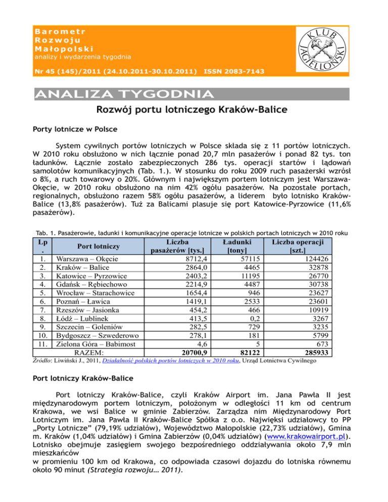 Barometr Rozwoju Małopolski analizy i wydarzenia tygodnia Nr 45 (145)/2011 (24.10.2011-30.10.2011) ISSN 2083-7143 ANALIZA TYGODNIA IS Rozwój portu lotniczego Kraków-Balice Porty lotnicze w Polsce System cywilnych portów lotniczych w Polsce składa się z 11 portów lotniczych. W 2010 roku obsłużono w nich łącznie ponad 20,7 mln pasażerów i ponad 82 tys. ton ładunków. Łącznie zostało zabezpieczonych 286 tys. operacji startów i lądowań samolotów komunikacyjnych (Tab. 1.). W stosunku do roku 2009 ruch pasażerski wzrósł o 8%, a ruch towarowy o 20%. Głównym i największym portem lotniczym jest WarszawaOkęcie, w 2010 roku obsłużono na nim 42% ogółu pasażerów. Na pozostałe portach, regionalnych, obsłużono razem 58% ogółu pasażerów, a liderem było lotnisko KrakówBalice (13,8% pasażerów). Tuż za Balicami plasuje się port Katowice-Pyrzowice (11,6% pasażerów). Tab. 1. Pasażerowie, ładunki i komunikacyjne operacje lotnicze w polskich portach lotniczych w 2010 roku Lp . 1. 2. 3. 4. 5. 6. 7. 8. 9. 10. 11. Port lotniczy Warszawa – Okęcie Kraków – Balice Katowice – Pyrzowice Gdańsk – Rębiechowo Wrocław – Starachowice Poznań – Ławica Rzeszów – Jasionka Łódź – Lublinek Szczecin – Goleniów Bydgoszcz – Szwederowo Zielona Góra – Babimost RAZEM: Liczba pasażerów [tys.] 8712,4 2864,0 2403,2 2214,9 1654,4 1419,1 454,2 413,5 282,5 278,1 4,6 20700,9 Ładunki [tony] 57115 4465 11195 4487 946 2533 466 0,2 729 181 5 82122 Liczba operacji [szt.] 124426 32878 26770 30738 23627 23601 10919 3267 3235 5799 673 285933 Źródło: Liwiński J., 2011, Działalność polskich portów lotniczych w 2010 roku, Urząd Lotnictwa Cywilnego Port lotniczy Kraków-Balice Port lotniczy Kraków-Balice, czyli Kraków Airport im. Jana Pawła II jest międzynarodowym portem lotniczym, położonym w odległości 11 km od centrum Krakowa, we wsi Balice w gminie Zabierzów. Zarządza nim Międzynarodowy Port Lotniczym im. Jana Pawła II Kraków-Balice Spółka z o.o. Najwięksi udziałowcy to PP „Porty Lotnicze” (79,19% udziałów), Województwo Małopolskie (22,73% udziałów), Gmina m. Kraków (1,04% udziałów) i Gmina Zabierzów (0,04% udziałów) (www.krakowairport.pl). Lotnisko obejmuje zasięgiem swojego bezpośredniego oddziaływania około 7,9 mln mieszkańców w promieniu 100 km od Krakowa, co odpowiada czasowi dojazdu do lotniska równemu około 90 minut (Strategia rozwoju… 2011). Barometr Rozwoju Małopolski analizy i wydarzenia tygodnia Nr 45 (145)/2011 (24.10.2011-30.10.2011) ISSN 2083-7143 Rozwój portu lotniczego w Balicach jest istotny dla regonu. W Strategii Rozwoju Województwa Małopolskiego 2010 – 2020 jako jeden z celów strategicznych przyjęto „wysoką zewnętrzną i wewnętrzną dostępność komunikacyjną regionu dla konkurencyjności gospodarczej i spójności przestrzennej”. Autorzy Strategii chcą wzmocnić rolę Krakowa jako nowoczesnego węzła międzynarodowej sieci transportowej. W związku z tym jednym z kluczowych działań dla Małopolski ma być „kontynuacja rozwoju Międzynarodowego Portu Lotniczego Kraków-Balice wraz z poprawą jego dostępności transportowej” (Strategia rozwoju… 2011). Ruch pasażerski w porcie Kraków-Balice Liczba obsługiwanych pasażerów na lotnisku w Balicach zaczęła znacznie wzrastać od roku 2004. Z poziomu około 840 tys. osób, liczba ta wzrosła do ponad 3 mln w 2007 roku (Ryc. 1.). Było to w dużej mierze związane z wejściem Polski do Unii Europejskiej i koniecznością liberalizacji przepisów związanych z dostępem do polskiego rynku oraz otwarcia się na przewoźników wspólnotowych. Pojawiło się także więcej przewoźników linii niskokosztowych (Analiza rynku… 2009). W tym okresie w Krakowie zaczęły działać m.in. tanie linie lotnicze Ryanair i easyJet. W latach 2008 i 2009 liczba pasażerów obsłużonych na lotnisku w Balicach zmalała i w 2009 roku wyniosła około 2,7 mln osób. Spadek ten był związany z ogólnym kryzysem gospodarczym, obniżeniem zainteresowania turystów miastem Krakowem, a także zmniejszeniem oferty przewoźników. W okresie tym z oferty podkrakowskiego lotniska zniknęły linie Centralwings i Sky Europe. Mimo tych zmian port lotniczy Kraków – Balice nadal pozostawał liderem wśród polskich portów regionalnych (Liwiński 2009, 2010). W 2010 roku sytuacja zaczęła się poprawiać i liczba obsłużonych pasażerów wzrosła do ponad 2,8 mln osób. Ryc.1. Zmiany w ruchu pasażerskim w porcie lotniczym Kraków-Balice w latach 2000 - 2010 Źródło: www.krakowairport.pl Barometr Rozwoju Małopolski analizy i wydarzenia tygodnia Nr 45 (145)/2011 (24.10.2011-30.10.2011) ISSN 2083-7143 Destynacje i przewoźnicy portu lotniczego Kraków-Balice Obecnie w porcie lotniczym Kraków-Balice loty rozkładowe realizuje 18 przewoźników. Linie tradycyjne reprezentuje 5 przewoźników, a linie niskokosztowe 13 przewoźników. Oprócz tego port realizuje loty czarterowe. W 2010 roku największy udział w realizacji lotów ruchu pasażerskiego miały tanie linie lotnicze. Linie Ryanair przewiozły 35,0% pasażerów, a linie easyJet 18,5% pasażerów, czyli łącznie obsłużyły 53,5% podróżnych. Na trzecim i czwartym miejscu uplasowały się tradycyjne linie lotnicze: PLL LOT i Lufthansa (łącznie 21,7% pasażerów). Duży udział w przewozie pasażerów miały również loty czarterowe. Z lotniska w Balicach odbywają się loty międzynarodowe i krajowe (Ryc. 2.). Poza granice Polski, zgodnie z regularnym rozkładem lotów, można polecieć bezpośrednio do 18 krajów europejskich, wybierając między 43 portami lotniczymi. W granicach kraju odbywają się loty do Warszawy, Gdańska, Poznania i Szczecina (www.krakowairport.pl). Tab. 2. Najpopularniejsi przewoźnicy w porcie lotniczym Kraków-Balice w 2010 roku Lp. Udział w ruchu Przewoźnik 1. 2. 3. 4. 5. Ryanair easyJet LOT Lufthansa czarter pasażerskim 35,0% 18,5% 12,6% 9,1% 7,7
