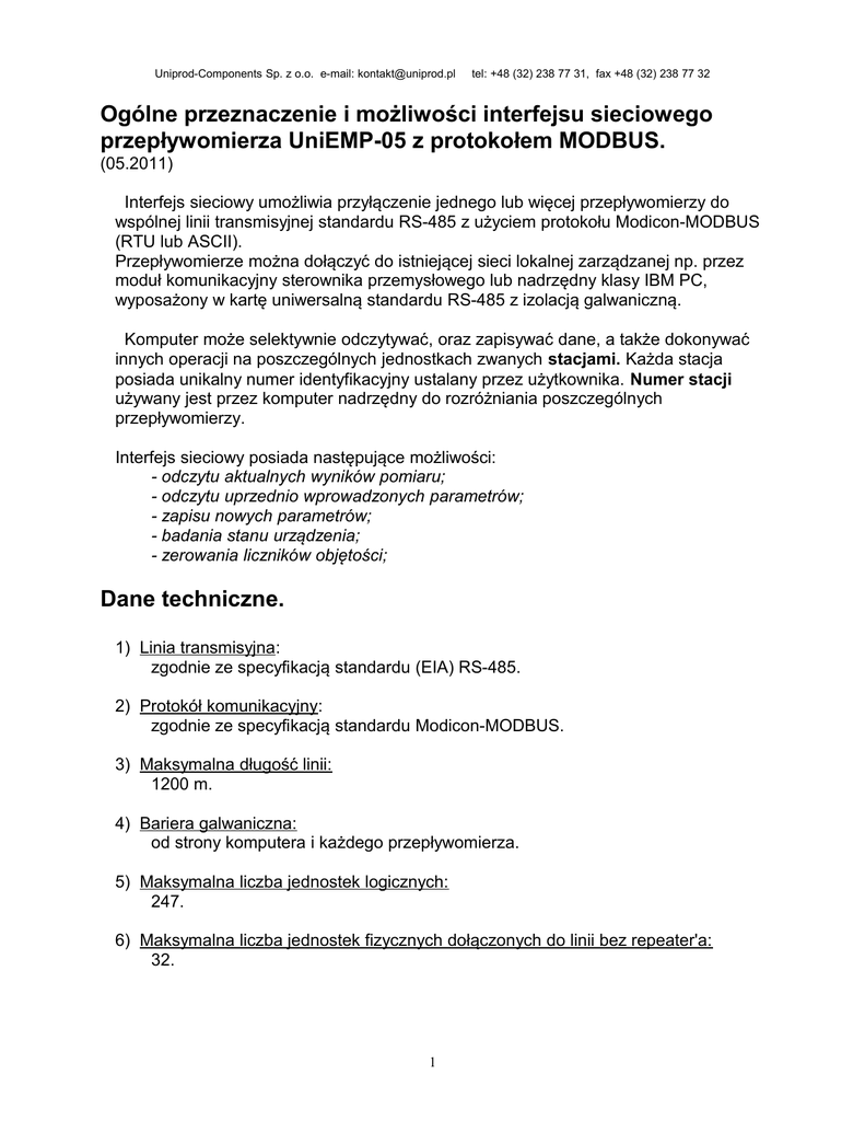 Uniprod-Components Sp. z o.o. e-mail: [email protected] tel: +48 (32) 238 77 31, fax +48 (32) 238 77 32 Ogólne przeznaczenie i możliwości interfejsu sieciowego przepływomierza UniEMP-05 z protokołem MODBUS. (05.2011) Interfejs sieciowy umożliwia przyłączenie jednego lub więcej przepływomierzy do wspólnej linii transmisyjnej standardu RS-485 z użyciem protokołu Modicon-MODBUS (RTU lub ASCII). Przepływomierze można dołączyć do istniejącej sieci lokalnej zarządzanej np. przez moduł komunikacyjny sterownika przemysłowego lub nadrzędny klasy IBM PC, wyposażony w kartę uniwersalną standardu RS-485 z izolacją galwaniczną. Komputer może selektywnie odczytywać, oraz zapisywać dane, a także dokonywać innych operacji na poszczególnych jednostkach zwanych stacjami. Każda stacja posiada unikalny numer identyfikacyjny ustalany przez użytkownika. Numer stacji używany jest przez komputer nadrzędny do rozróżniania poszczególnych przepływomierzy. Interfejs sieciowy posiada następujące możliwości: - odczytu aktualnych wyników pomiaru; - odczytu uprzednio wprowadzonych parametrów; - zapisu nowych parametrów; - badania stanu urządzenia; - zerowania liczników objętości; Dane techniczne. 1) Linia transmisyjna: zgodnie ze specyfikacją standardu (EIA) RS-485. 2) Protokół komunikacyjny: zgodnie ze specyfikacją standardu Modicon-MODBUS. 3) Maksymalna długość linii: 1200 m. 4) Bariera galwaniczna: od strony komputera i każdego przepływomierza. 5) Maksymalna liczba jednostek logicznych: 247. 6) Maksymalna liczba jednostek fizycznych dołączonych do linii bez repeater'a: 32. 1 Uniprod-Components Sp. z o.o. e-mail: [email protected] tel: +48 (32) 238 77 31, fax +48 (32) 238 77 32 7) Maksymalny czas dostępu do pojedyńczej stacji: poniżej 300 ms. 8) Maksymalna ilość przesyłanych rejestrów w jednym komunikacie: 30 dla trybu RTU, 15 dla trybu ASCII. 9) Format transmisji dla pojedyńczego znaku (transmisja asynchroniczna): szybkość: 1200, 2400, 4800, 9600, 19200 bodów; ilość bitów: 7 (ASCII), 8 (RTU); ilość bitów stopu: 1, 2; kontrola błędów: test parzystości, test nieparzystości, brak; 10) Odporność na zakłócenia: zgodnie ze specyfikacją standardu (EIA) RS-485. Konfiguracja stacji. Każdy przepływomierz pracujący w sieci musi być odpowiednio skonfigurowany przy pomocy klawiatury, w szczególności musi mieć nadany unikalny numer identyfikacyjny, oraz ustawione prawidłowe parametry współpracy z linią transmisyjną. 1) Ustalenie parametrów współpracy z linią transmisyjną: - przy pomocy klawiszy strzałek przejść do podmenu "Interfejs szer...", - wejść do podmenu - ukaże się pozycja "Rodzaj pracy", - wybrać odpowiednią konfigurację: - RTU lub ASCII; - prędkość transmisji 1200, 2400, 4800, 9600, lub 19200; - testowanie parzystości (E), nieparzystości (O) lub brak testowania (N); - ilość bitów w znaku (8 dla RTU i 7 dla ASCII) - ilość bitów stopu ustawia się automatycznie na 1 przy testowaniu parzystości (E lub O), oraz na 2 przy braku testowania (N). 2) Nadanie numeru stacji: - przy pomocy klawiszy strzałek przejść do kolejnej pozycji podmenu "Numer stacji", - wpisać żądany numer, unikalny dla każdego urządzenia dołączonego do linii. Sposób poruszania się po menu, oraz edycja parametrów opisana jest w instrukcji obsługi przepływomierza UniEMP-05. 2 Uniprod-Components Sp. z o.o. e-mail: [email protected] tel: +48 (32) 238 77 31, fax +48 (32) 238 77 32 Blokada edycji parametrów. Rozpoczęcie wymiany danych z przepływomierzem poprzez sieć powoduje automatyczne zablokowanie możliwości edycji parametrów z klawiatury. Próba edycji parametru powoduje wyświetlenie napisu "BLOKADA". Zniesienie blokady następuje po wyłączeniu i załączeniu zasilania i zaprzestaniu wymiany danych, lub po wpisie liczby zero do rejestru o adresie 1000 (patrz - rozdział Opis rejestrów przepływomierza). Opis rejestrów Odczyt wyników pomiaru, ustawianie parametrów, itp. odbywa się za pośrednictwem 16-bitowych rejestrów do których dostęp odbywa się za pomocą standardowych funkcji protokołu MODBUS. Wyróżnione są dwie przestrzenie adresowe rejestrów: 1) Rejestry tylko do odczytu (Input Registers). Odczyt za pomocą funkcji 4 (Read Input Registers). 2) Rejestry do odczytu i zapisu (Holding Registers). Odczyt za pomocą funkcji 3 (Read Holding Registers). Zapis za pomocą funkcji 16 (Preset Multiple Regs), lub funkcji 6 (Preset Single Register). Uwaga: Wpis do wszystkich stacji jednocześnie (broadcasting) nie jest możliwy w tej wersji interfejsu. Formaty danych: Jedna dana (np. wartość przepływu) jest reprezentowana przez jeden lub więcej rejestrów umieszczonych pod kolejnymi, przyległymi adresami. Przepływomierz używa następujących, standardowych typów danych: UNSIGNED - 16-bitowa wartość całkowita bez znaku, reprezentowana przez jeden rejestr; FLOAT - 32-bitowa wartość zmiennoprzecinkowa w/g standardu IEEE, reprezentowana przez dwa rejestry - mniej znaczące 16 bitów w pierwszym rejestrze. Możliwe jest stosowanie grupowego odczytu i zapisu (odczyt/zapis wielu rejestrów, patrz - Dane Techniczne, punkt 8) w ramach pojedynczego komunikatu protokołu MODBUS. Uwaga: W przypadku odczytu/zapisu danych składających się z kilku rejestrów należy bezwzględnie dokonywać tych operacji na kolejnych, rosnących adresach. Najlepszym rozwiązaniem jest stosowanie grupowego odczytu i zapisu. 3 Uniprod-Components Sp. z o.o. e-mail: [email protected] tel: +48 (32) 238 77 31, fax +48 (32) 238 77 32 Opis rejestrów przepływomierza Rejestry tylko do odczytu (Input Registers): 1) Wielkość przepływu Adres: 0, Format: FLOAT, Ilość rejestrów: 2 Wartość zmierzona w aktualnie ustawionej jednostce przepływu. Dla przepływu wstecz wartość ta jest ujemna. 2) Stan bieżącego licznika objętości dla przepływu w przód VF Adres: 2, Format: FLOAT, Ilość rejestrów: 2 Wartość w aktualn