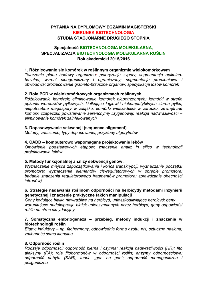 PYTANIA NA DYPLOMOWY EGZAMIN MAGISTERSKI KIERUNEK BIOTECHNOLOGIA STUDIA STACJONARNE DRUGIEGO STOPNIA Specjalność BIOTECHNOLOGIA MOLEKULARNA, SPECJALIZACJA BIOTECHNOLOGIA MOLEKULARNA ROŚLIN Rok akademicki 2015/2016 1. Różnicowanie się komórek w roślinnym organizmie wielokomórkowym Tworzenie planu budowy organizmu; polaryzacja zygoty; segmentacja apikalnobazalna; wzrost nieograniczony i ograniczony; segmentacja promieniowa i obwodowa; zróżnicowanie grzbieto-brzuszne organów; specyfikacja losów komórek 2. Rola PCD w wielokomórkowych organizmach roślinnych Różnicowanie komórek; eliminowanie komórek niepotrzebnych; komórki w strefie pękania woreczków pyłkowych; kiełkujące łagiewki niekompatybilnych ziaren pyłku; niepotrzebne megaspory w zalążku; komórki wieszadełka w zarodku; zewnętrzne komórki czapeczki; powstawanie aerenchymy lizygenowej; reakcja nadwrażliwości – eliminowanie komórek zainfekowanych 3. Dopasowywanie sekwencji (sequence alignment) Metody, znaczenie, typy dopasowania, przykłady algorytmów 4. CADD – komputerowo wspomagane projektowanie leków Omówienie podstawowych etapów; znaczenie analiz in silico w technologii projektowania leków 5. Metody funkcjonalnej analizy sekwencji genów . Wyznaczanie miejsca zapoczątkowania i końca transkrypcji; wyznaczanie początku promotora; wyznaczanie elementów cis-regulatorowych w obrębie promotora; badanie znaczenia regulatorowego fragmentów promotora; sprawdzanie obecności intronów) 6. Strategie nadawania roślinom odporności na herbicydy metodami inżynierii genetycznej i znaczenie praktyczne takich manipulacji Geny kodujące białka niewrażliwe na herbicyd, unieszkodliwiające herbicyd; geny warunkujące nadekspresję białek unieczynnianych przez herbicyd; geny odpowiedzi roślin na stres oksydacyjny 7. Somatyczna embriogeneza – przebieg, metody indukcji i znaczenie w biotechnologii roślin Etapy; induktory – np. fitohormony, odpowiednia forma azotu, pH; sztuczne nasiona; zmienność soma klonalna 8. Odporność roślin Rodzaje odporności; odporność bierna i czynna; reakcja nadwrażliwości (HR); fito aleksyny (FA); rola fitohormonów w odporności roślin; enzymy odpornościowe; odporność nabyta (SAR); teoria „gen na gen”; odporność monogeniczna i poligeniczna 9. Etiologia chorób roślin Podział czynników chorobotwórczych; cechy pasożytów; rodzaje pasożytnictwa; charakterystyka czynników infekcyjnych: wirusy, bakterie i grzyby jako patogeny roślin (sposoby wnikania, namnażanie i rozprzestrzenianie się) 10. Charakterystyka adaptacji roślin do stresów abiotycznych Podział stresów abiotycznych; mechanizmy odporności roślin na suszę, czynniki zimy i wysoką temperaturę; przystosowanie roślin do środowiska zasolonego i mechanizmy odporności na zasolenie; wpływ zanieczyszczenia środowiska na rośliny; wpływ metali ciężkich na fizjologię roślin; hodowlane możliwości poprawy odporności roślin na abiotyczne czynniki stresowe 11. Mechanizmy odporności roślin na biotyczne czynniki stresowe Charakterystyka substancji wydzielanych przez rośliny i patogenny (enzymy niszczące i przebudowujące ściany komórkowe, metabolity stresowe roślin wyższych); charakterystyka białek PR, fala oksydacyjna; reakcja nadwrażliwości; molekuły sygnałowe; elicitory reakcji obronnych. 12. Strategie i przykłady badań metabolomicznych Metabolomiczne analizy celowane; profilowanie metabolomiczne; metaboliczny odcisk palca; metaboliczny odcisk stopy; analizy przepływu metabolitów; zastosowanie badań metabolomicznych w analizie porównawczej dojrzewających i kiełkujących nasion Arabidopsis 13. Platformy analityczne stosowane w metabolomice roślin Metody chromatograficzne w analizach metabolomicznych; sprzężenia chromatografii ze spektrometrią mas; techniki jonizacji cząsteczek (EL, ESi, MALDI). 14. Czynniki mutagenne - podział i działanie 15. Wykorzystanie mutagenezy indukowanej w hodowli roślin Czynniki mutagenne i efekty ich działania. Wykorzystanie mutagenezy indukowanej w hodowli roślin. Odmiany wyprowadzone z mutantów. Jakie cechy modyfikuje się najczęściej przy pomocy mutagenezy indukowanej. Porównanie mutagenezy indukowanej i transgenezy. 16. Ogólny schemat postępowania w klasycznych badaniach proteomicznych Ekstrakcja białek z materiału biologicznego; dwuwymiarowy rozdział elektroforetyczny białek; metody zapisu obrazów 2-DE i analiza obrazu; wycięcie z żelu plamek będących przedmiotem zainteresowania; trawienie enzymatyczne białka zawartego w wyciętej plamce; wymycie powstałych peptydów z żelu; zagęszczenie i oczyszczenie preparatu oraz poddanie analizie w spektrofotometrze masowym; zastosowanie programów komputerowych w proteomice; narzędzia bioinformatyczne np. Mascot; mapy peptydowe; modyfikacje białek; enzymy proteolityczne (miejsce trawienia) 17. Czy gatunki transgeniczne stanowią zagrożenie dla różnorodności gatunkowej biosfery? 18. Ściana komórkowa jako istotny czynnik wzrostu i rozwoju roślin Składniki chemiczne ściany, ich rola we wzroście wydłużeniowym; ściana komórkowa jako element transportu międzykomórkowego) 19. Rodzaje i charakterystyka receptorów światła niebieskiego Charakterystyka trzech typów fotoreceptorów 20. Mechanizm mechanorecepcji w komórkach korzeni Budowa i lokalizacja tkankowa statocytów; mechanizm grawitropicznego odbioru bodźca