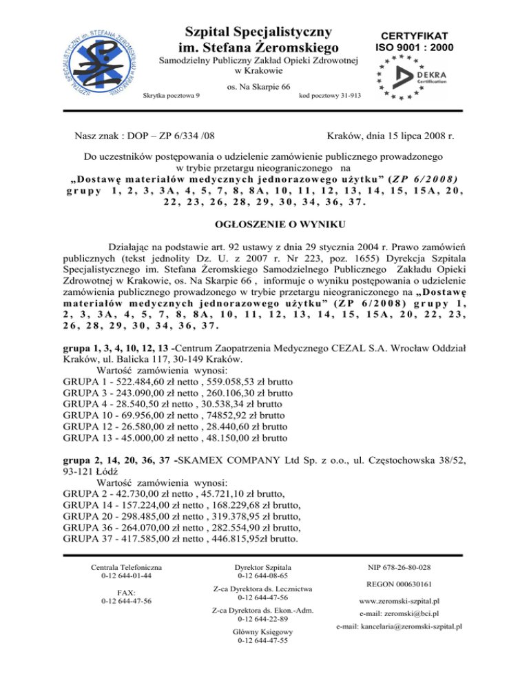 Szpital Specjalistyczny im. Stefana Żeromskiego CERTYFIKAT ISO 9001 : 2000 Samodzielny Publiczny Zakład Opieki Zdrowotnej w Krakowie os. Na Skarpie 66 Skrytka pocztowa 9 kod pocztowy 31-913 Nasz znak : DOP – ZP 6/334 /08 Kraków, dnia 15 lipca 2008 r. Do uczestników postępowania o udzielenie zamówienie publicznego prowadzonego w trybie przetargu nieograniczonego na „Dostawę materiałów medycznych jednorazow ego użytku” (Z P 6 / 2 0 0 8 ) grupy 1, 2, 3, 3A, 4, 5, 7, 8, 8A, 10, 11, 12, 13, 14, 15, 15A, 20, 22, 23, 26, 28, 29, 30, 34, 36, 37. OGŁOSZENIE O WYNIKU Działając na podstawie art. 92 ustawy z dnia 29 stycznia 2004 r. Prawo zamówień publicznych (tekst jednolity Dz. U. z 2007 r. Nr 223, poz. 1655) Dyrekcja Szpitala Specjalistycznego im. Stefana Żeromskiego Samodzielnego Publicznego Zakładu Opieki Zdrowotnej w Krakowie, os. Na Skarpie 66 , informuje o wyniku postępowania o udzielenie zamówienia publicznego prowadzonego w trybie przetargu nieograniczonego na „Dostawę m ateriałów medycznych jednorazow ego użytku” (Z P 6 / 2 0 0 8 ) g r u p y 1 , 2, 3, 3A, 4, 5, 7, 8, 8A, 10, 11, 12, 13, 14, 15, 15A, 20, 22, 23, 26, 28, 29, 30, 34, 36, 37. grupa 1, 3, 4, 10, 12, 13 -Centrum Zaopatrzenia Medycznego CEZAL S.A. Wrocław Oddział Kraków, ul. Balicka 117, 30-149 Kraków. Wartość zamówienia wynosi: GRUPA 1 - 522.484,60 zł netto , 559.058,53 zł brutto GRUPA 3 - 243.090,00 zł netto , 260.106,30 zł brutto GRUPA 4 - 28.540,50 zł netto , 30.538,34 zł brutto GRUPA 10 - 69.956,00 zł netto , 74852,92 zł brutto GRUPA 12 - 26.580,00 zł netto , 28.440,60 zł brutto GRUPA 13 - 45.000,00 zł netto , 48.150,00 zł brutto grupa 2, 14, 20, 36, 37 -SKAMEX COMPANY Ltd Sp. z o.o., ul. Częstochowska 38/52, 93-121 Łódź Wartość zamówienia wynosi: GRUPA 2 - 42.730,00 zł netto , 45.721,10 zł brutto, GRUPA 14 - 157.224,00 zł netto , 168.229,68 zł brutto, GRUPA 20 - 298.485,00 zł netto , 319.378,95 zł brutto, GRUPA 36 - 264.070,00 zł netto , 282.554,90 zł brutto, GRUPA 37 - 417.585,00 zł netto , 446.815,95zł brutto. Centrala Telefoniczna 0-12 644-01-44 FAX: 0-12 644-47-56 Dyrektor Szpitala 0-12 644-08-65 Z-ca Dyrektora ds. Lecznictwa 0-12 644-47-56 Z-ca Dyrektora ds. Ekon.-Adm. 0-12 644-22-89 Główny Księgowy 0-12 644-47-55 NIP 678-26-80-028 REGON 000630161 www.zeromski-szpital.pl e-mail: [email protected] e-mail: [email protected] Szpital Specjalistyczny im. Stefana Żeromskiego CERTYFIKAT ISO 9001 : 2000 Samodzielny Publiczny Zakład Opieki Zdrowotnej w Krakowie os. Na Skarpie 66 Skrytka pocztowa 9 kod pocztowy 31-913 grupa 3A - AKME Wojciech Pałejko, Anna Stachyra – Pałejko Sp. j. , ul. Postępu 1, 02-676 Warszawa Wartość zamówienia wynosi: GRUPA 3A- 11.980,00 zł netto , 12.818,60 zł brutto. grupa 5 - Przedsiębiorstwo Wielobranżowe INTERGOS Sp. z o.o., ul. Legionów 59 A, 43-300 Bielsko - Biała Wartość zamówienia wynosi: GRUPA 5- 183.427,50 zł netto , 201.367,43 zł brutto. grupa 7, 15, 15A, 22, - COVIDIEN POLSKA Sp. z o.o., Al. Jerozolimskie 162, 02-342 Warszawa Wartość zamówienia wynosi: GRUPA 7 - 246.587,00 zł netto , 263.848,09 zł brutto GRUPA 15 - 28.960,00 zł netto , 30.987,20 zł brutto GRUPA 15A - 93.900,00 zł netto , 100.473,00 zł brutto GRUPA 22 - 30.090,00 zł netto , 32.196,30 zł brutto grupa 8, 8A - Aesculap Chifa Sp. z o.o. B.Braun, ul. Tysiąclecia 14, 64-300 Nowy Tomyśl Wartość zamówienia wynosi: GRUPA 8 - 246.840,00 zł netto , 264.118,80 zł brutto GRUPA 8A - 14.080,00 zł netto , 15.065,60 zł brutto grupa 11 - Górnośląska Centrala Zaopatrzenia Medycznego ZARYS Sp. z o.o., ul. Pod Borem 18, 41-808 Zabrze Wartość zamówienia wynosi: GRUPA 11 - 13.650,00 zł netto , 14.605,50zł brutto grupa 23, 26, 28, 29- Paul Hartmann Polska Sp. z o.o., ul. Partyzancka 133/151, 95-200 Pabianice Wartość zamówienia wynosi: GRUPA 23 - 269.312,00 zł netto , 288.163,84 zł brutto GRUPA 26 - 125.640,00 zł netto , 134.434,80 zł brutto GRUPA 28 - 122.400,00zł netto , 130.968,00 zł brutto GRUPA 29 - 84.061,00 zł netto , 89.945,27 zł brutto Centrala Telefoniczna 0-12 644-01-44 FAX: 0-12 644-47-56 Dyrektor Szpitala 0-12 644-08-65 Z-ca Dyrektora ds. Lecznictwa 0-12 644-47-56 Z-ca Dyrektora ds. Ekon.-Adm. 0-12 644-22-89 Główny Księgowy 0-12 644-47-55 NIP 678-26-80-028 REGON 000630161 www.zeromski-szpital.pl e-mail: [email protected] e-mail: [email protected] Szpital Specjalistyczny im. Stefana Żeromskiego CERTYFIKAT ISO 9001 : 2000 Samodzielny Publiczny Zakład Opieki Zdrowotnej w Krakowie os. Na Skarpie 66 Skrytka pocztowa 9 kod pocztowy 31-913 grupa 30 - PROMED S.A. ul. Krajewskiego 1B, 01-520 Warszawa Wartość zamówienia wynosi: GRUPA 30 - 103.680,00 zł netto , 110.937,60 zł brutto grupa 34 - JKT Wytwórnia Artykułów Higienicznych Sp. z o.o., ul. Zwycięstwa 17 A, 15-703 Białystok Wartość zamówienia wynosi: GRUPA 34 - 422.750,00 zł netto , 452.342,50 zł brutto Oferty powyższe zostały uznane za najkorzystniejsze w kryterium cena 100 % natomiast w grupie 11 - w kryterium cena 60 % i jakość 40%. Termin podpisania umów nastąpi zgodnie z art. 94 ust. 1 ustawy Prawo zamówień publicznych (tekst jednolity Dz. U. z 2007 r. Nr 223, poz. 1655). Ponadto w grupach 4 i 30 Zamawiający wykluczył z postępowania na podstawie art. 24 ust. 2 pkt. 3 ustawy Wykonawcę DEVYMED Sp. z o.o., ul. Obrońców 18, 03-933 Warszawa, 50-043 Wrocław. Oferta została uznana za odrzuconą zgodnie z art. 24 ust. 4 ustawy. Wykonawca pomimo wezwania na podstawie art. 26 ust 3 ustawy nie uzupełnił brakującej aktualnej informacji z banku i brakującego aktualnego odpisu z Krajowego Rejestru Sądowego do terminu wskazanego w piśmie DOP - ZP6/308/08 tj. do dnia 7.07.2008 r. - w grupach 2, 3, 5, 11, 13, 17 - Zamawiający wykluczył z postępowania na podstawie art. 24 ust. 2 pkt. 4 ustawy Wykonawcę PYRAMED Sp. z o.o., ul. Kołodzieja 30, 61-070 Poznań, ponieważ gwarancja wadialna załączona do oferty wygasa z dniem 22.07.2008