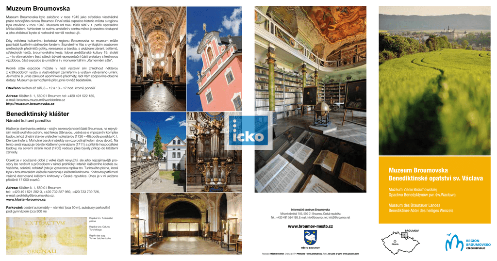 Muzeum Broumovska Muzeum Broumovska bylo založeno v roce 1945 jako středisko vlastivědné práce tehdejšího okresu Broumov. První stálá expozice historie města a regionu byla otevřena v roce 1948. Muzeum od roku 1980 sídlí v 1. patře opatského křídla kláštera. Vzhledem ke svému umístění v centru města je snadno dostupné a jeho zhlédnutí byste si rozhodně neměli nechat ujít. Díky velkému kulturnímu bohatství regionu Broumovska se muzeum může pochlubit kvalitním sbírkovým fondem. Seznámíme Vás s vynikajícím souborem uměleckých předmětů gotiky, renesance a baroka, s ukázkami zbraní, betlémů, střeleckých terčů, broumovského kroje, lidové aměšťanské kultury 19. století ... – to vše najdete v šesti sálech bývalé reprezentační části prelatury s freskovou výzdobou, část expozice je umístěna i v monumentálním „Kamenném sále“. Kromě stálé expozice můžete v naší výstavní síni zhlédnout některou z krátkodobých výstav s vlastivědným zaměřením a výstavy výtvarného umění. Je možné si u nás zakoupit upomínkové předměty, rádi Vám zodpovíme obecné dotazy. Muzeum je samozřejmě přístupné rovněž badatelům. Otevřeno: květen až září, 8 – 12 a 13 – 17 hod. kromě pondělí Adresa: Klášter č. 1, 550 01 Broumov, tel: +420 491 522 185, e-mail: [email protected] http://muzeum.broumovsko.cz Benediktinský klášter Národní kulturní památka Klášter je dominantou města – stojí v severovýchodní části Broumova, na nejvyšším místě skalního ostrohu nad řekou Stěnavou. Jedná se o impozantní komplex budov, jehož dnešní stav je výsledkem přestavby (1726 – 48) podle projektu K. I. Dientzenhofera. Mohutné barokní objekty se rozprostírají kolem dvou dvorů. Na tento areál navazuje bývalé klášterní gymnázium (1711) a přilehlé hospodářské budovy, na severní straně most (1705) vedoucí přes bývalý příkop do klášterní zahrady. Objekt je v současné době z velké části nevyužitý, ale jeho nejzajímavější prostory lze navštívit s průvodcem v rámci prohlídky: interiér klášterního kostela sv. Vojtěcha, sakristii, refektář (zde je vystavena replika tzv. Turínského plátna, která byla v broumovském klášteře nalezena) a klášterní knihovnu. Knihovna patří mezi vzácně dochované klášterní knihovny v České republice. Dnes je v ní uloženo přibližně 17 000 svazků. Muzeum Broumovska Benediktinské opatství sv. Václava Adresa: Klášter č. 1, 550 01 Broumov, tel.: +420 491 521 282-3, +420 732 387 969, +420 733 739 726, e-mail: [email protected], www.klaster-broumov.cz Parkování: osobní automobily – náměstí (cca 50 m), autobusy parkoviště pod gymnáziem (cca 300 m) Replika tzv. Turínského plátna Replika tzw. Całunu Turyńskiego Muzeum Ziemi Broumowskiej Opactwo Benedyktynów pw. św.Wacława Informační centrum Broumovska Mírové náměstí 105, 550 01 Broumov, Česká republika Tel.: +420 491 524 168, E-mail: [email protected], [email protected] www.broumov-mesto.cz Replik des sog. Turiner Leichentuchs Realizace: Město Broumov. Grafika a DTP: PINstudio · www.pinstudio.cz. Foto: Jan Záliš © 2015 www.janzalis.com Museum des Braunauer Landes Benediktiner-Abtei des heiliges Wenzels Museum des Braunauer Landes Muzeum Ziemi Broumowskiej Das Museum des Braunauer Landes wurde im Jahre 1945 als Zentrum heimatkundlicher Arbeit des damaligen Bezirks Broumov gegründet. Die erste Dauerexposition über die Geschichte der Stadt und der Region wurde im Jahre 1948 eröffnet. Seit 1980 hat das Museum seinen Sitz im 1. Stock eines Flügels des Abteiklosters. Das Museum ist mit Rücksicht auf seine Lage im Stadtzentrum leicht erreichbar. Sie sollten sich dessen Besuch nicht entgehen lassen. Muzeum Ziemi Broumowskiej zostało założone w 1945 roku jako ośrodek krajoznawczy byłego powiatu Broumov. Pierwsza stała ekspozycja historii miasta i regionu została otwarta w 1948 roku. Muzeum od 1980 roku ma swoją siedzibę na 1. piętrze opackiego skrzydła klasztoru. Ze względu na swoją lokalizację w centrum miasta jest łatwo dostępne, zdecydowanie polecamy jego zwiedzenie. Dank eines großen kulturellen Reichtums der Region kann das Museum stolz auf seinen Sammlungsfond von hoher Qualität sein. Sie werden bei uns mit einer ausgezeichneten Kollektion von Kunstgegendständen aus der Zeit der Gotik, Renaissance und dem Barock, mit einer Mustersammlung von Waffen, Weihnachtskrippen, Schießscheiben und Trachten der Gegend sowie auch mit Volks- und Bürgerkultur des 19. Jahrhunderts bekannt gemacht. Dies alles finden Sie in sechs Sälen des mit Fresken verzierten Gebäudeteils der ehemaligen Prälatur, der zur Repräsentation diente. Ein Teil der Exposition ist im monumentalen, sogenannten „Steinsaal“ untergebracht. Außer der Dauerexposition kann man sich auch eine der kurzfristigen, auf Heimatkunde orientierten Ausstellungen oder Ausstellungen bildender Kunst ansehen. Man kann bei uns auch Souvenirs kaufen. Wir sind bereit, Ihre allgemeinen Fragen gerne zu beantworten. Das Museum ist selbstverständlich auch den Forschern zugänglich. Öffnungszeiten: Mai bis September, 8 – 12 und 13 - 17 Uhr außer Montag Adresse: Klášter 1, 550 01 Broumov, Tschechische Republik tel.: +420 491 522 185, e-mail: [email protected] http://muzeum.broumovsko.cz Dzięki pokaźnemu bogactwu kulturalnemu regionu Ziemi Broumowskiej muzeum może się poszczycić świetnymi zbiorami. Zapoznamy Państwa ze znakomitymi kolekcjami przedmiotów artystycznych z okresu gotyki, renesansu i baroku, z eksponatami broni, szopek, tarcz strzelniczych, broumowskich strojów ludowych, kultury ludowej i mieszczańskiej 19. wieku ... to wszystko można znaleźć w sześciu salach byłej reprezentacyjnej części pałacu opackiego (tzw. prelatury) z freskową dekoracją, część ekspozycji mieści sięwmonumentalnej „Sali Kamienne