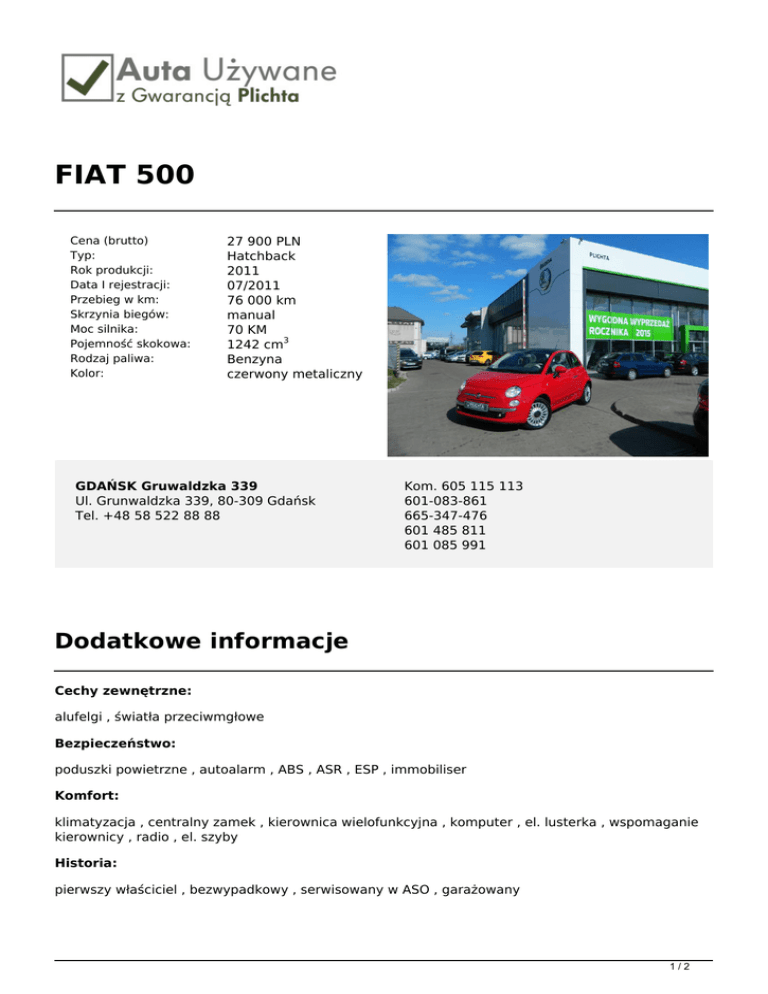 FIAT 500 Cena (brutto) Typ: Rok produkcji: Data I rejestracji: Przebieg w km: Skrzynia biegów: Moc silnika: Pojemność skokowa: Rodzaj paliwa: Kolor: 27 900 PLN Hatchback 2011 07/2011 76 000 km manual 70 KM 1242 cm3 Benzyna czerwony metaliczny GDAŃSK Gruwaldzka 339 Ul. Grunwaldzka 339, 80-309 Gdańsk Tel. +48 58 522 88 88 Kom. 605 115 113 601-083-861 665-347-476 601 485 811 601 085 991 Dodatkowe informacje Cechy zewnętrzne: alufelgi , światła przeciwmgłowe Bezpieczeństwo: poduszki powietrzne , autoalarm , ABS , ASR , ESP , immobiliser Komfort: klimatyzacja , centralny zamek , kierownica wielofunkcyjna , komputer , el. lusterka , wspomaganie kierownicy , radio , el. szyby Historia: pierwszy właściciel , bezwypadkowy , serwisowany w ASO , garażowany 1/2 Gwarancja Szanowni Państwo, Pragniemy Państwa poinformować, iż firma Plichta – Autoryzowany Dealer Škoda Auto prowadzi skup oraz sprzedaż samochodów używanych wszystkich marek, oferując także samochody używane z gwarancją objęte programem „Auta używane z Gwarancją Plichta”. W ramach programu „Auta Używane z Gwarancją Plichta ” każdy Klient otrzymuje atrakcyjny pakiet zniżek pozwalający zoptymalizować koszty eksploatacji samochodu: -50% na serwis klimatyzacji -50% na ustawienie zbieżności -50% na kosmetykę auta -50% na ścieżkę diagnostyczną -25% na wymiany oleju -25% na zakup opon + 5zł na sezon za hotelowanie opon -15% na części i akcesoria Oferujemy również kompleksową obsługę w zakresie finansowania i ubezpieczenia: - kredyty już od 4,99% - leasingi i kredyty bez zaświadczeń - uproszczone procedury – decyzja już od 30 min. - atrakcyjne pakiety AC/OC/NW/ASS wiodących firm ubezpieczeniowych Możliwość pozostawienia dotychczas użytkowanego auta w rozliczeniu – BEZPŁATNA WYCENA!!! Zapraszamy wszystkich Klientów na jazdę próbną wybranym autem. Numer oferty: c103 Informacja nie stanowi oferty w rozumieniu art. 66 KC. Podane dane mają charakter wyłącznie informacyjny. 2/2 Powered by TCPDF (www.tcpdf.org)