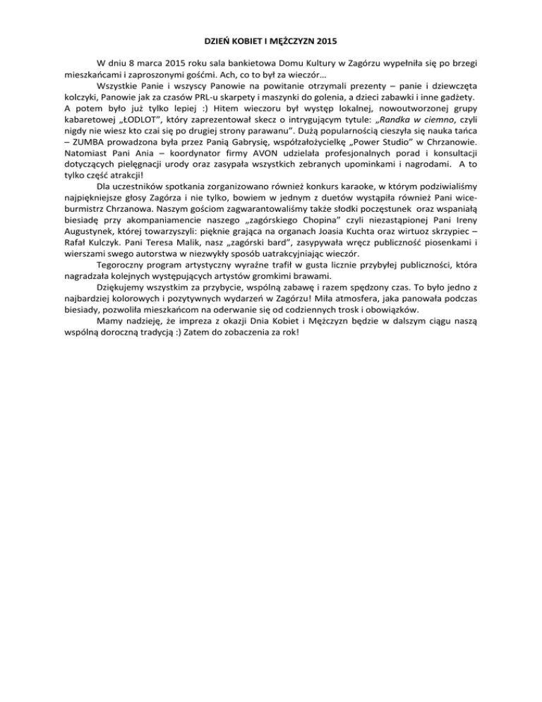 DZIEO KOBIET I MĘŻCZYZN 2015 W dniu 8 marca 2015 roku sala bankietowa Domu Kultury w Zagórzu wypełniła się po brzegi mieszkaocami i zaproszonymi gośdmi. Ach, co to był za wieczór… Wszystkie Panie i wszyscy Panowie na powitanie otrzymali prezenty – panie i dziewczęta kolczyki, Panowie jak za czasów PRL-u skarpety i maszynki do golenia, a dzieci zabawki i inne gadżety. A potem było już tylko lepiej :) Hitem wieczoru był występ lokalnej, nowoutworzonej grupy kabaretowej „ŁODLOT”, który zaprezentował skecz o intrygującym tytule: „Randka w ciemno, czyli nigdy nie wiesz kto czai się po drugiej strony parawanu”. Dużą popularnością cieszyła się nauka taoca – ZUMBA prowadzona była przez Panią Gabrysię, współzałożycielkę „Power Studio” w Chrzanowie. Natomiast Pani Ania – koordynator firmy AVON udzielała profesjonalnych porad i konsultacji dotyczących pielęgnacji urody oraz zasypała wszystkich zebranych upominkami i nagrodami. A to tylko częśd atrakcji! Dla uczestników spotkania zorganizowano również konkurs karaoke, w którym podziwialiśmy najpiękniejsze głosy Zagórza i nie tylko, bowiem w jednym z duetów wystąpiła również Pani wiceburmistrz Chrzanowa. Naszym gościom zagwarantowaliśmy także słodki poczęstunek oraz wspaniałą biesiadę przy akompaniamencie naszego „zagórskiego Chopina” czyli niezastąpionej Pani Ireny Augustynek, której towarzyszyli: pięknie grająca na organach Joasia Kuchta oraz wirtuoz skrzypiec – Rafał Kulczyk. Pani Teresa Malik, nasz „zagórski bard”, zasypywała wręcz publicznośd piosenkami i wierszami swego autorstwa w niezwykły sposób uatrakcyjniając wieczór. Tegoroczny program artystyczny wyraźne trafił w gusta licznie przybyłej publiczności, która nagradzała kolejnych występujących artystów gromkimi brawami. Dziękujemy wszystkim za przybycie, wspólną zabawę i razem spędzony czas. To było jedno z najbardziej kolorowych i pozytywnych wydarzeo w Zagórzu! Miła atmosfera, jaka panowała podczas biesiady, pozwoliła mieszkaocom na oderwanie się od codziennych trosk i obowiązków. Mamy nadzieję, że impreza z okazji Dnia Kobiet i Mężczyzn będzie w dalszym ciągu naszą wspólną doroczną tradycją :) Zatem do zobaczenia za rok!