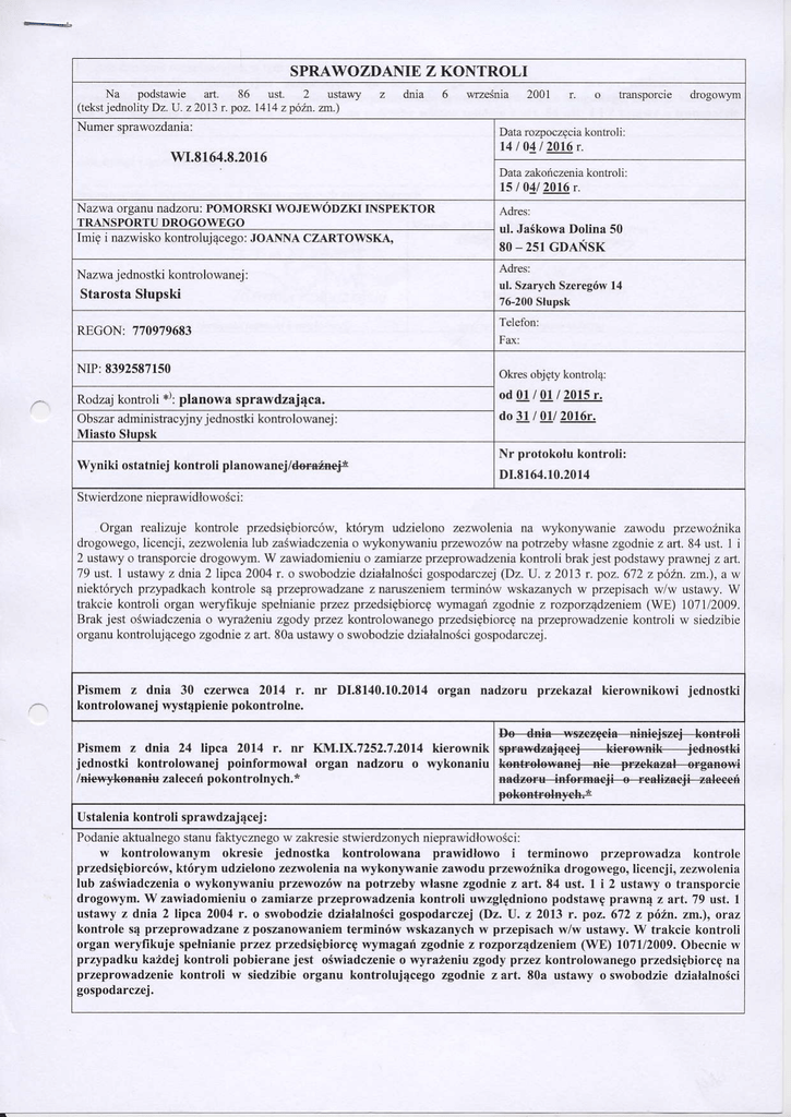 2 ustawyo transporciedrogow}'m.w zawiadomi€niu o famiarze przeprovadzenia kontroli brakjest podstawyprawnejz art'