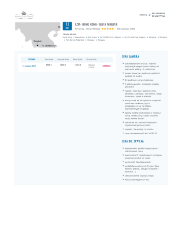801 08 08 03 22 492 77 90 Infolinia 13 AZJA- HONG KONG- SILVER WHISPER DNI Silversea - Silver Whisper | Rok budowy: 2001 TRASA REJSU: Hong Kong Hong Kong Koh Samui (Tajlandia) TERMIN 11 marzec 2017 Nha Trang Singapur Vista Suite Veranda Suite Silver Suite Grand Suite 5445 € 6885 € 13365 € Zapytaj o cenę Ho Chi Minh City (Sajgon) Ho Chi Minh City (Sajgon) Bangkok Bangkok Singapur CENA ZAWIERA ZAMÓW > zakwaterowanie w 2-os. kabinie wybranej kategorii (cena zależy od położenia kabiny na pokładzie) serwis bagażowy podczas wejścia i zejścia ze statku 24-godzinny serwis kabinowy 3 główne posiłki, przekąski między posiłkami napoje: open bar: wybrane wina, alkohole, szampan, soft drinks, woda mineralna, barek w kabinie korzystanie ze wszystkich urządzeń sportowo – rekreacyjnych znajdujących się na statku (wymienionych w opisie) sporty wodne: nurkowanie z maską i rurką, windsurfing, kajaki morskie, narty wodne, banan udział we wszystkich imprezach organizowanych na statku napiwki dla obsługi na statku. ceny aktualne na dzień 14.06.16 CENA NIE ZAWIERA dojazdu do/z portów rozpoczęcia i zakończenia rejsu ewentualnych dodatkowych noclegów przed rejsem lub po rejsie wycieczek fakultatywnych wydatków osobistych (fryzjer, Spa, telefon, pralnia, zakupy w barach i butikach...) ubezpieczenia turystycznego kosztu wymaganych wiz.