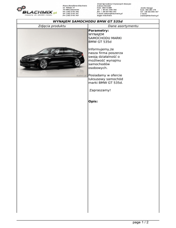WYNAJEM SAMOCHODU BMW GT 535d Zdjęcia produktu Dane asortymentu Parametry: WYNAJEM SAMOCHODU MARKI BMW GT 535d Informujemy,że nasza firma poszerza swoją działalność o możliwość wynajmu samochodów osobowych. Posiadamy w ofercie luksusowy samochód marki BMW GT 535d. Zapraszamy! Opis: page 1 / 2 page 2 / 2 Powered by TCPDF (www.tcpdf.org)