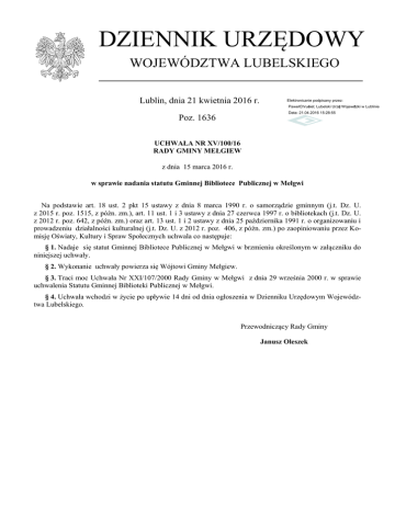 DZIENNIK URZĘDOWY WOJEWÓDZTWA LUBELSKIEGO Lublin, dnia 21 kwietnia 2016 r. Elektronicznie podpisany przez: Paweł Chruściel; Lubelski Urząd Wojewódzki w Lublinie Data: 21.04.2016 15:28:55 Poz. 1636 UCHWAŁA NR XV/100/16 RADY GMINY MEŁGIEW z dnia 15 marca 2016 r. w sprawie nadania statutu Gminnej Bibliotece Publicznej w Mełgwi Na podstawie art. 18 ust. 2 pkt 15 ustawy z dnia 8 marca 1990 r. o samorządzie gminnym (j.t. Dz. U. z 2015 r. poz. 1515, z późn. zm.), art. 11 ust. 1 i 3 ustawy z dnia 27 czerwca 1997 r. o bibliotekach (j.t. Dz. U. z 2012 r. poz. 642, z późn. zm.) oraz art. 13 ust. 1 i 2 ustawy z dnia 25 października 1991 r. o organizowaniu i prowadzeniu działalności kulturalnej (j.t. Dz. U. z 2012 r. poz. 406, z późn. zm.) po zaopiniowaniu przez Komisję Oświaty, Kultury i Spraw Społecznych uchwala co następuje: § 1. Nadaje się statut Gminnej Bibliotece Publicznej w Mełgwi w brzmieniu określonym w załączniku do niniejszej uchwały. § 2. Wykonanie uchwały powierza się Wójtowi Gminy Mełgiew. § 3. Traci moc Uchwała Nr XXI/107/2000 Rady Gminy w Mełgwi z dnia 29 września 2000 r. w sprawie uchwalenia Statutu Gminnej Biblioteki Publicznej w Mełgwi. § 4. Uchwała wchodzi w życie po upływie 14 dni od dnia ogłoszenia w Dzienniku Urzędowym Województwa Lubelskiego. Przewodniczący Rady Gminy Janusz Oleszek Dziennik Urzędowy Województwa Lubelskiego –2– Poz. 1636 Załącznik do Uchwały Nr XV/100/16 Rady Gminy Mełgiew z dnia 15 marca.2016 r. STATUT GMINNEJ BIBLIOTEKI PUBLICZNEJ W MEŁGWI Rozdział 1. Postanowienia ogólne §1 Gminna Biblioteka Publiczna w Mełgwi zwana dalej Biblioteką działa na podstawie obowiązującego prawa i niniejszego Statutu. §2 Biblioteka jest samorządową instytucją kultury, którą prowadzi Organizator. Organizatorem Biblioteki jest Gmina Mełgiew. Bezpośredni nadzór nad Biblioteką sprawuje Wójt Gminy. Nadzór merytoryczny nad Biblioteką – wchodzącą w skład ogólnokrajowej sieci bibliotecznej sprawuje Biblioteka Powiatowa w Świdniku i Biblioteka Wojewódzka w Lublinie. 5. Przy Bibliotece działa Izba Pamiątek Regionalnych mieszcząca się w budynku parafialnym w Mełgwi przy ul. Kościelnej 14. §3 1. 2. 3. 4. Biblioteka posiada osobowość prawną i jest wpisana do rejestru instytucji kultury prowadzonego przez Organizatora. §4 Siedzibą Biblioteki jest Mełgiew, a terenem działania obszar całej Gminy. §5 Biblioteka używa pieczęci prostokątnej w brzmieniu GMINNA BIBLIOTEKA PUBLICZNA W MEŁGWI oraz owalnej do identyfikacji zbiorów o treści GMINNA BIBLIOTEKA PUBLICZNA W MEŁGWI. Rozdział 2. Cele i zadania biblioteki §6 1. Biblioteka jest główną biblioteką publiczną na terenie Gminy. 2. Biblioteka służy rozwijaniu i zaspokajaniu potrzeb czytelniczych, informacyjnych mieszkańców Gminy, upowszechnieniu wiedzy i nauki, rozwojowi kultury, dba o sprawne funkcjonowanie sieci bibliotecznej na terenie Gminy. §7 Do podstawowych zadań Biblioteki należy: 1. Gromadzenie, opracowywanie, przechowywanie i konserwacja zbiorów bibliotecznych z uwzględnieniem materiałów dotyczących własnego regionu. 2. Udostępnienie zbiorów na miejscu, wypożyczenie do domu, prowadzenie wypożyczeń międzybibliotecznych z uwzględnieniem potrzeb młodzieży uczącej się. 3. Prowadzenie działalności informacyjnej oraz popularyzacja książki i czytelnictwa. 1 Dziennik Urzędowy Województwa Lubelskiego –3– Poz. 1636 4. Sprawowanie nadzoru nad filiami bibliotecznymi w gminie, udzielenie ich personelowi pomocy organizacyjnej i merytorycznej. 5. Współdziałanie z bibliotekami innych sieci, szkołami, instytucjami kultury i organizacjami w rozwijaniu i zaspokajaniu potrzeb oświatowych i kulturalnych społeczności lokalnej. 6. Tworzenie i udostępnianie własnych komputerowych baz danych, katalogowych, bibliograficznych. 7. Opracowanie i prowadzenie form pracy z czytelnikiem służącym popularyzowaniu sztuki, nauki oraz upowszechnieniu dorobku kulturalnego na miejscu w czytelni biblioteki. 8. Analizowanie potrzeb czytelniczych, doskonalenie form i metod pracy bibliotecznej. 9. Biblioteka może też podejmować inne działania wynikające z potrzeb czytelnictwa. Rozdział 3. Zarządzanie i organizacja §8 1. Na czele Biblioteki stoi Kierownik, który kieruje jej działalnością i reprezentuje ją na zewnątrz. 2. Kierownika Biblioteki powołuje i odwołuje Wójt Gminy. 3. Kierownik Biblioteki za zgodą Wójta Gminy Mełgiew może tworzyć na terenie gminy filie lub oddziały Biblioteki. 4. Organizację wewnętrzną Biblioteki określa regulamin organizacyjny nadawany przez Kierownika Biblioteki. 5. Kierownik może powołać Gminną Radę Biblioteczną jako organ o charakterze doradczo opiniodawczym. §9 1. W bibliotece mogą być zatrudniani pracownicy służby bibliotecznej, administracyjnej oraz obsługi. 2. Zatrudnianie i zwalnianie pracowników należy do zakresu działań Kierownika. § 10 1. W skład Biblioteki wchodzą Filie w Krępcu i Krzesimowie. 2. Zakres działalności filii bibliotecznych jest zgodny z zakresem działań Biblioteki określonym w § 7. niniejszego statutu. § 11 Przy Bibliotece i jej Filiach mogą działać Koła Przyjaciół Biblioteki, towarzystwa i fundacje – zgodnie z obowiązującymi przepisami. Rozdział 4. Gospodarka finansowa Biblioteki § 12 1. Biblioteka gospodaruje samodzielnie przydzieloną i nabytą częścią mienia oraz prowadzi gospodarkę finansową w ramach posiadanych środków zgodnie z obowiązującymi przepisami prawa 2. Podstawą gospodarki finansowej Biblioteki jest roczny plan finansowy. 2 Dziennik Urzędowy Województwa Lubelskiego –4– Poz. 1636 3. Środki finansowe na działalność Biblioteki pochodzą w szczególności z budżetu Gminy, środków otrzymanych od osób prawnych i fizycznych oraz z innych źródeł. § 13 Biblioteka może prowadzić działalność gospodarczą wykraczającą poza szeroko rozumianą działalność kulturalną,