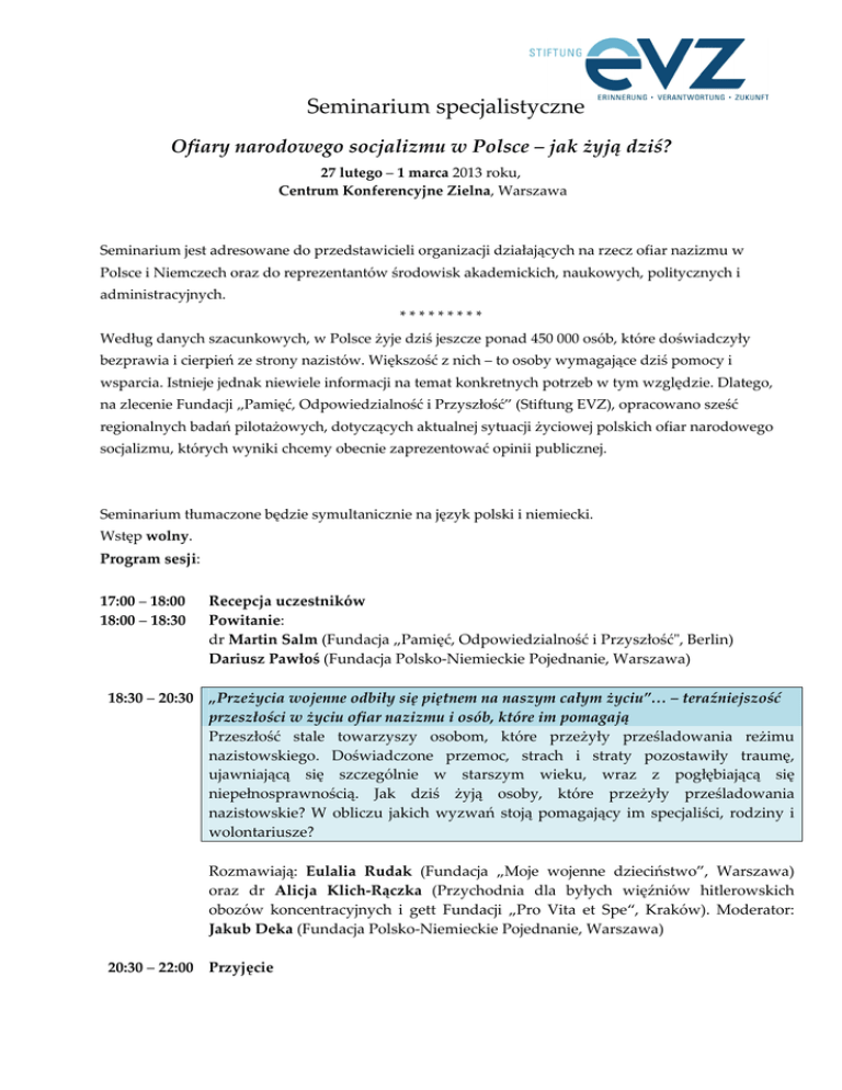 Seminarium specjalistyczne Ofiary narodowego socjalizmu w Polsce – jak żyją dziś? 27 lutego – 1 marca 2013 roku, Centrum Konferencyjne Zielna, Warszawa Seminarium jest adresowane do przedstawicieli organizacji działających na rzecz ofiar nazizmu w Polsce i Niemczech oraz do reprezentantów środowisk akademickich, naukowych, politycznych i administracyjnych. ********* Według danych szacunkowych, w Polsce żyje dziś jeszcze ponad 450 000 osób, które doświadczyły bezprawia i cierpień ze strony nazistów. Większość z nich – to osoby wymagające dziś pomocy i wsparcia. Istnieje jednak niewiele informacji na temat konkretnych potrzeb w tym względzie. Dlatego, na zlecenie Fundacji „Pamięć, Odpowiedzialność i Przyszłość” (Stiftung EVZ), opracowano sześć regionalnych badań pilotażowych, dotyczących aktualnej sytuacji życiowej polskich ofiar narodowego socjalizmu, których wyniki chcemy obecnie zaprezentować opinii publicznej. Seminarium tłumaczone będzie symultanicznie na język polski i niemiecki. Wstęp wolny. Program sesji: 17:00 – 18:00 18:00 – 18:30 Recepcja uczestników Powitanie: dr Martin Salm (Fundacja „Pamięć, Odpowiedzialność i Przyszłość", Berlin) Dariusz Pawłoś (Fundacja Polsko-Niemieckie Pojednanie, Warszawa) 18:30 – 20:30 „Przeżycia wojenne odbiły się piętnem na naszym całym życiu”… – teraźniejszość przeszłości w życiu ofiar nazizmu i osób, które im pomagają Przeszłość stale towarzyszy osobom, które przeżyły prześladowania reżimu nazistowskiego. Doświadczone przemoc, strach i straty pozostawiły traumę, ujawniającą się szczególnie w starszym wieku, wraz z pogłębiającą się niepełnosprawnością. Jak dziś żyją osoby, które przeżyły prześladowania nazistowskie? W obliczu jakich wyzwań stoją pomagający im specjaliści, rodziny i wolontariusze? Rozmawiają: Eulalia Rudak (Fundacja „Moje wojenne dzieciństwo”, Warszawa) oraz dr Alicja Klich-Rączka (Przychodnia dla byłych więźniów hitlerowskich obozów koncentracyjnych i gett Fundacji „Pro Vita et Spe“, Kraków). Moderator: Jakub Deka (Fundacja Polsko-Niemieckie Pojednanie, Warszawa) 20:30 – 22:00 Przyjęcie Czwartek, 28 lutego 2013 09:00 – 09:30 Przybycieuczestników Różna sytuacja życiowa ofiar nazizmu w Polsce dzisiaj a) Jakie grupy ofiar nazizmu żyją jeszcze dzisiaj w Polsce? Czym różnią się ich losy i jak objawiają się długotrwałe skutki prześladowań? Dlaczego tak trudno jest podać dzisiaj dokładne dane na temat liczby żyjących dzisiaj jeszcze ofiar nazizmu? b) Jakie są różnice sytuacji życiowych różnych grup ofiar nazizmu? (np. otoczenie rodzinne, sytuacja materialna, różnice między miastem a wsią, status uznania za ofiarę nazizmu) 09:30 – 11:00 Prezentacje wyników badań pilotażowych (prowadzenie: prof. dr Piotr Błędowski) • Ania Kałon, Związek Gmin Wyznaniowych Żydowskich w RP, Kraków • Mateusz Babicki, Związek Romów Polskich z siedzibą w Szczecinku • Marta Kubiszyn, Stowarzyszenie "mali bracia Ubogich", Lublin 11:00 – 11:30 Przerwa 11:30 – 13:00 Dyskusja (prowadzenie: Anja Kräutler, Fundacja „Pamięć, Odpowiedzialność i Przyszłość”) 13:00 – 14:00 Przerwao biadowa Oferty opieki i potrzeba działania na rzecz ofiar nazizmu a) Kto pomaga różnym grupom ofiar nazizmu, gdy potrzebują wsparcia? Jakie propozycje pomocy są szczególnie pożądane? (best practice)? (np. Rodzina, sąsiedzi, organizacje pozarządowe, instytucje państwowe) b) Na czym polega największe zapotrzebowanie na działanie i realne możliwości poprawienia sytuacji życiowej ofiar nazizmu? Jakie oferty wymienionych bestpractice można by przenieść na inne grupy ofiar lub regiony? 14:00 – 15:30 Prezentacje wyników badań pilotażowych (Prowadzenie: prof. dr Piotr Błędowski) • Katarzyna Białobrzeska, Federacja Organizacji Socjalnych Województwa Warmińsko-Mazurskiego FOSa, Olsztyn • Alicja Swatek, Stowarzyszenie EURO CONCRET, Wrocław • Paulina Ożegalska-Piekarz, Samarytańska Federacja Organizacji Pozarządowych, Zakliczyn 15:30 – 16:00 Przerwa 16:00 – 17:00 Dyskusja (Prowadzenie: Elke Braun, Fundacja „Pamięć, Odpowiedzialność i Przyszłość") 17:00 – 17:30 Podsumowanie dnia Piątek, 1 marca 2013 09:00 – 09:30 Przybycie uczestników Prezentacja i dyskusja pomysłów na projekty a) Na jakie potrzeby ma reagować projekt? b) Jakie planuje się działania i jakiego wymagają one personelu? c) Jakie zamierzamy osiągnąć rezultaty? 09:30 – 11:00 Prowadzenie: Elke Braun, Fundacja „Pamięć, Odpowiedzialność i Przyszłość” • Ewa Spaczyńska, Związek Gmin Wyznaniowych Żydowskich w RP, Kraków • Roman Chojnacki, Związek Romów Polskich z siedzibą w Szczecinku • Marta Kubiszyn, Stowarzyszenie "mali bracia Ubogich", Lublin 11:00 – 11:30 Przerwa 11:30 – 13:00 Prowadzenie: Anja Kräutler, Fundacja „Pamięć, Odpowiedzialność i Przyszłość" • Bartłomiej Głuszak, Federacja Organizacji Socjalnych Województwa WarmińskoMazurskiego FOSa, Olsztyn • Alicja Swatek, Stowarzyszenie EURO CONCRET, Wrocław • Barbara Żychowska, Samarytańska Federacja Organizacji Pozarządowych, Zakliczyn 13:00 – 14:00 Ocena /Dyskusja podsumowująca 14:00 – 15:00 Przerwa obiadowa 15:00 – 17:00 Zwiedzanie wystawy „Praca przymusowa. Niemcy, robotnicy przymusowi i wojna.” Miejsce seminarium: Nocleg: Centrum Zielna sala Berlin-Warszawa, budynek C / 5 pietro ul. Zielna 37, 00-108 Warszawa www.centrumzielna.pl Metropol Hotel ul. Marszałkowska 99a 00-693 Warszawa, Polska tel.: +48 22 32 53 100 fax: + 48 22 628 66 22 [email protected] Hotel Metropol